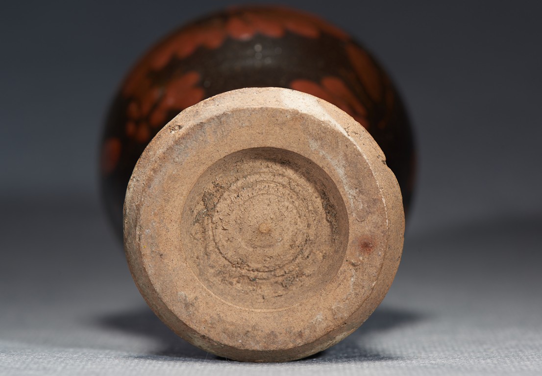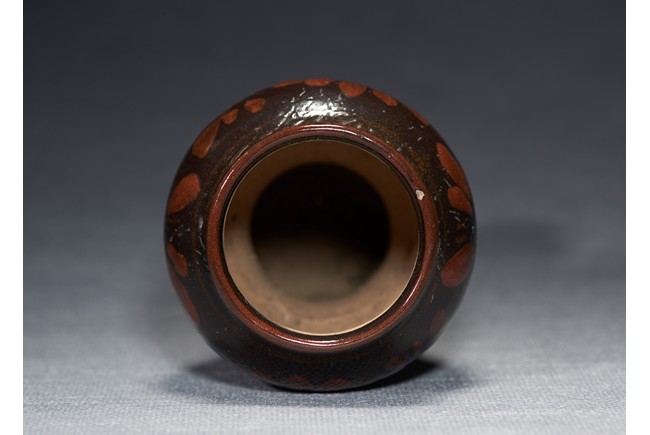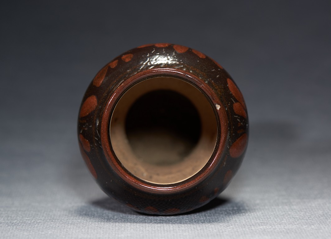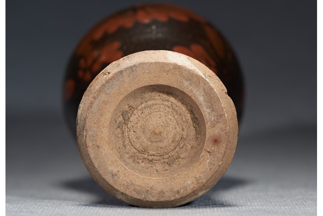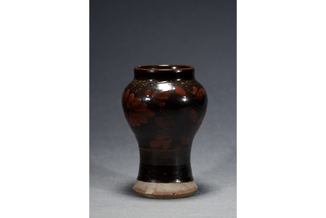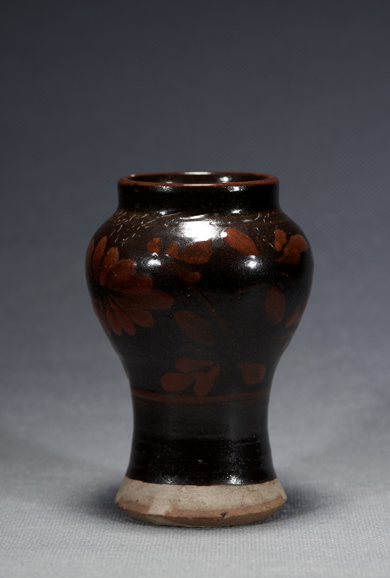 The vase is of high shoulders and spreading foot, overall covered in brown glaze with russet flower pattern, the base unglazed. Qing Dynasty period.