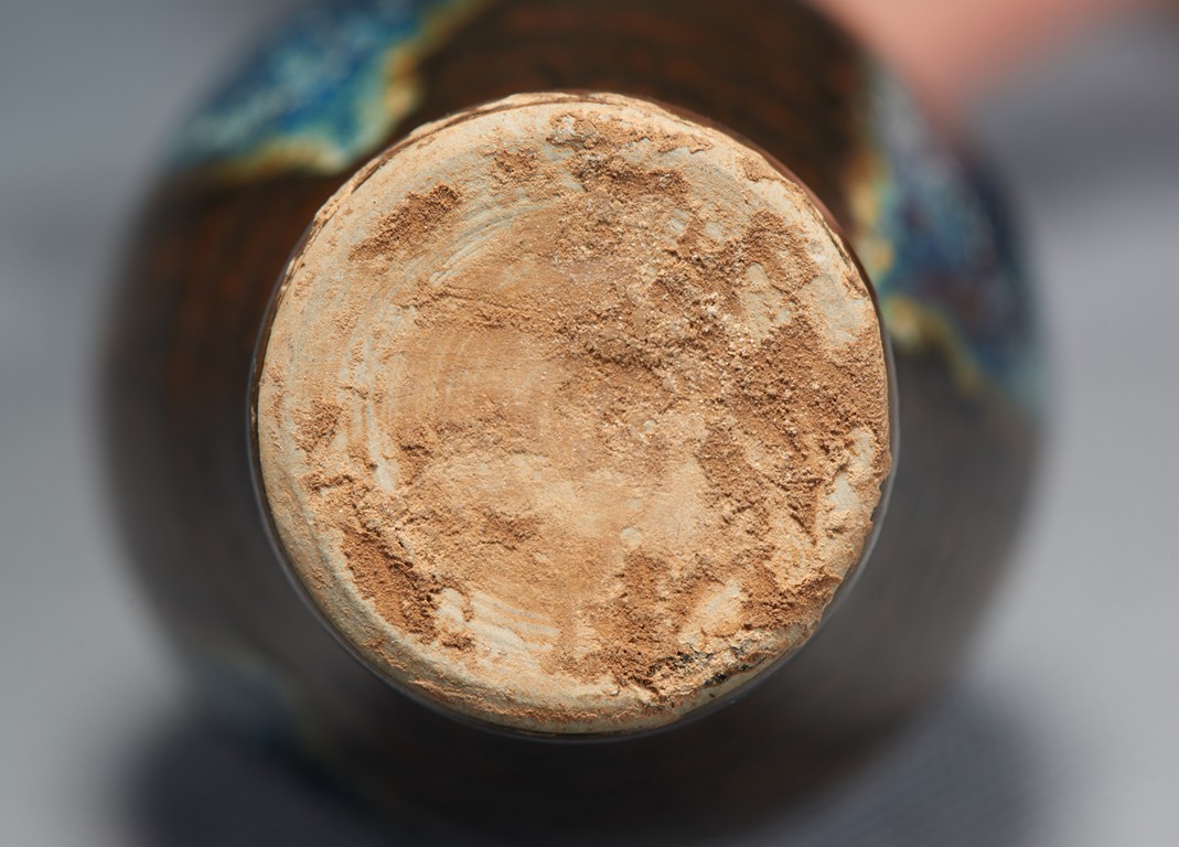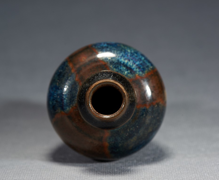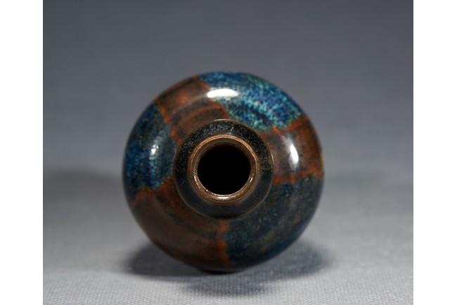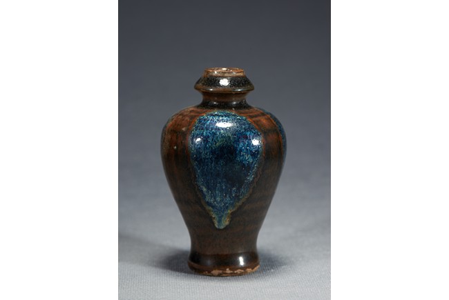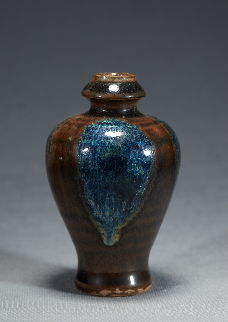 Of high shoulder and rising from spreading foot, the vase is covered with mottle brown and black glaze with each other three large areas of robin-egg blue glaze, the base unglazed. Qing Dynasty period