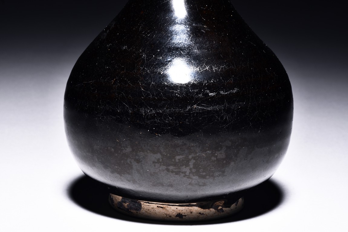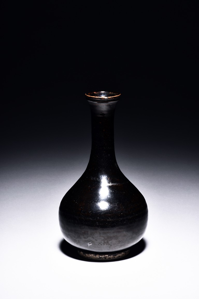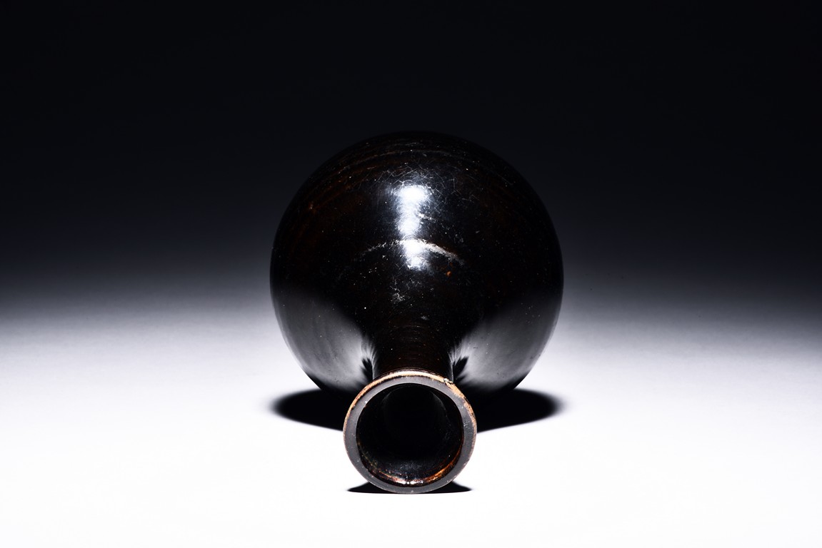 Of pear-shaped, the vase raises from circular foot ring, the body is of compressed globular form and rises to long neck, the exterior is overall glazed in impressive brownish black glaze. The base is unglazed. Song Dynasty period.