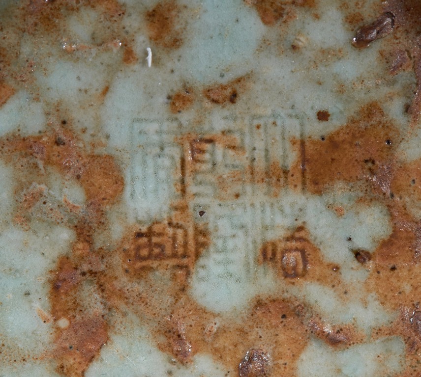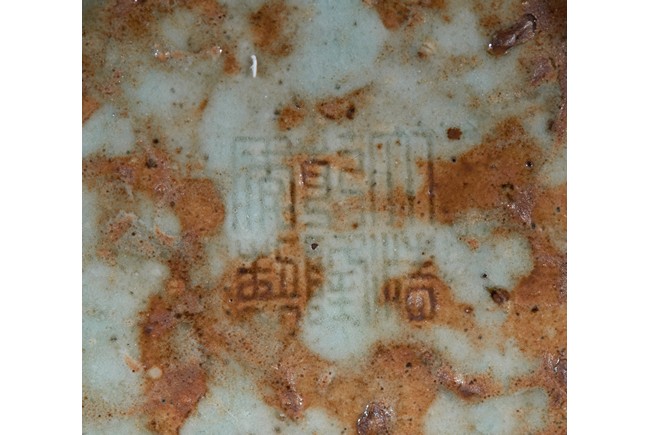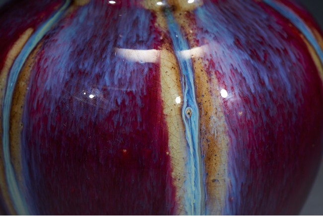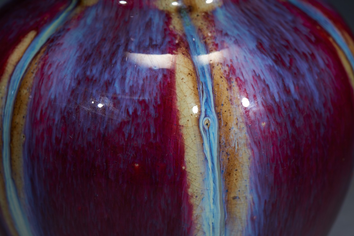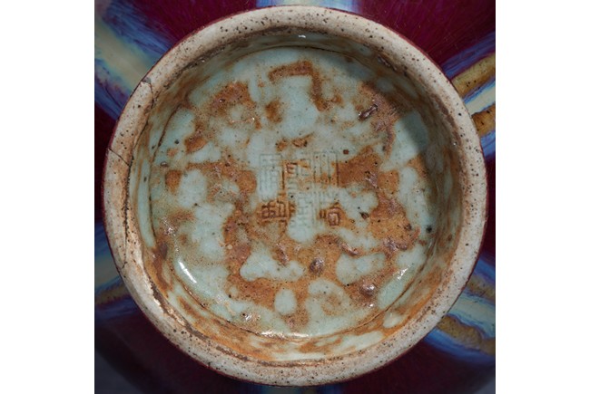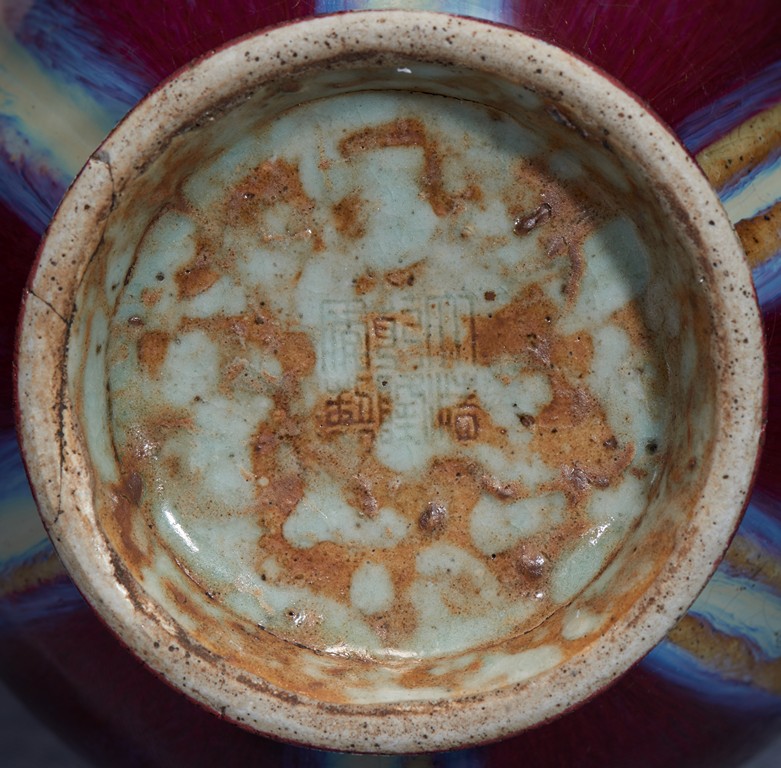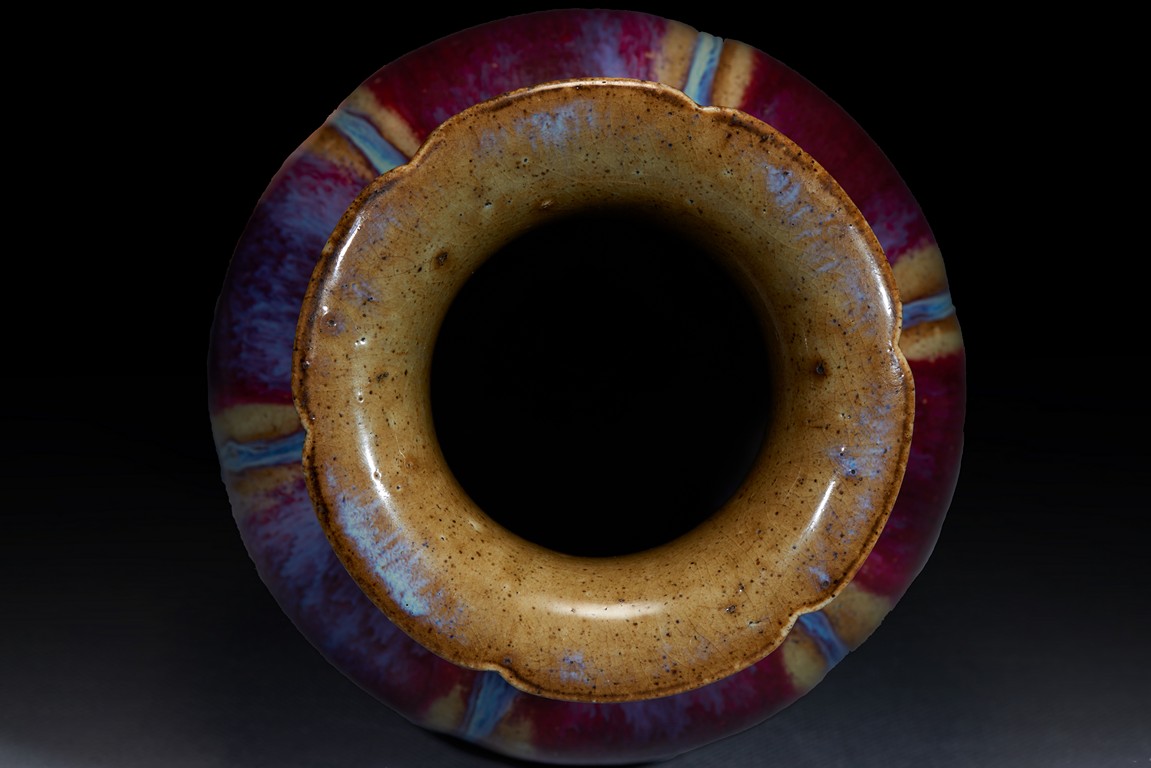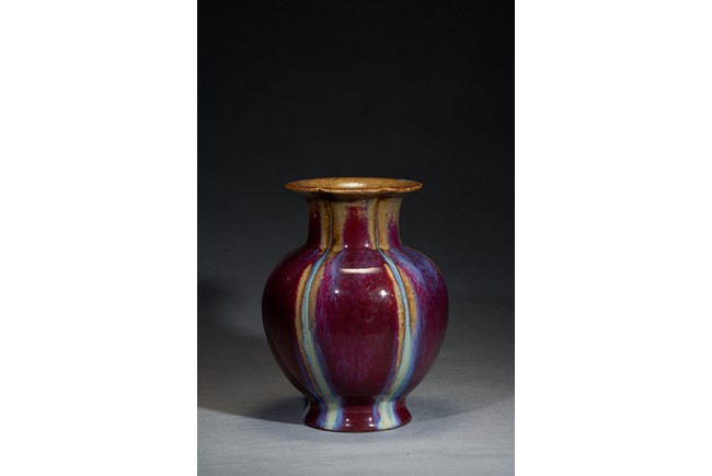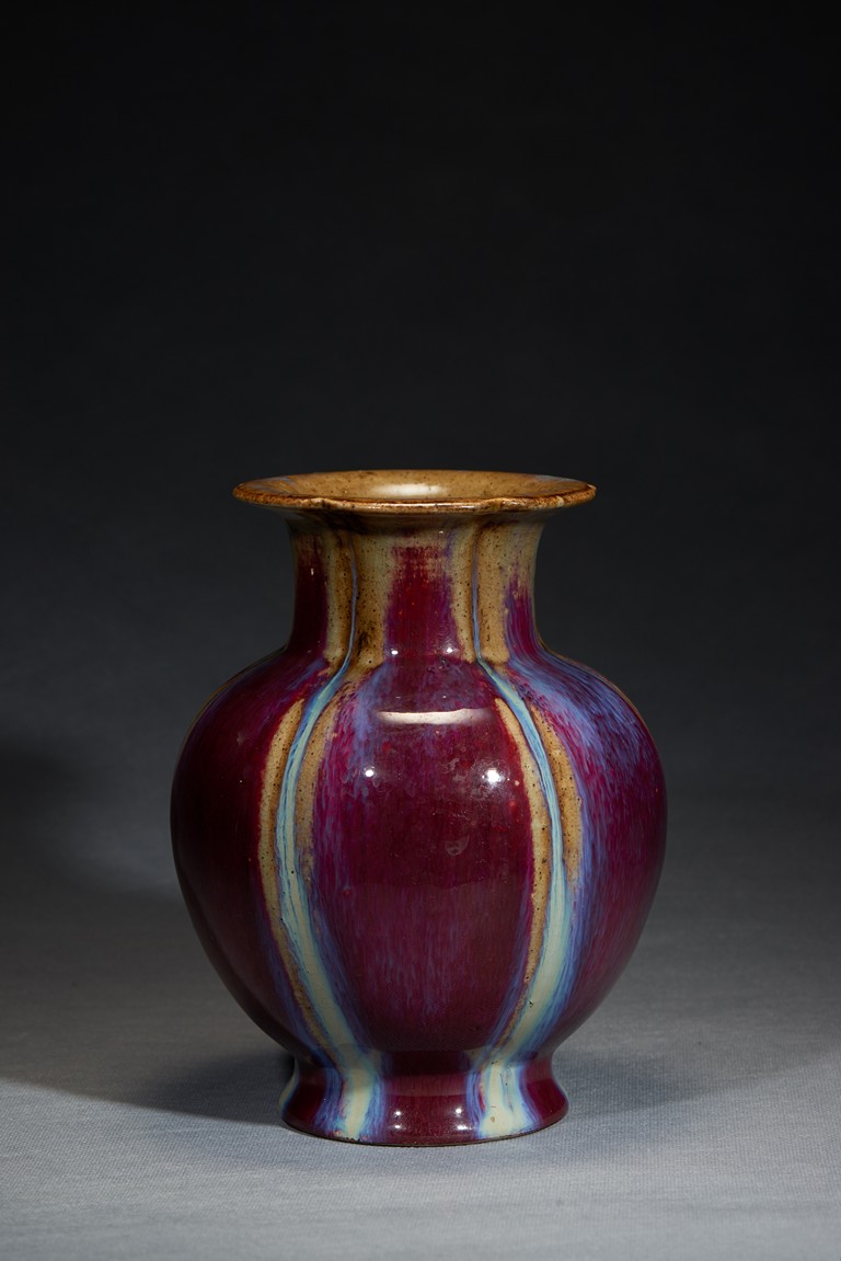 Of hexagonal form, the bulbous body rising from a flared foot to a mouth with six lobes splayed over the slightly waisted neck, covered in attractive cherry red glaze with lavender and russet streaks, the rim and interior glazed in russet tone, the base applied with celadon and russet colored glaze and incised with six character 'QIANLONG' mark. Qing Dynasty period.