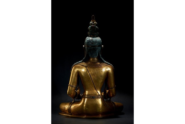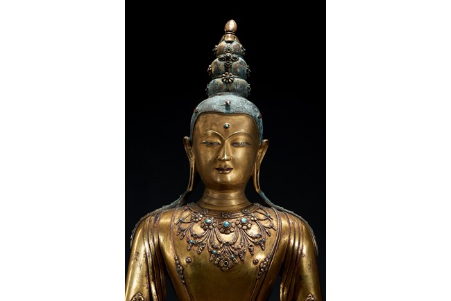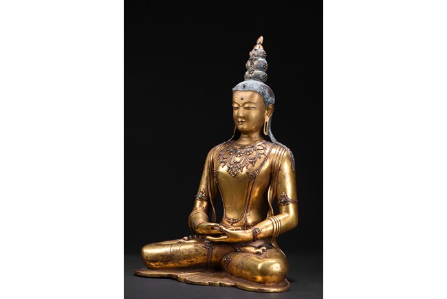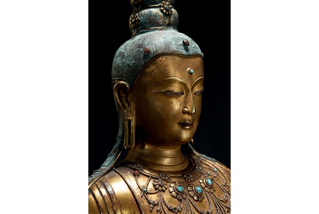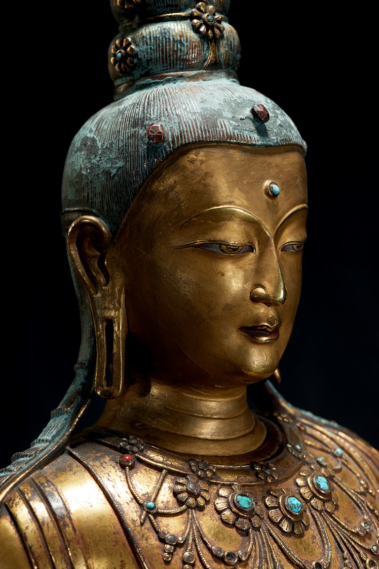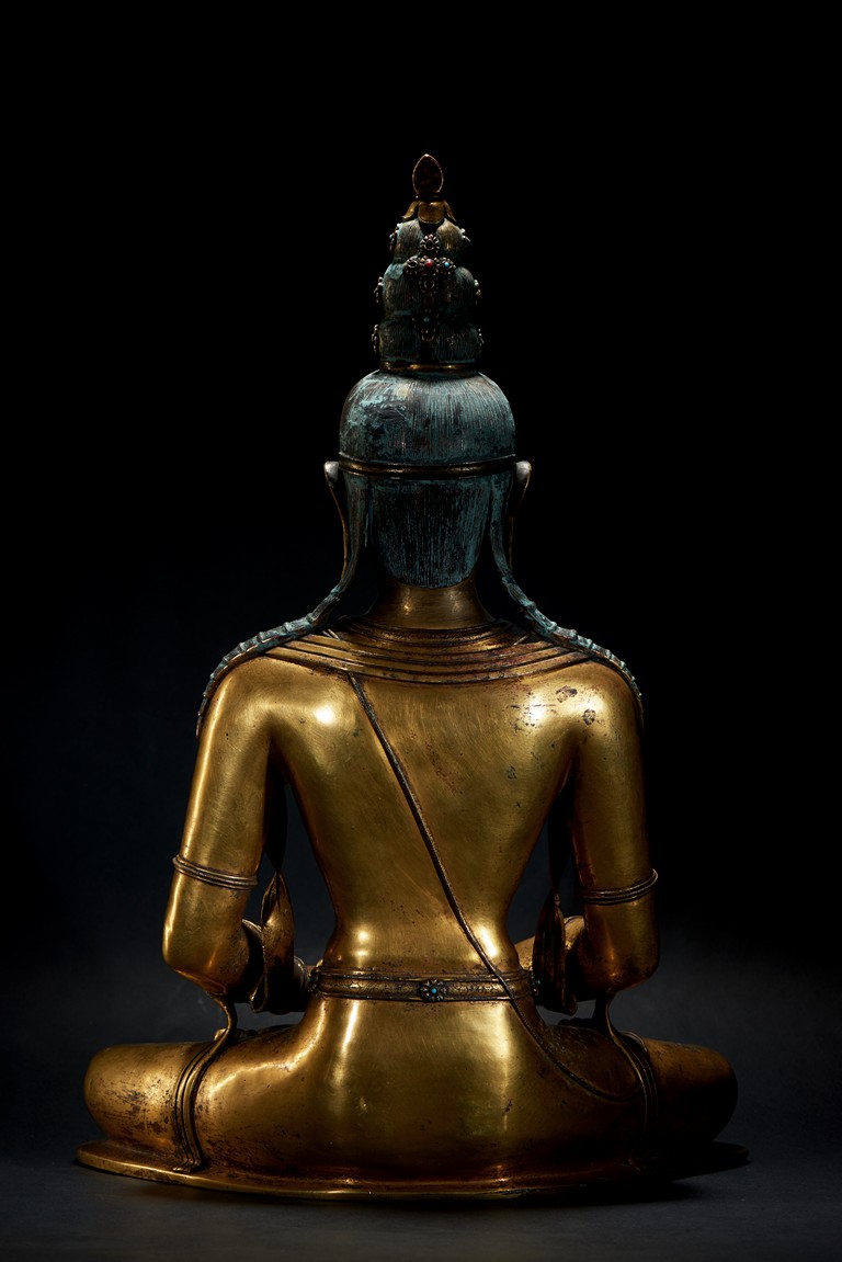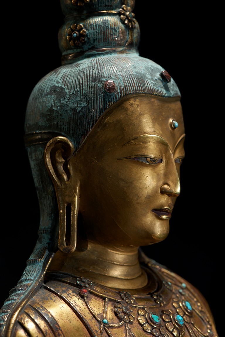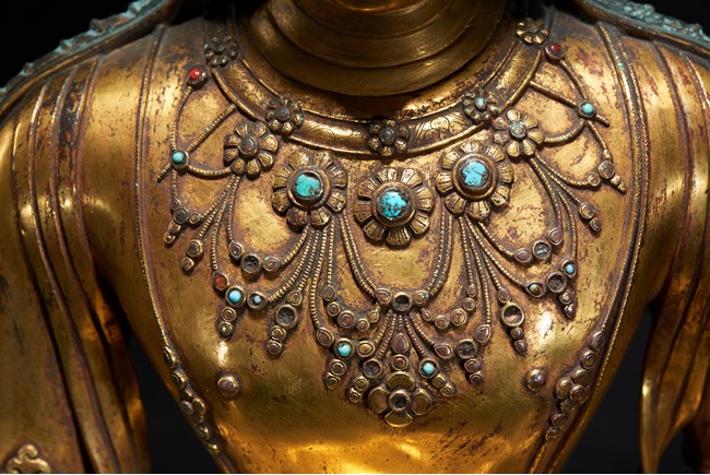 Seated in dhyanasana, with hands folded in dhyanamutra, the bodhisattva is shown wearing a shawl and dhoti, richly adorned with elaborate jewelry inlaid with turquoise and coral beads, with billowing celestial scarf around shoulders and arms, the face with meditative expression, flanked by elongated earlobes, the hair pulled up in a topknot.