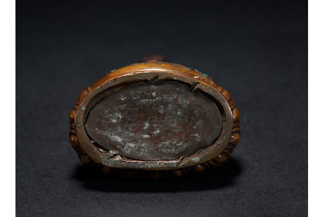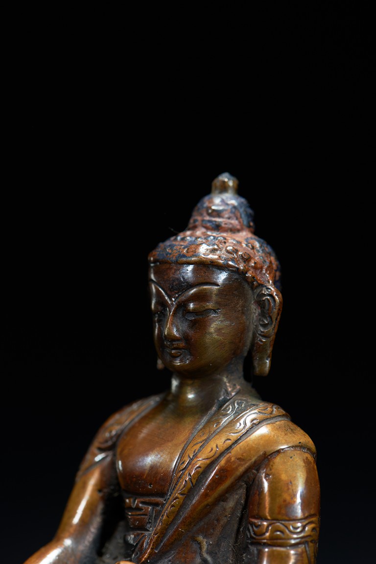 Shown seated upon a lotus throne in dhyanasana, right hand in bhumiparsamudra the other supporting an alms bowl, he has a meditative expression and is dressed in a robe draped over his left shoulder.