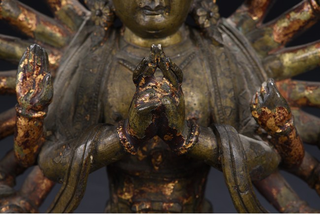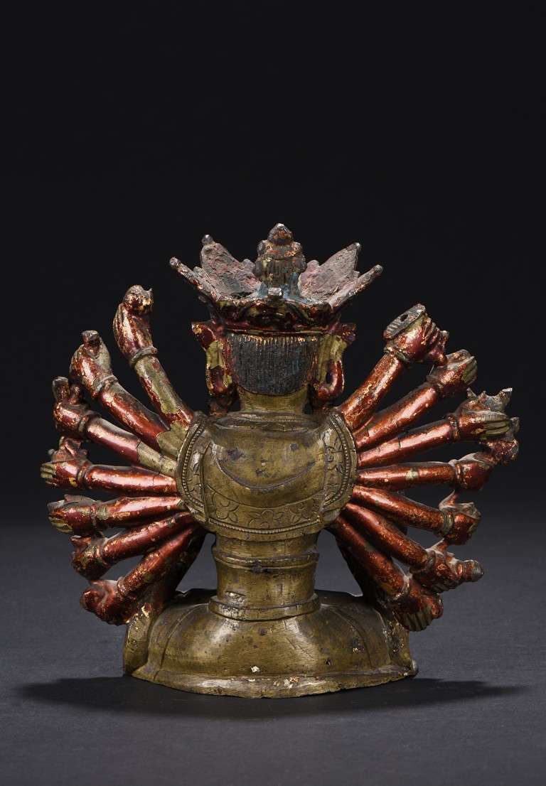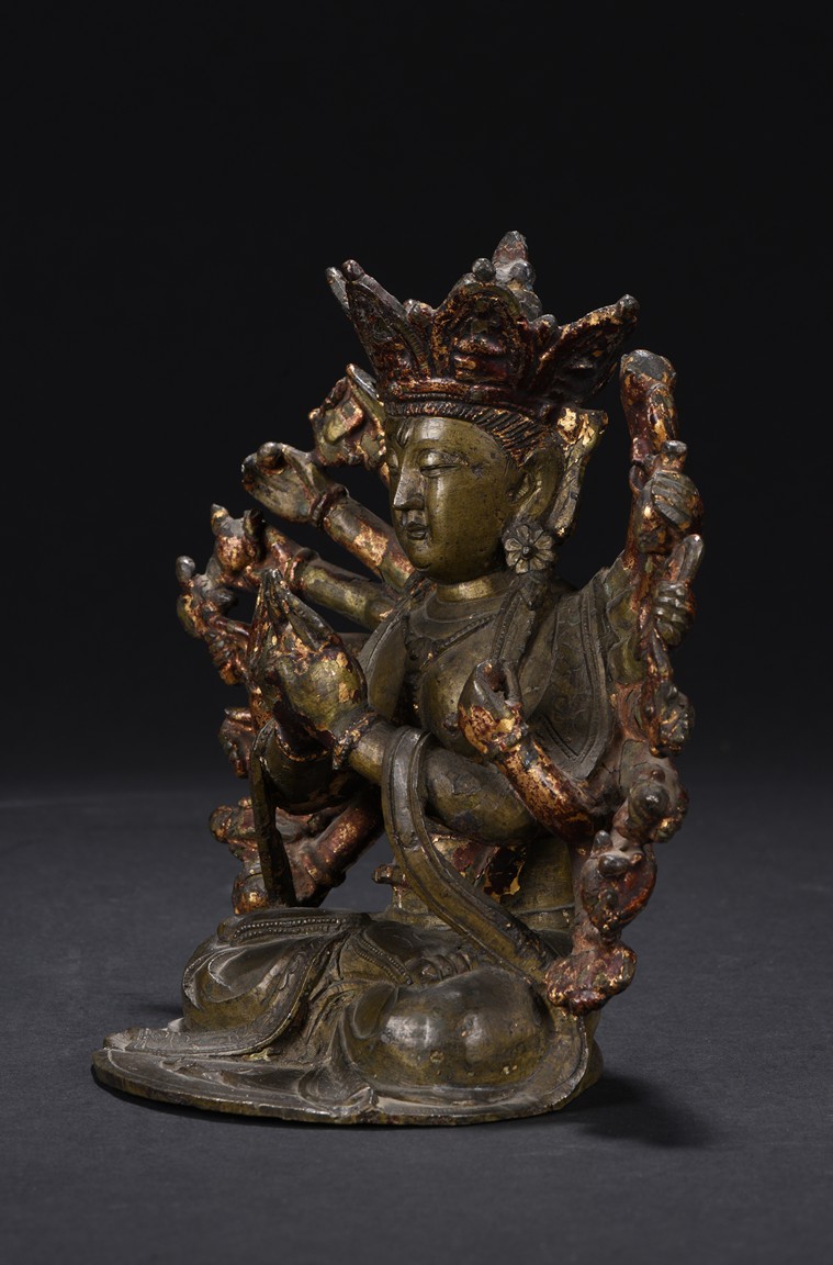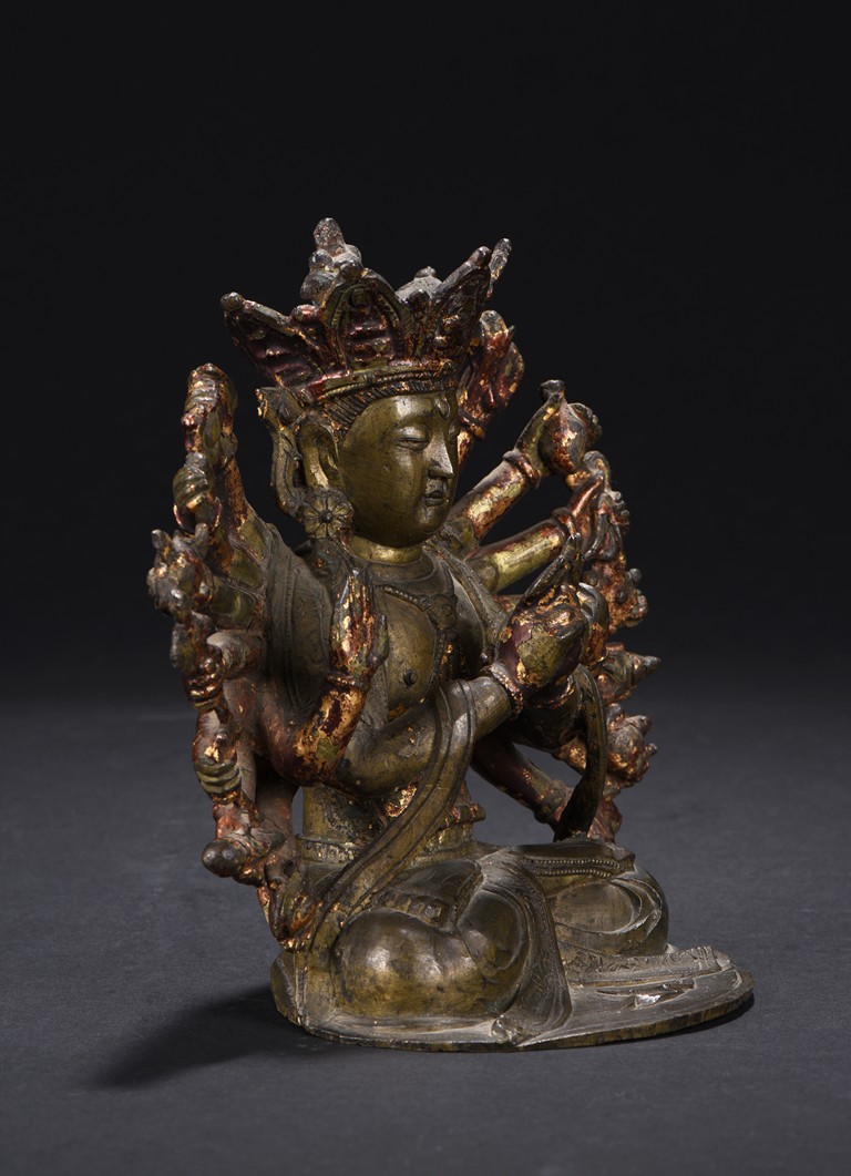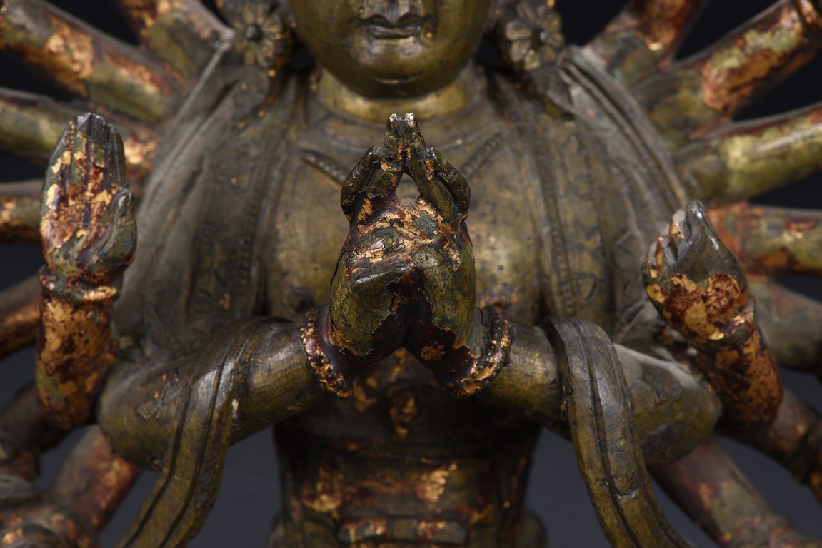 The eighteen-armed bodhisattva seated in dhyanasana, wearing robe incised with floral pattern, with the main pairs of hands together at the front with further pairs of arms radiating out from the body each hand holding a ritual object, the face with meditative expression. The hands and arms are parcel-gilt. Early Qing Dynasty period.