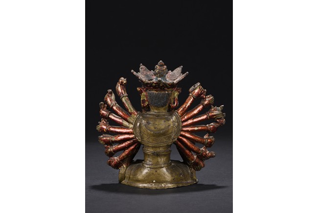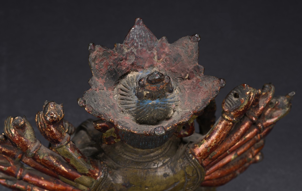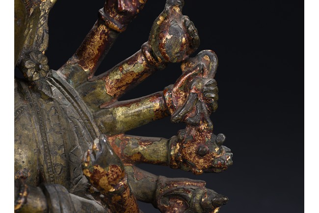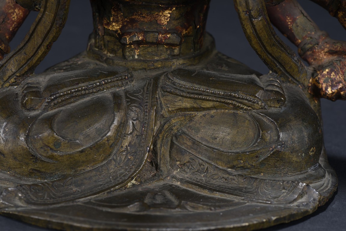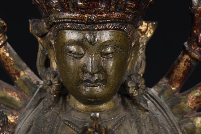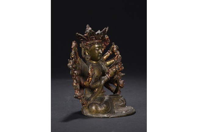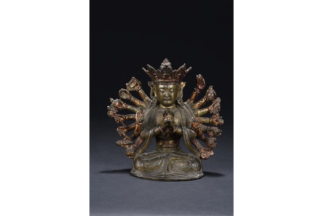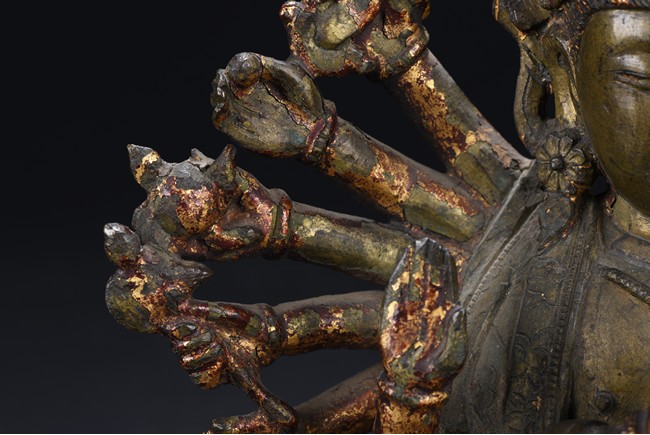 The eighteen-armed bodhisattva seated in dhyanasana, wearing robe incised with floral pattern, with the main pairs of hands together at the front with further pairs of arms radiating out from the body each hand holding a ritual object, the face with meditative expression. The hands and arms are parcel-gilt. Early Qing Dynasty period.