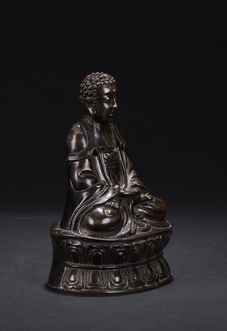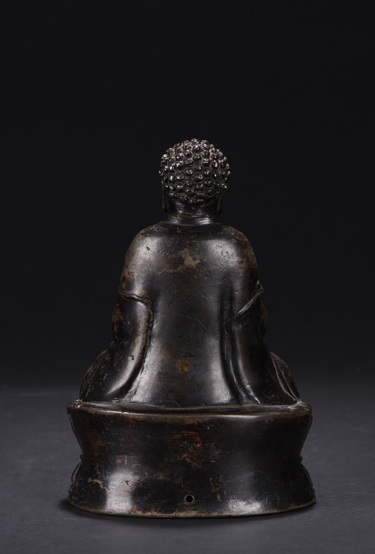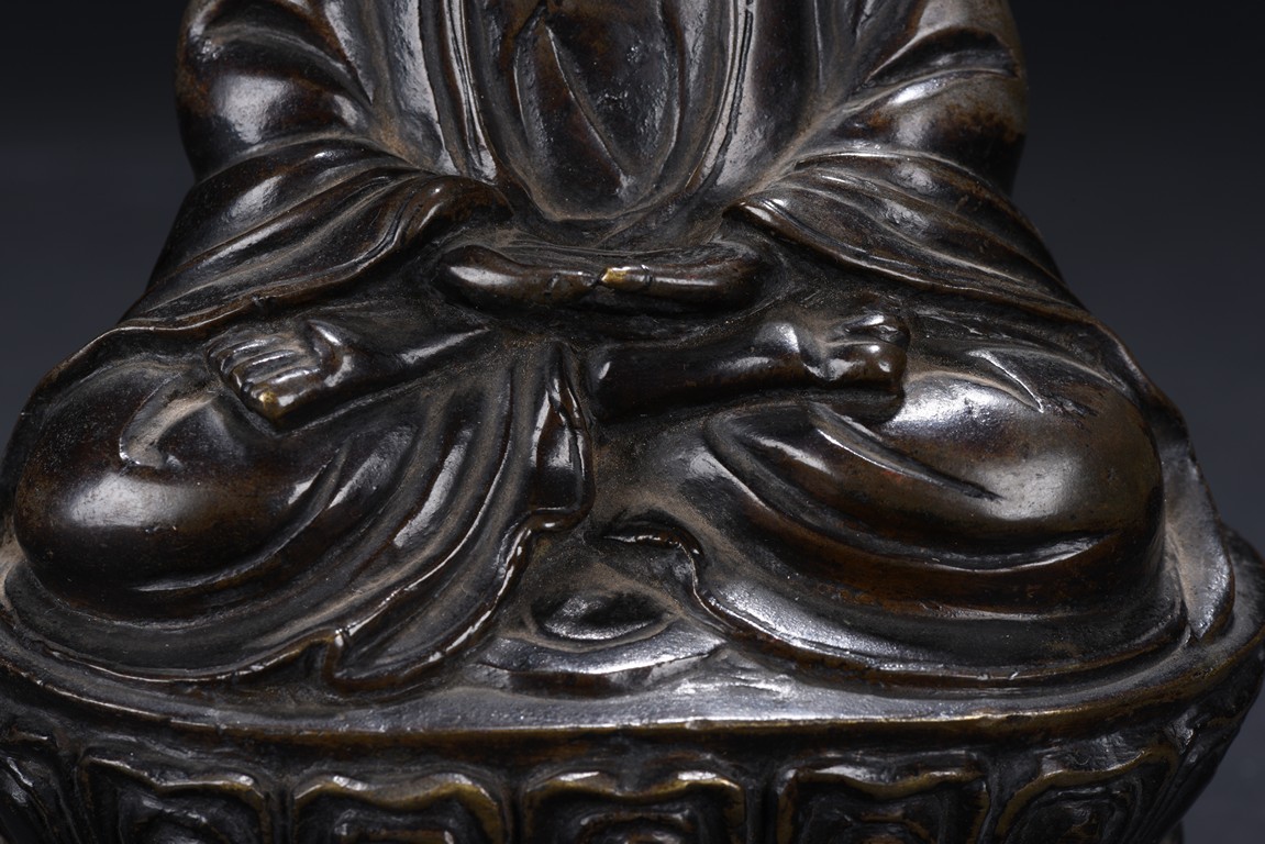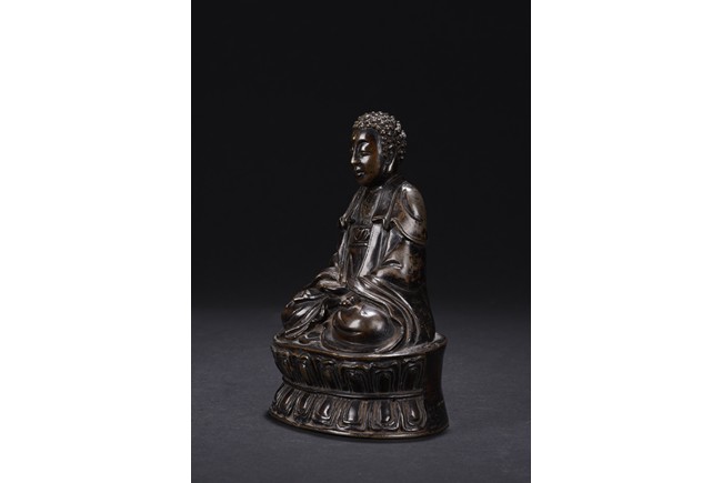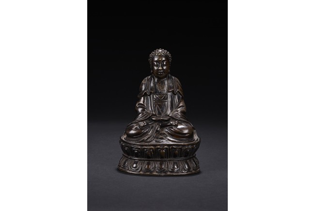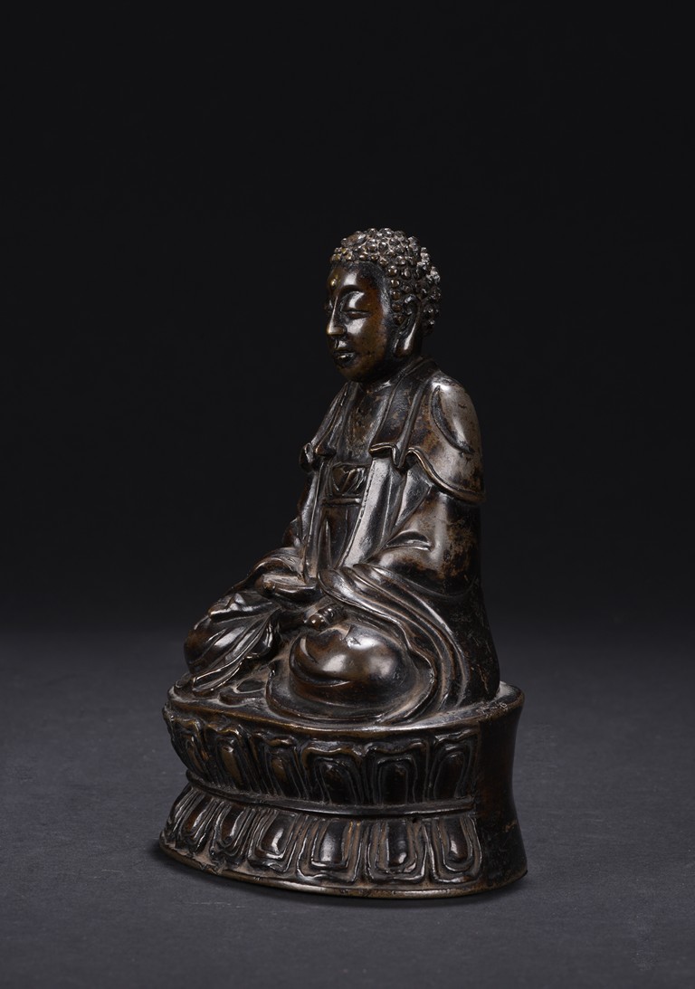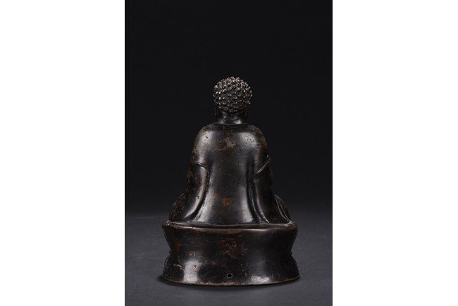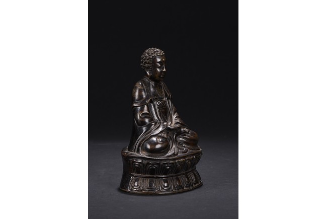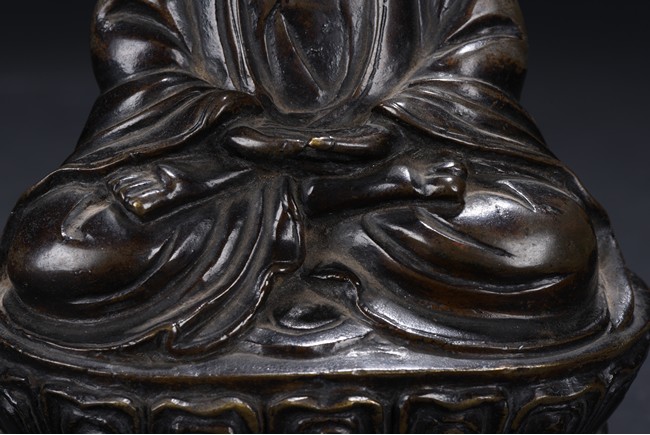 Seated in dhyanasana on a double-lotus base with incised edge, the hands in dhyanamudra, clad in a flowing sanghati with beaded and incised hems draped over both shoulders, face with serene expression. Qing Dynasty period.