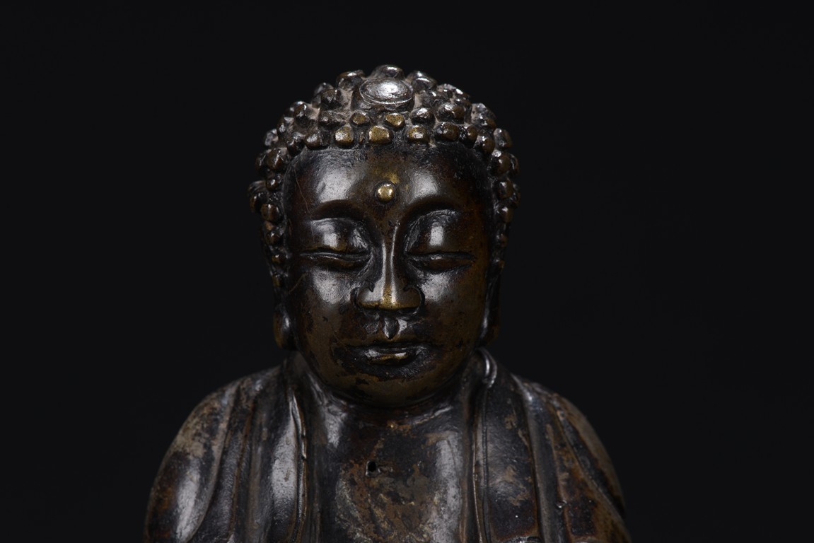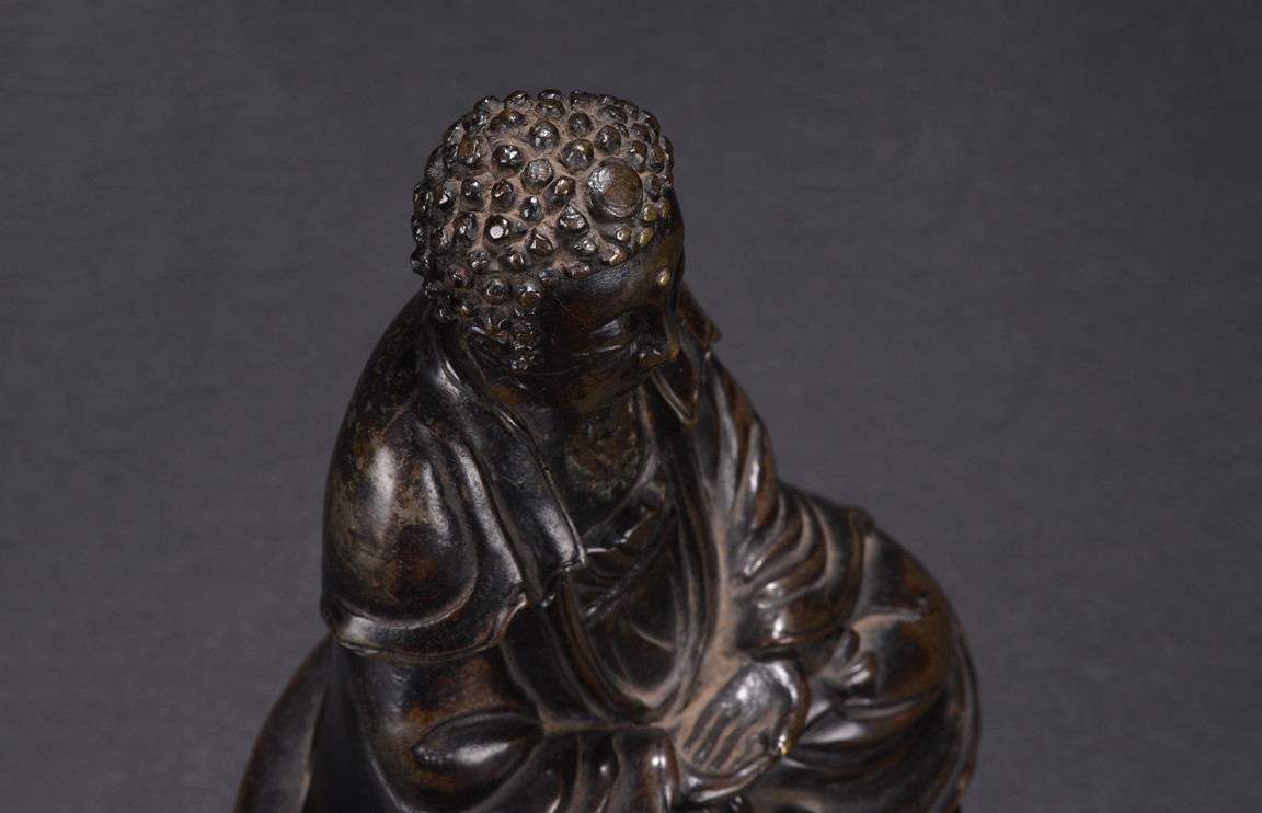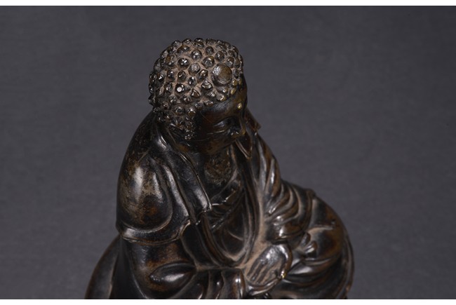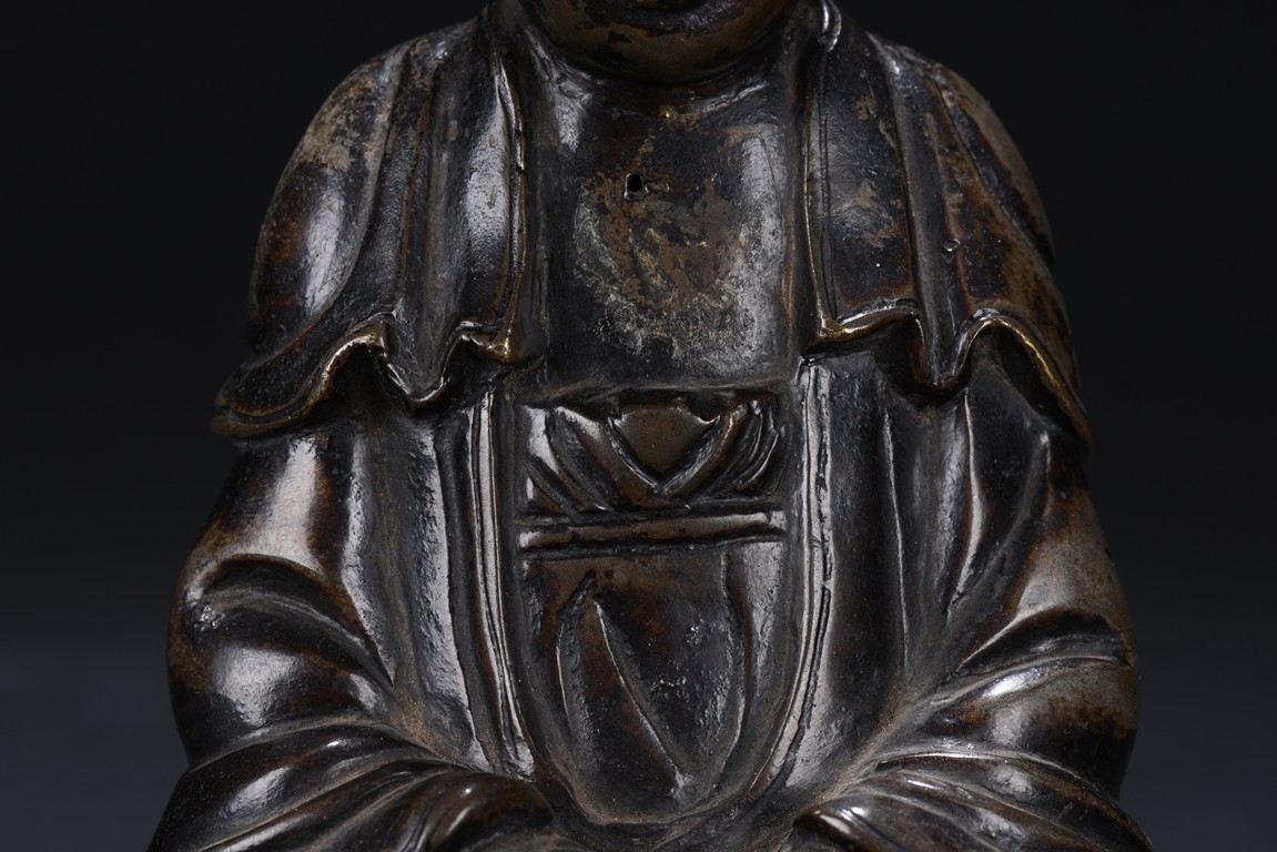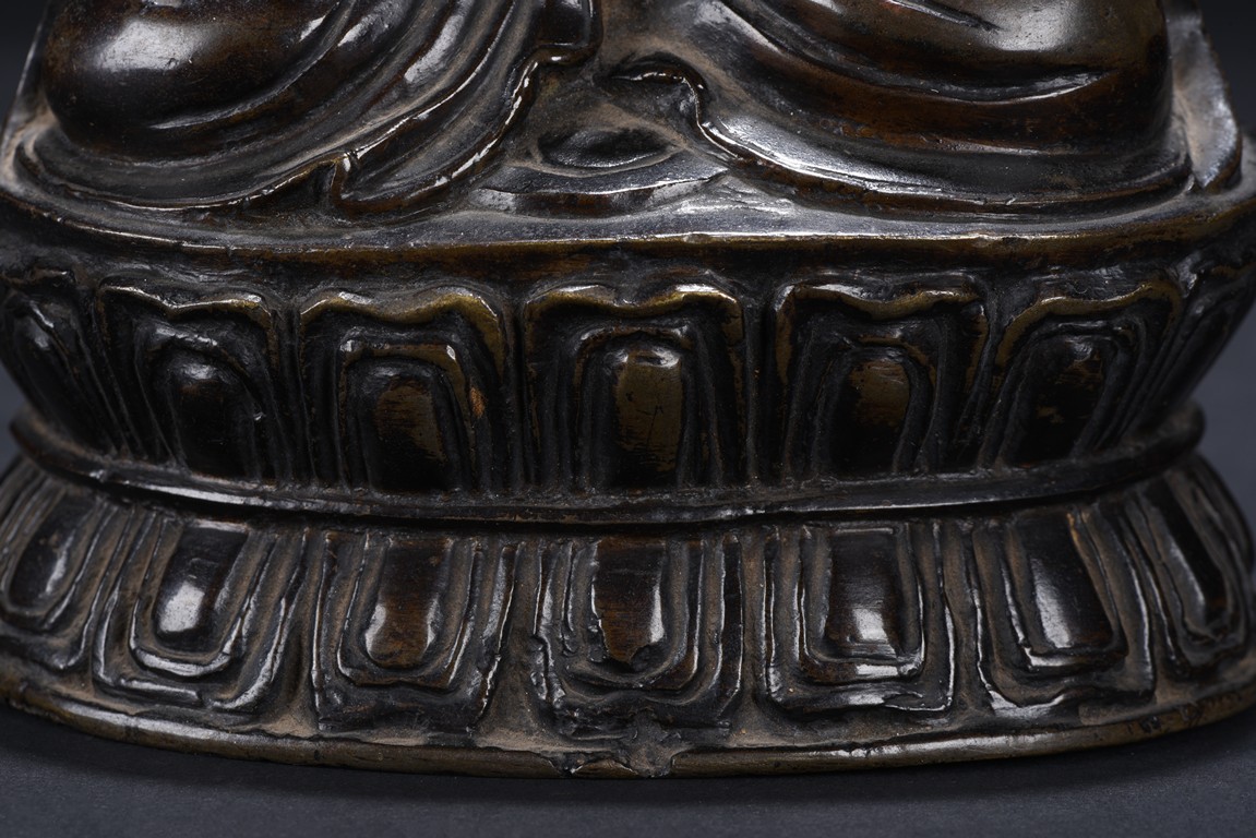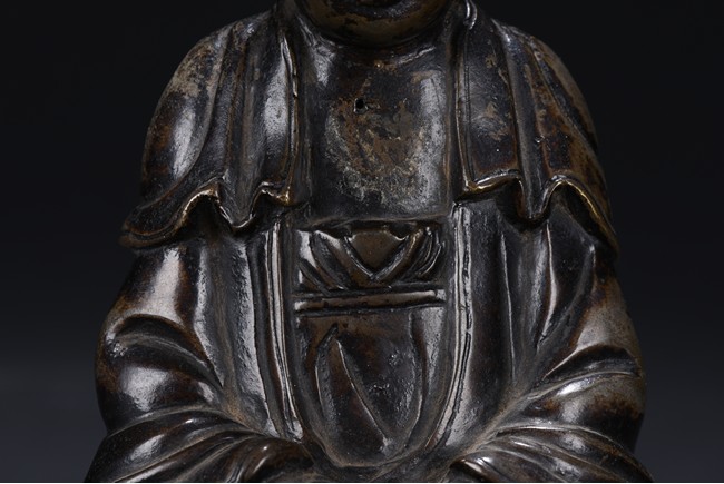 Seated in dhyanasana on a double-lotus base with incised edge, the hands in dhyanamudra, clad in a flowing sanghati with beaded and incised hems draped over both shoulders, face with serene expression. Qing Dynasty period.