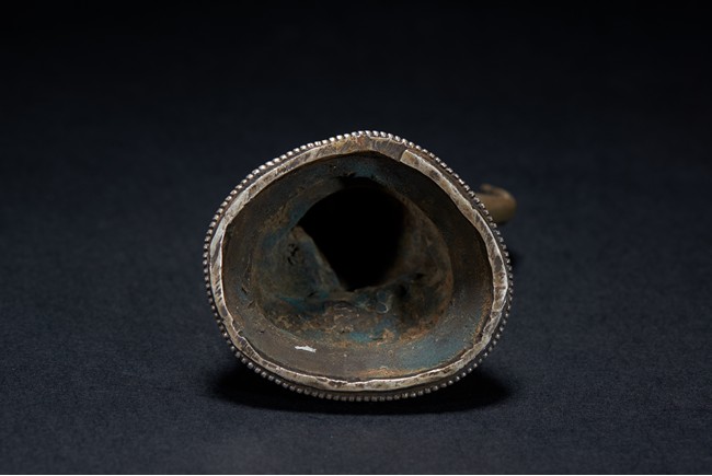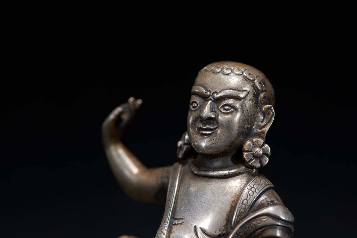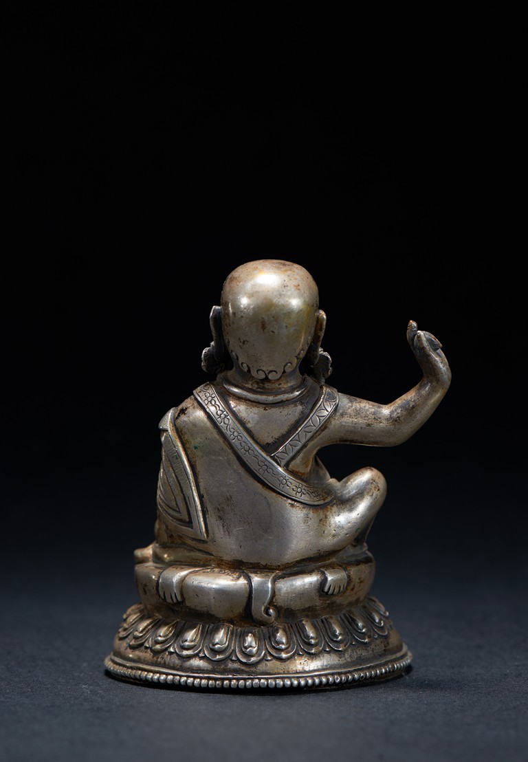 The figure is shown seated on a lotus throne draped with antelope skin, right hand raised, left hand holding a ritual cup, wearing long robe across shoulders with incised hem, face with stern expression. Ming Dynasty period.