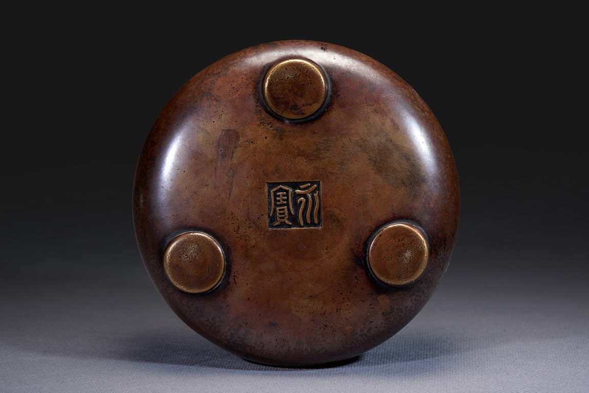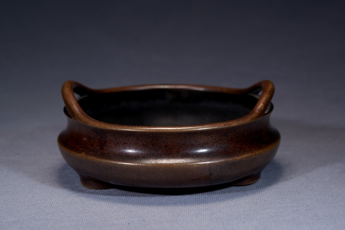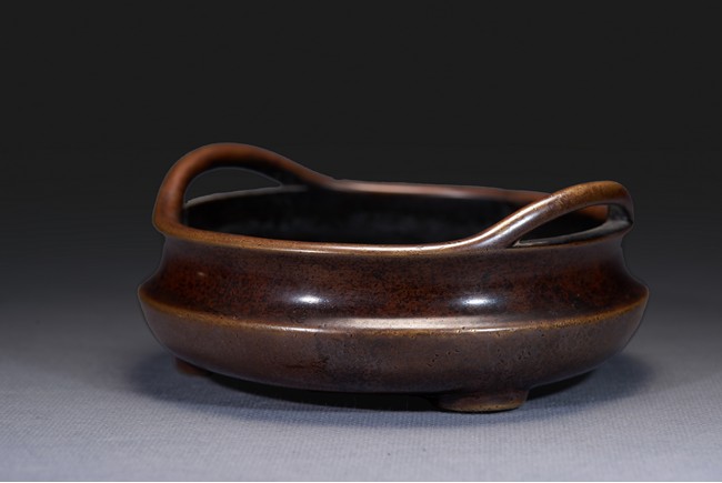 Of compressed globular form, the censer supported on short feet, the mouth rim supported with two arched handles extending outward, the underside cast with two character mark 'YONGBAO'. Qing Dynasty period.