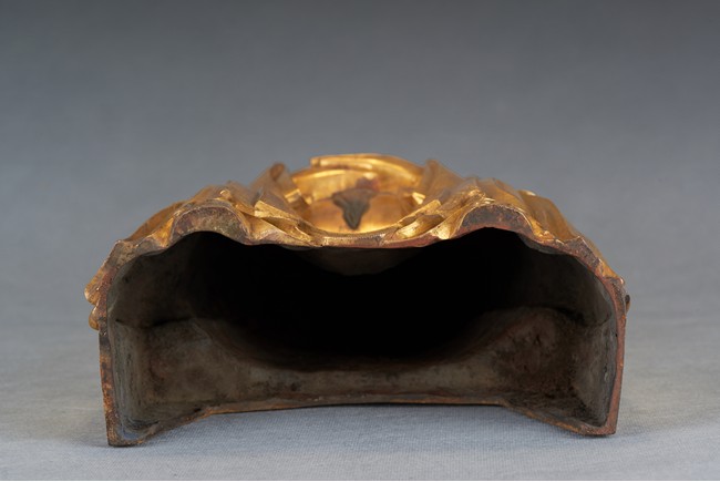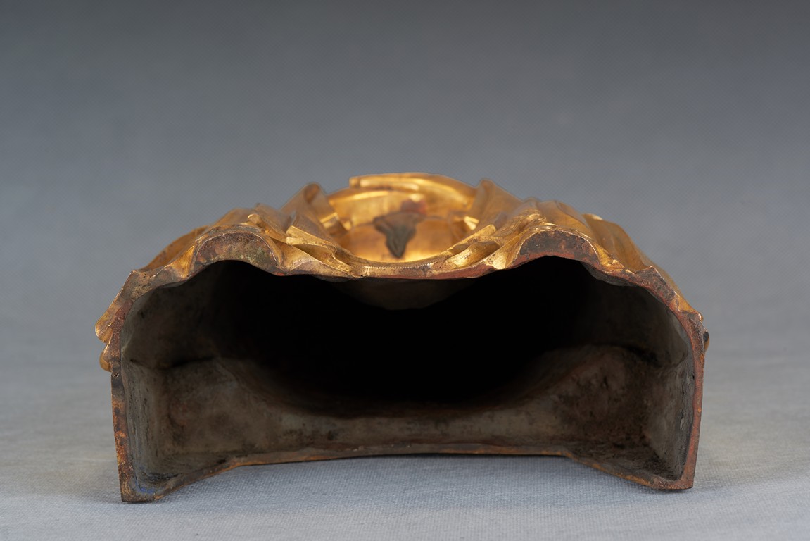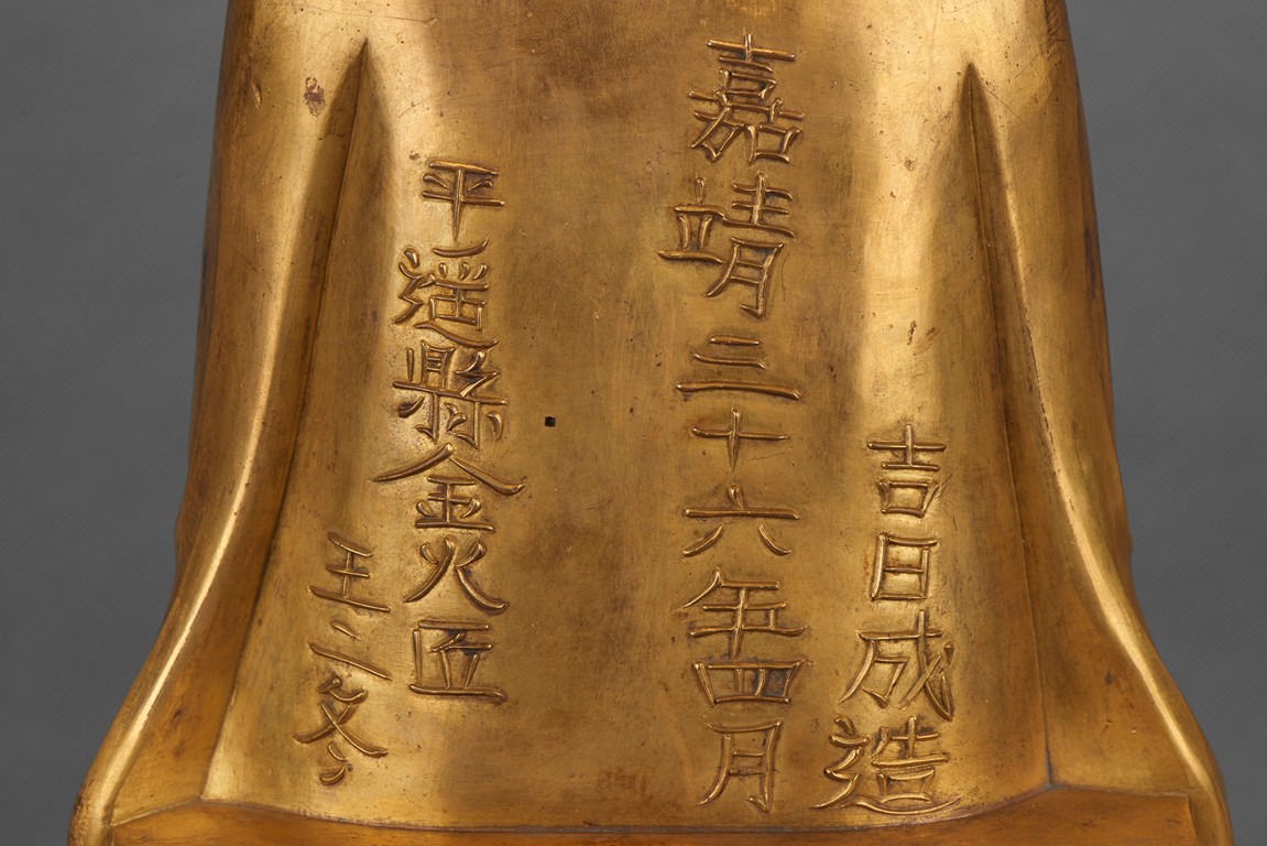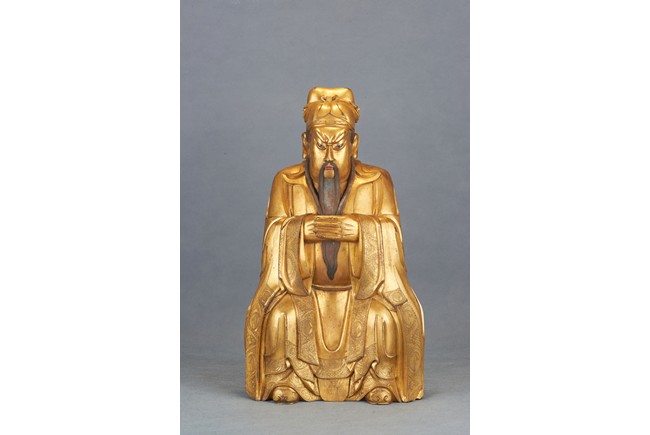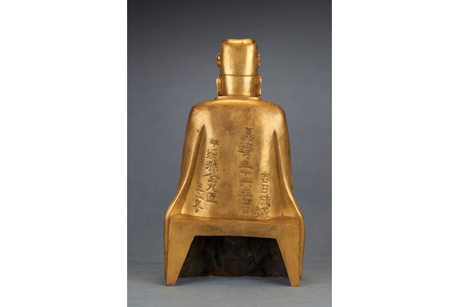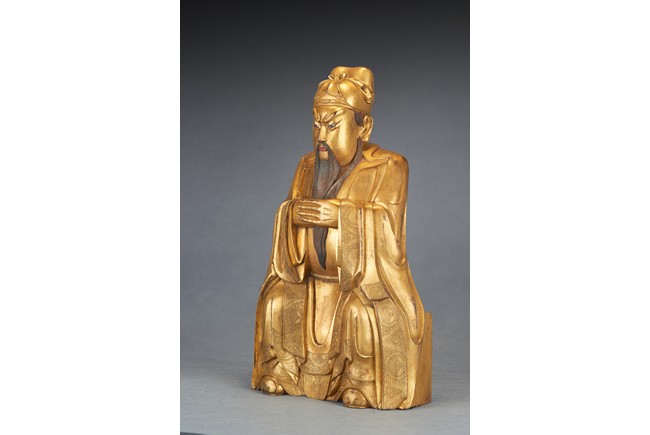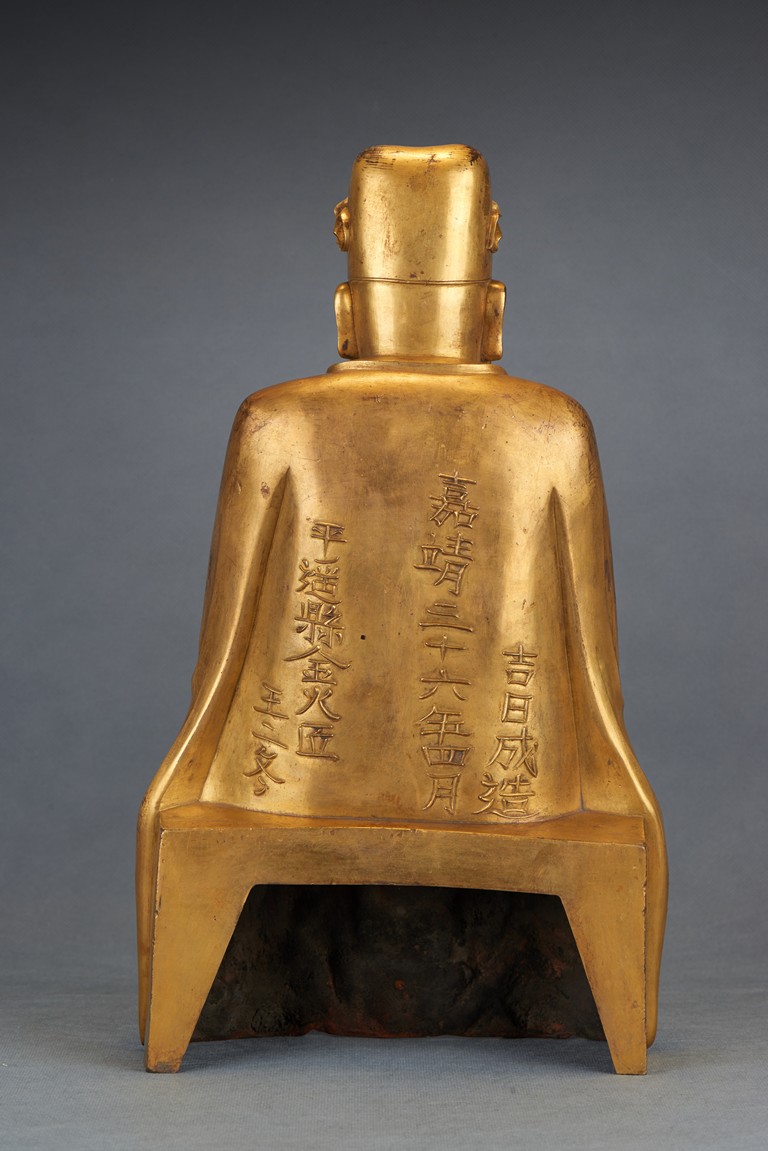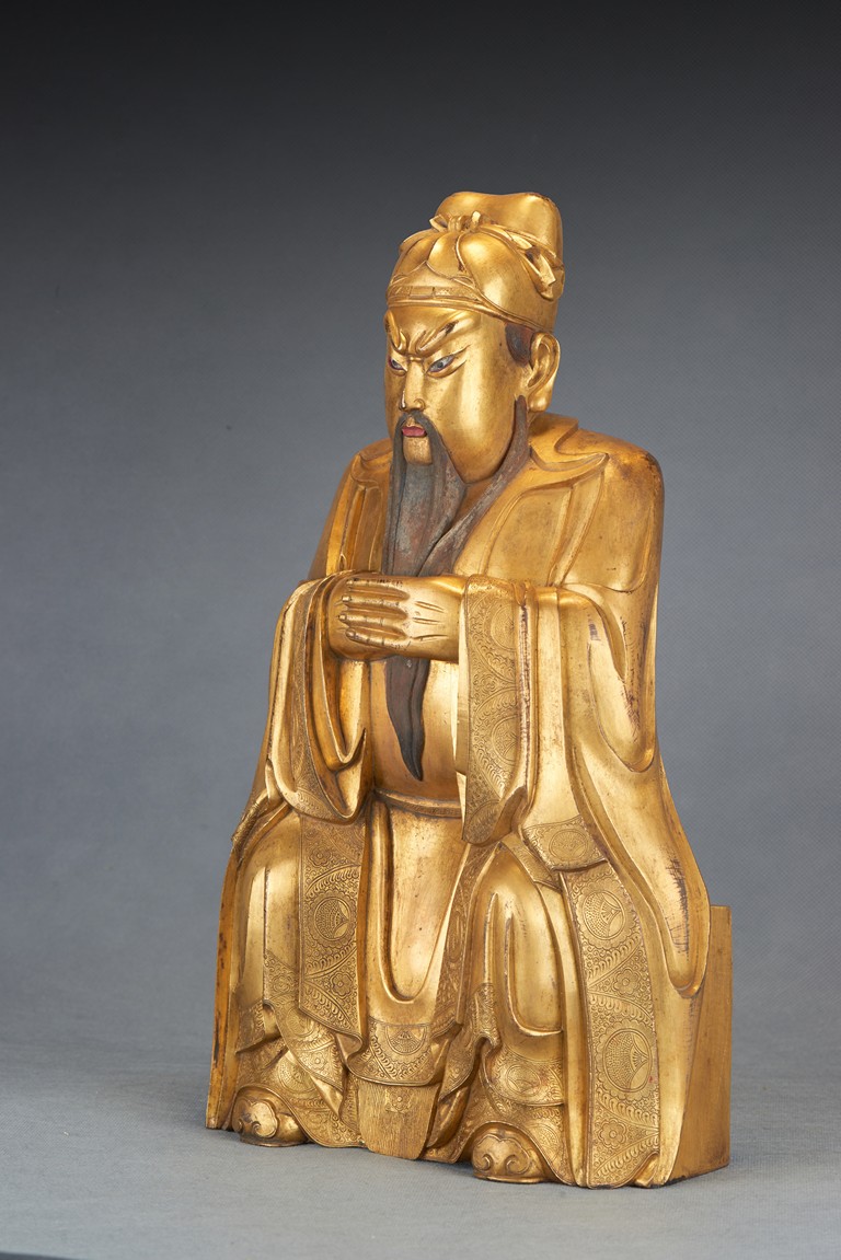 Possibly re-gilt, the God of War is shown seated on a rectangular bench with both hands clasped together, wearing court robes with decorative borders, ruyi-shaped shoes, his face shown with stern expression, with signature long beard down his belly, his back bears inscription stating the date and name of the artist. Ming Dynasty period.
