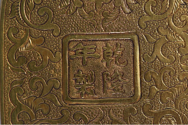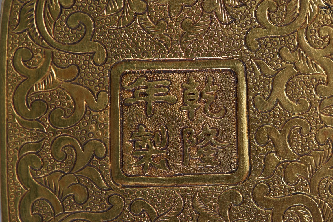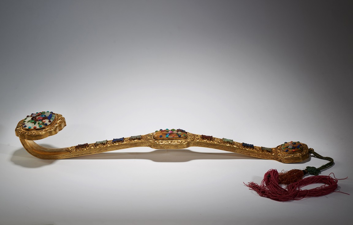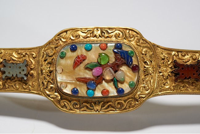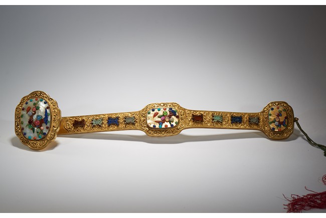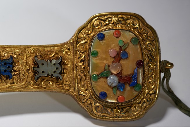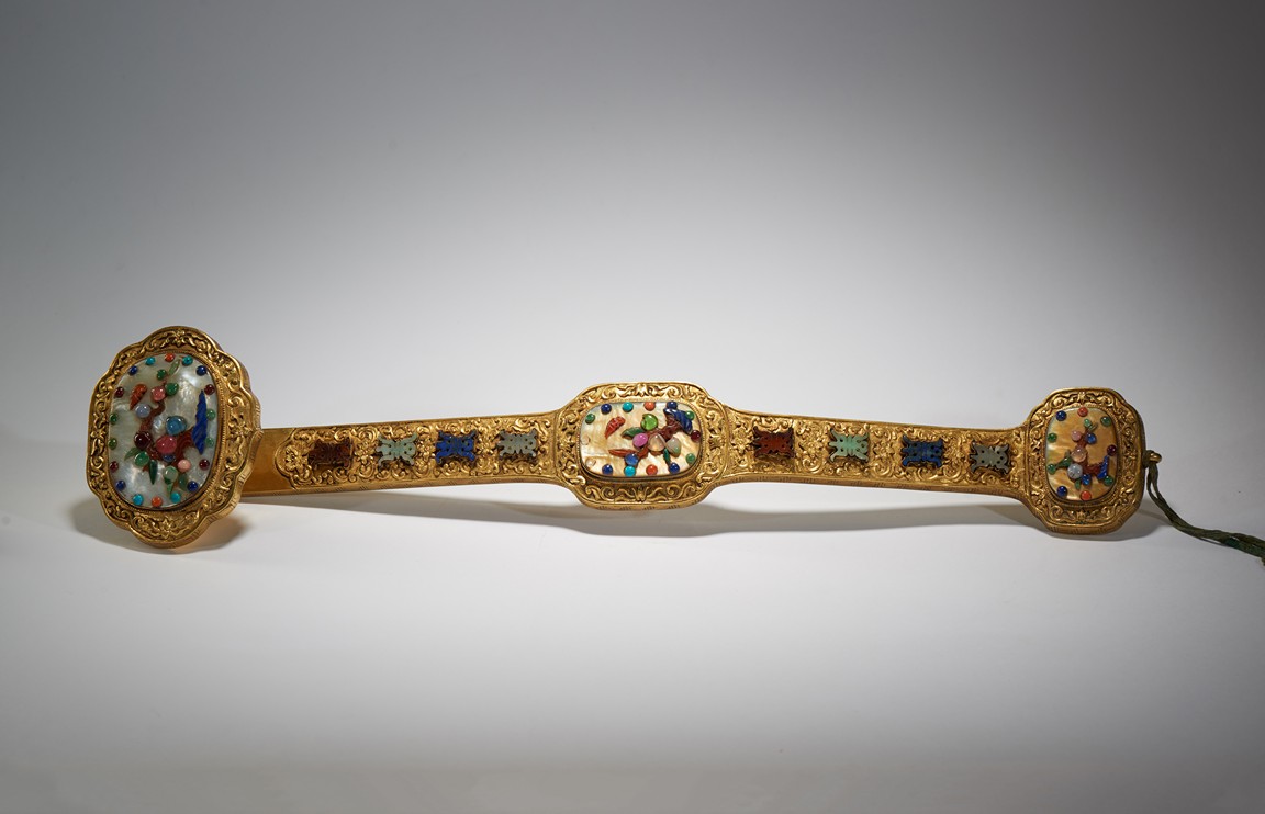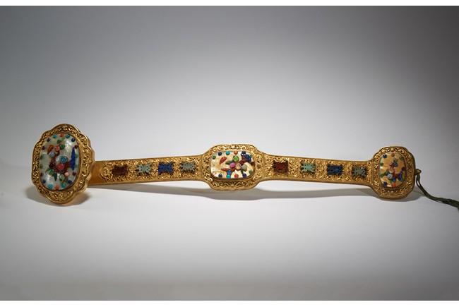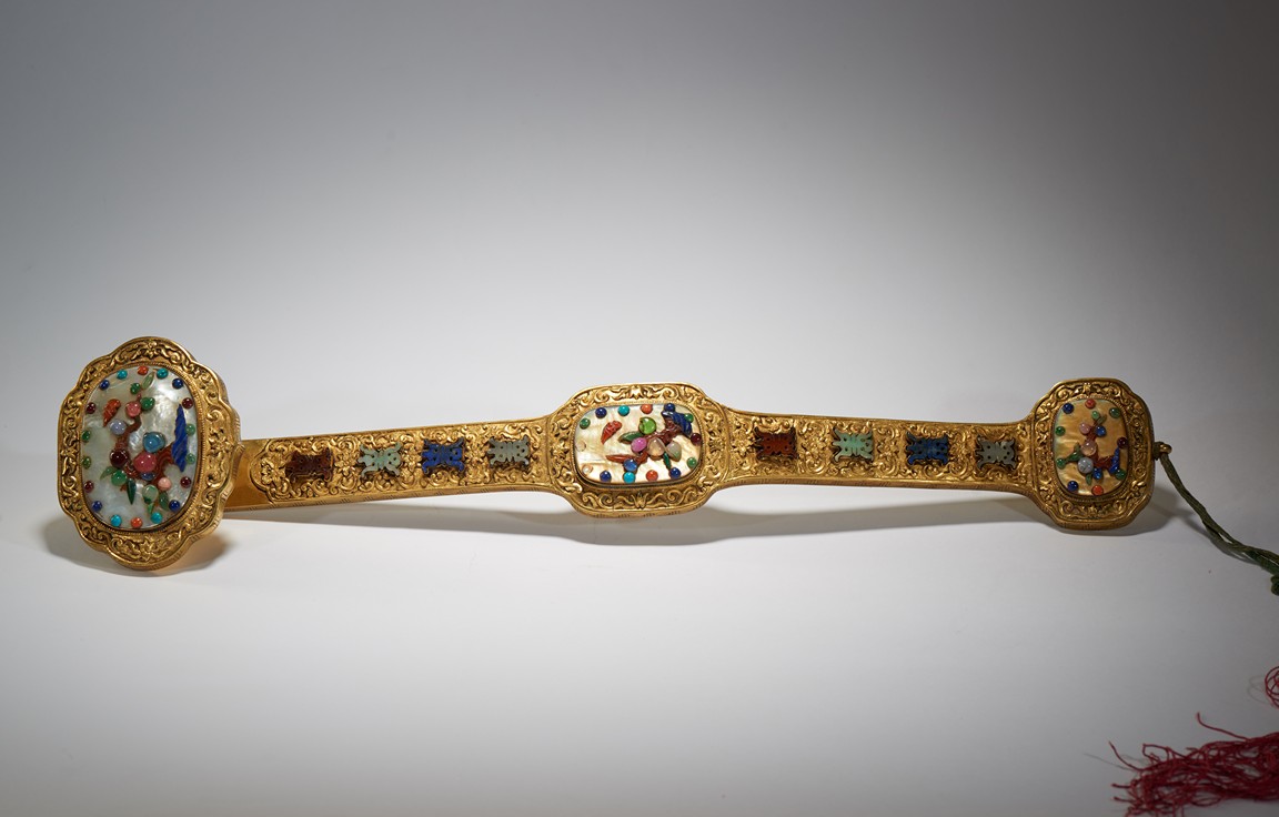 The head, center section, and tip inset with mother-of-pearl plaques, all inlaid with various jades and semi-precious gems including turquoise, jadeite, agate, lapis lazuli with scenes incorporating peach trees and auspicious bats, the shaft inlaid with stylized shou characters inlaid with similar gems against raised lotus floral scroll ground.