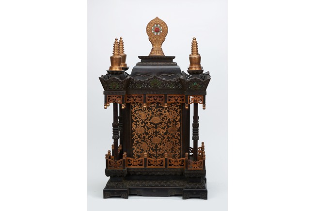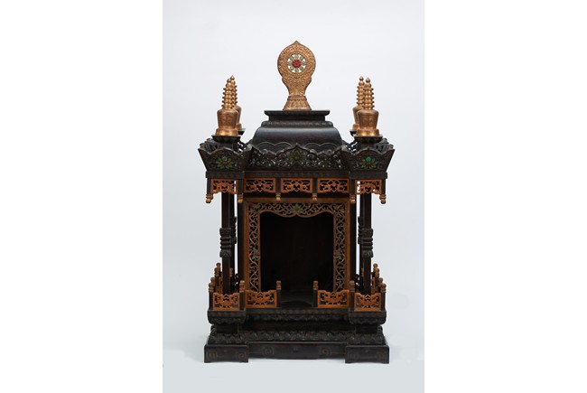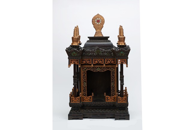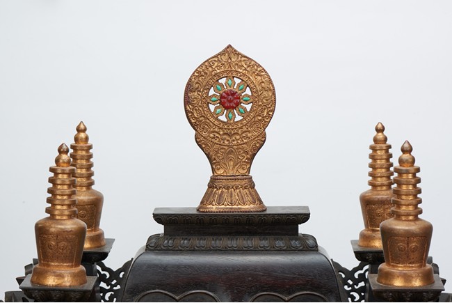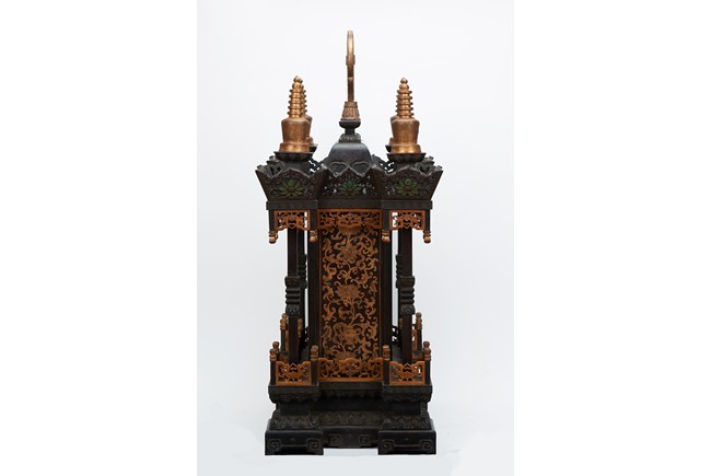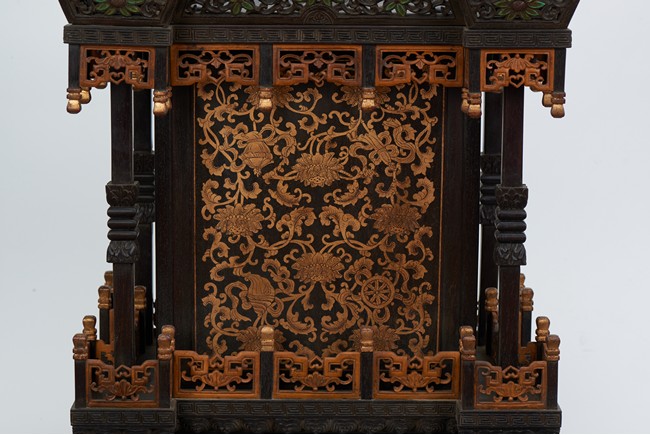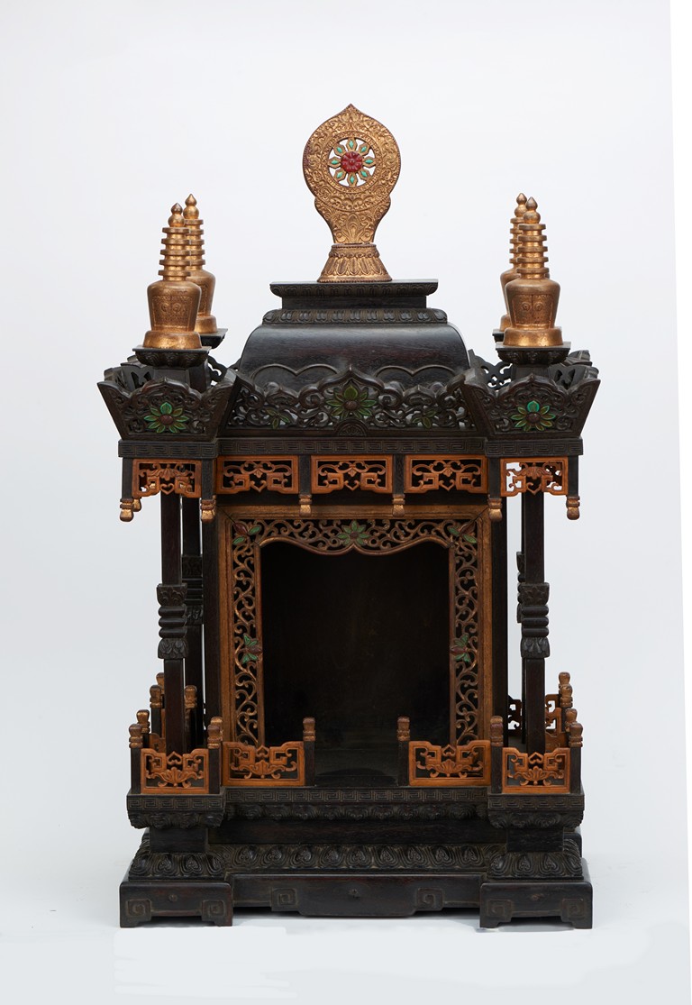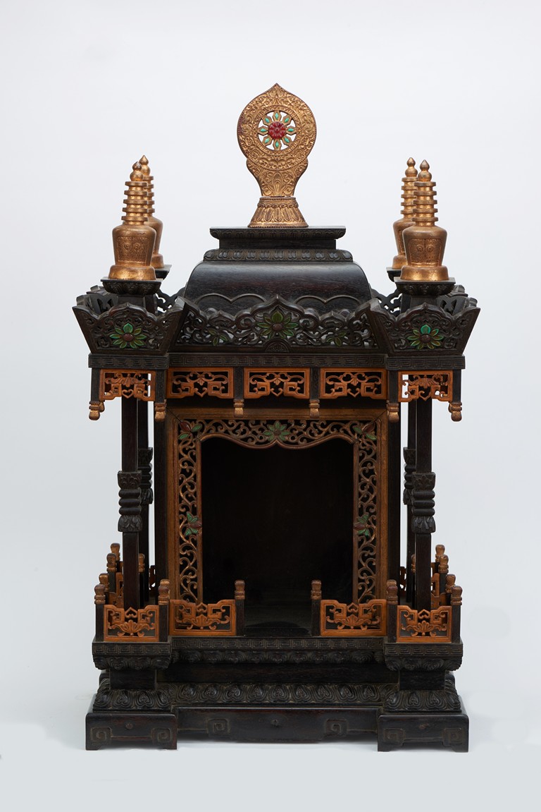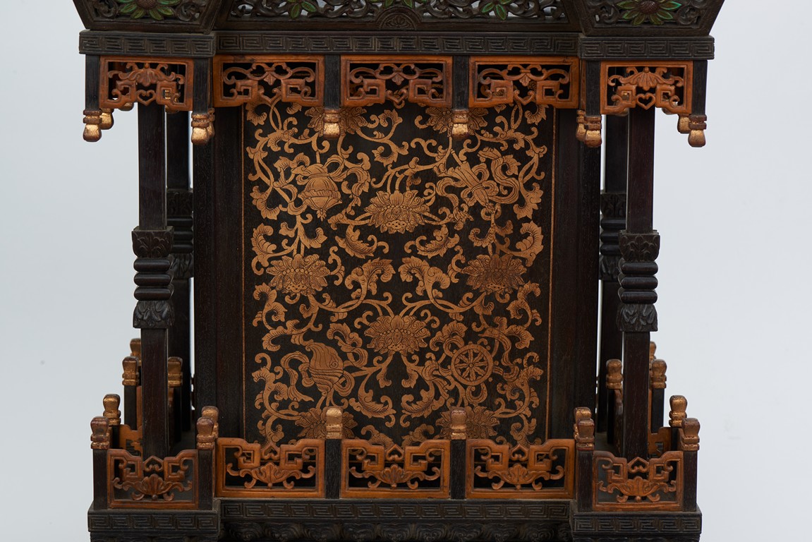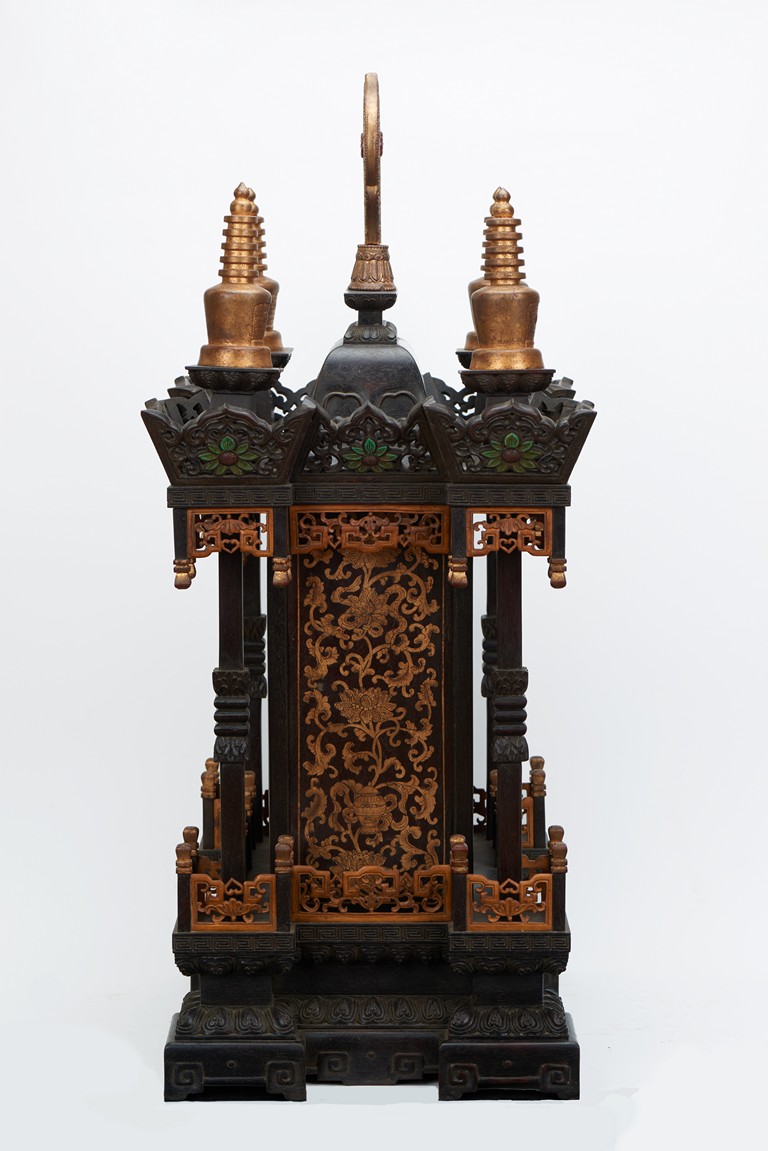 The shrine is finely constructed in the form of a miniature pavilion, the domed roof surmounted by a gilt-painted buddhist altar and four stupa to each of four corners, further supported on four columns flanking a chamber with openwork lotus scrolls frame in gilt, the sides and back gilt-painted with intricate pattern of lotus scrolls and buddhist emblems, all supported on delicately carved waisted lotus petal zitan base.