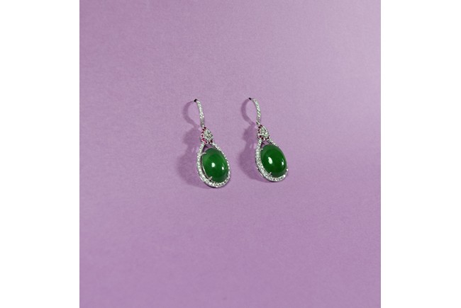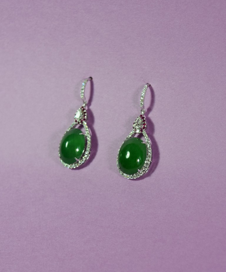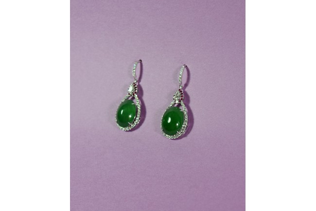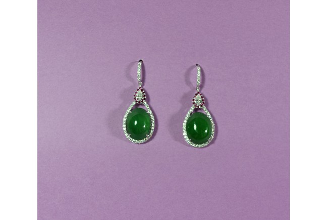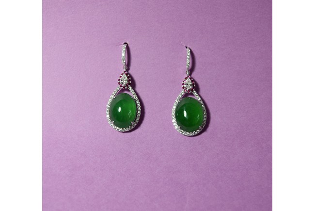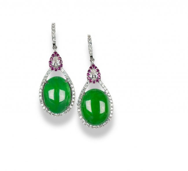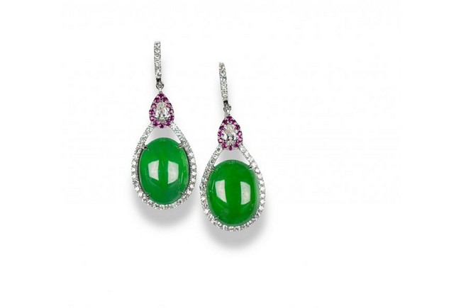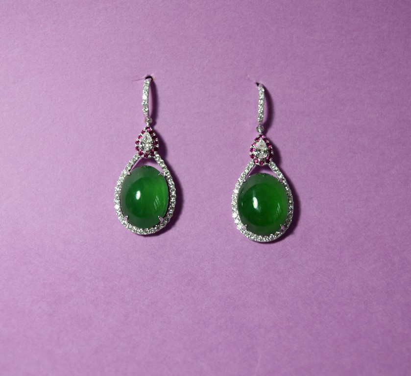 A貨濃陽綠翡翠大蛋麵耳墜一對,翡翠色澤通透均勻,配一對梨形大鑽石圍鑲紅寶石,18K白金托架。帶香港翡翠玉石中心證書。