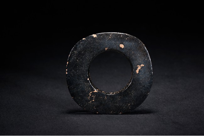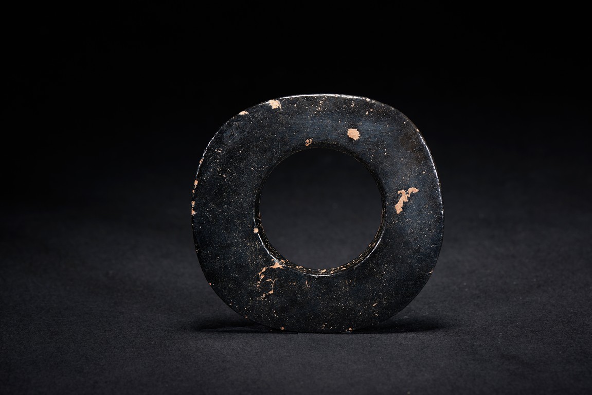 Possibly from Qijia culture, the disc with a circular aperture drilled at center, the stone is of opaque black tone with scattered buff marks. Qi Jia culture