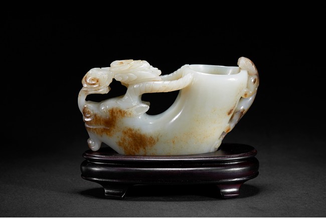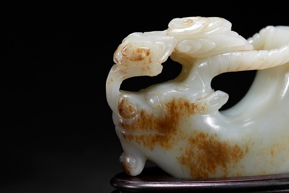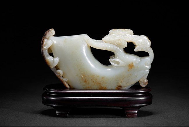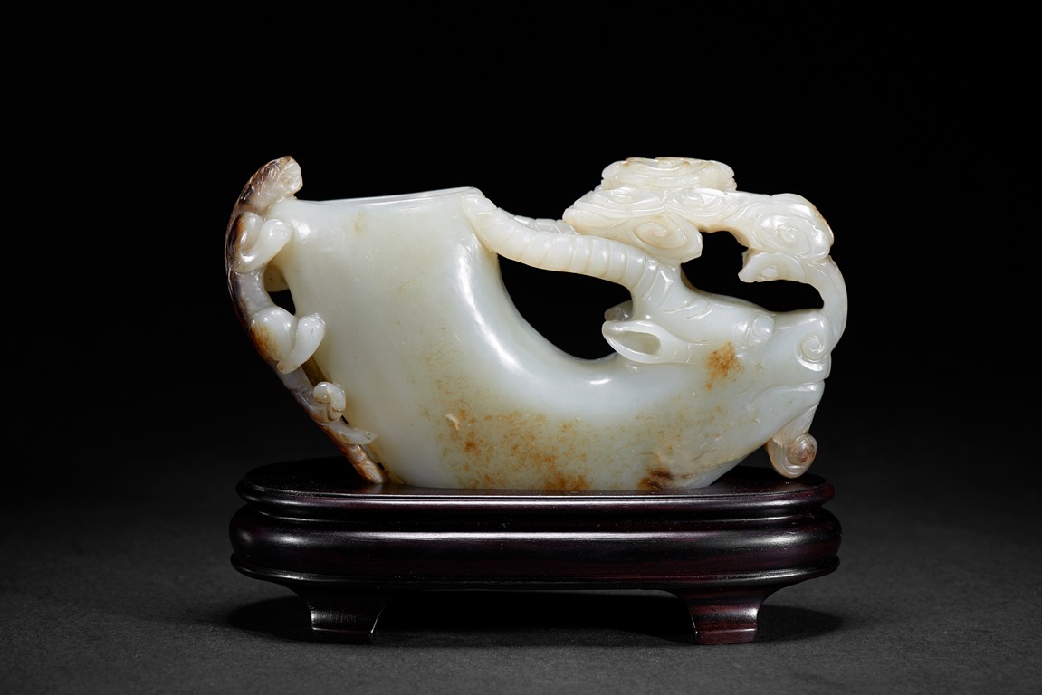 Skillfully carved, one side of the cup is modelled as ram head with auspicious clouds issuing from its nose, the other side with a clambering chilong, the stone is of smooth white tone with russet skin and veins. Qing Dynasty period.