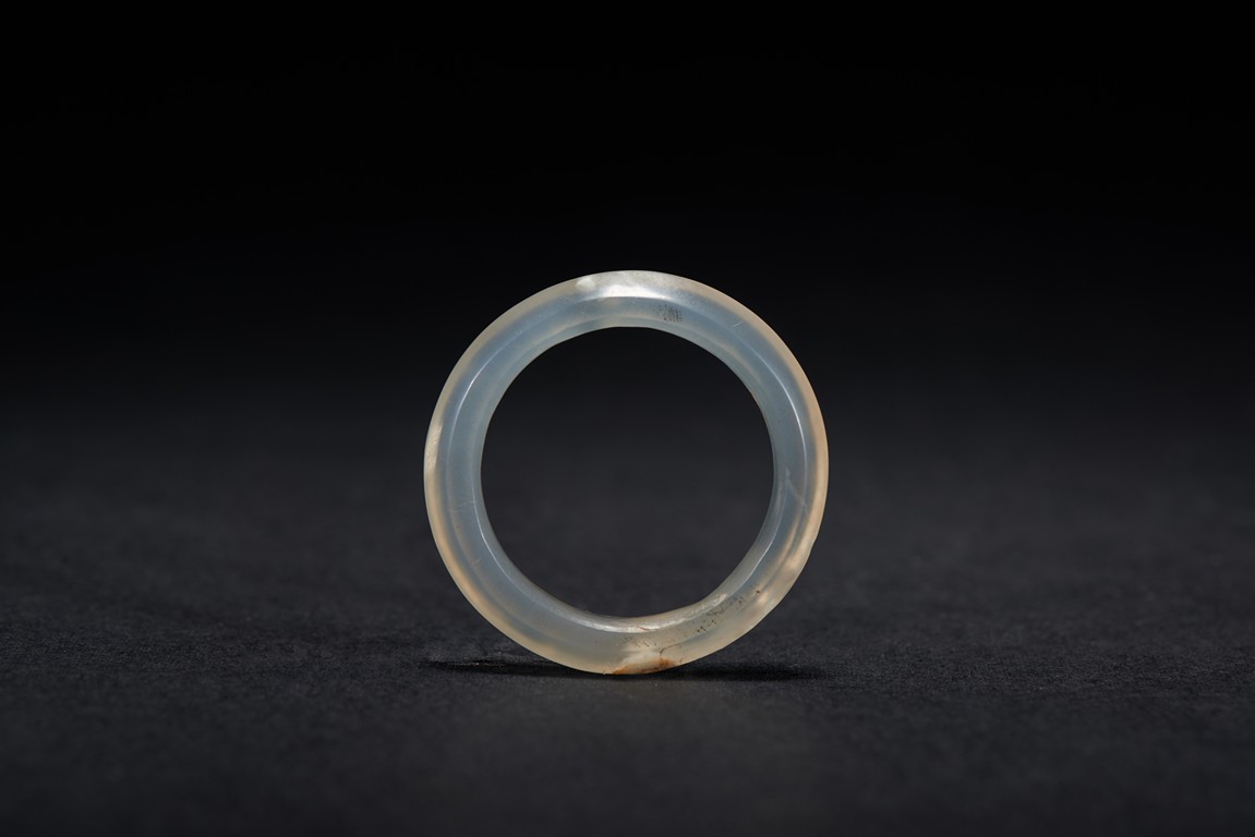 The bangle is crisply carved with highly translucent white tone with minor russet inclusion. Warring state period.