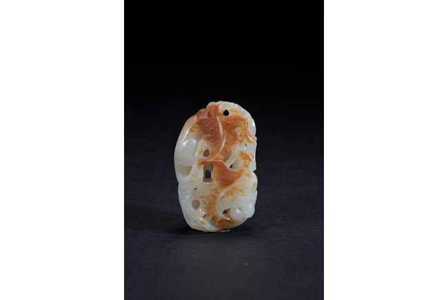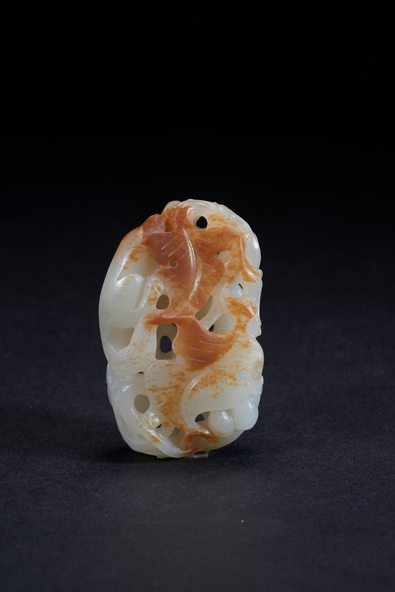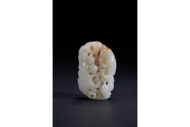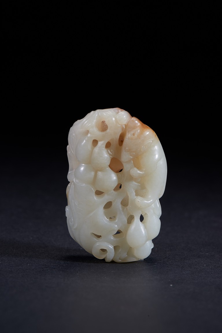 The carving depicts a squirrel clambering upon leafy double gourd branches, the stone is of smooth white tone, the reverse with extensive russet inclusions. Qing Dynasty period.