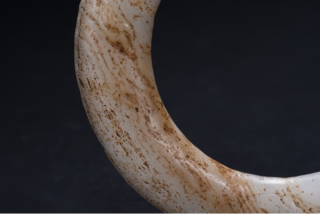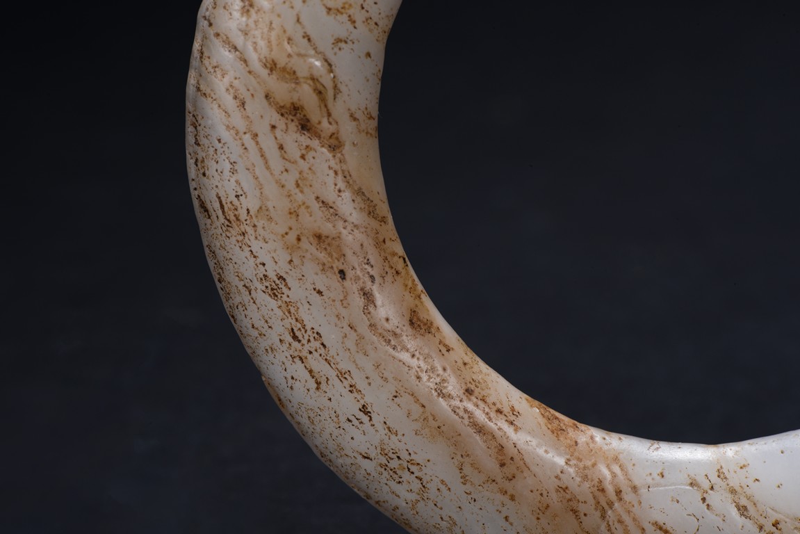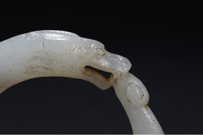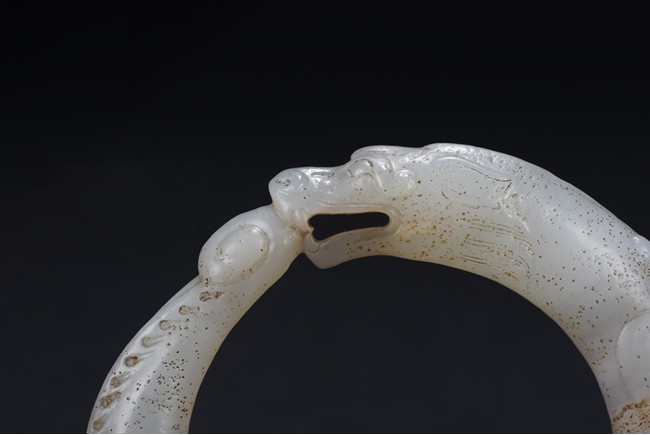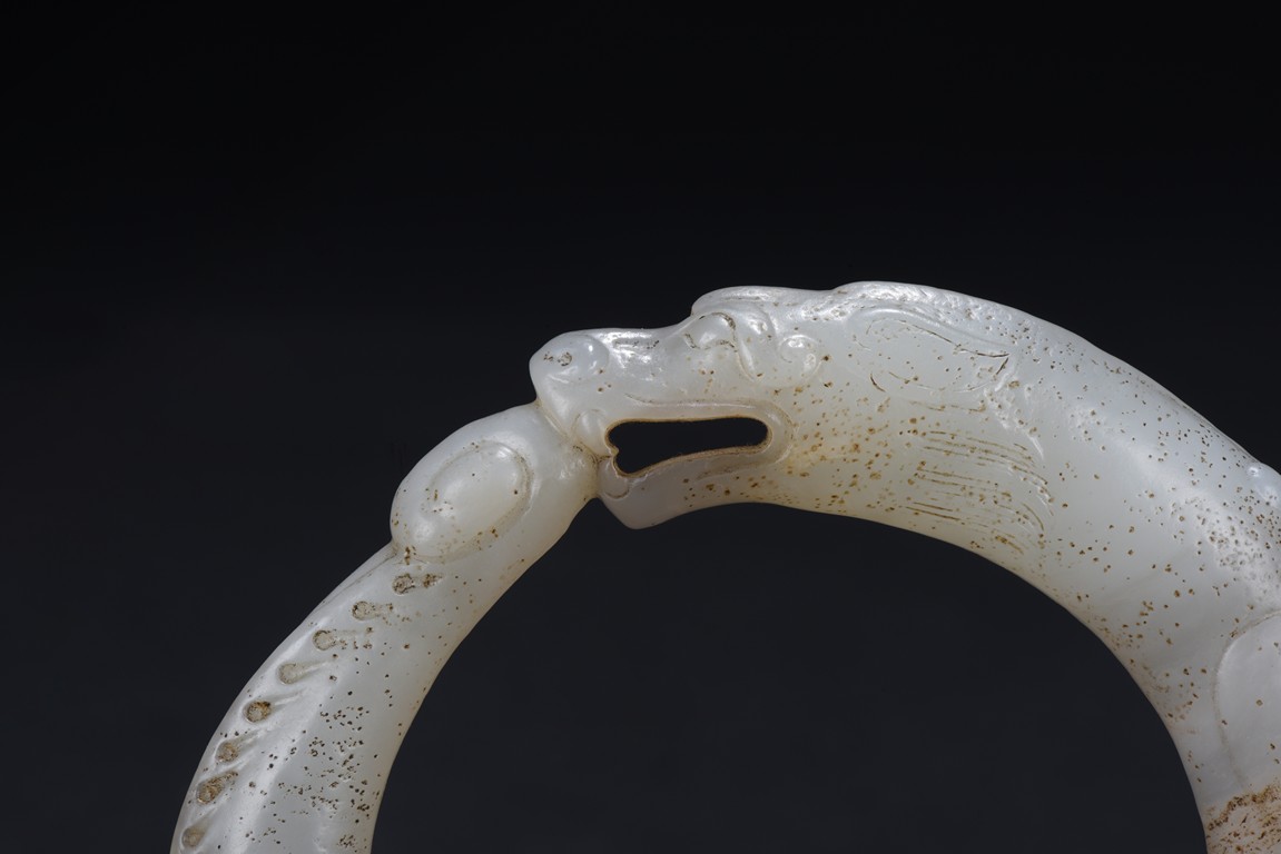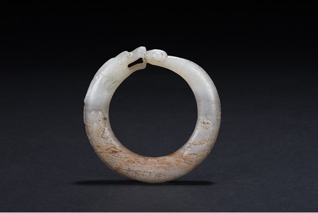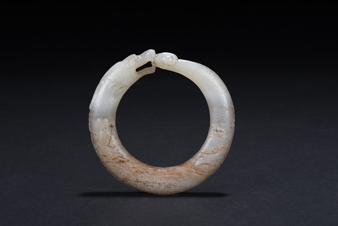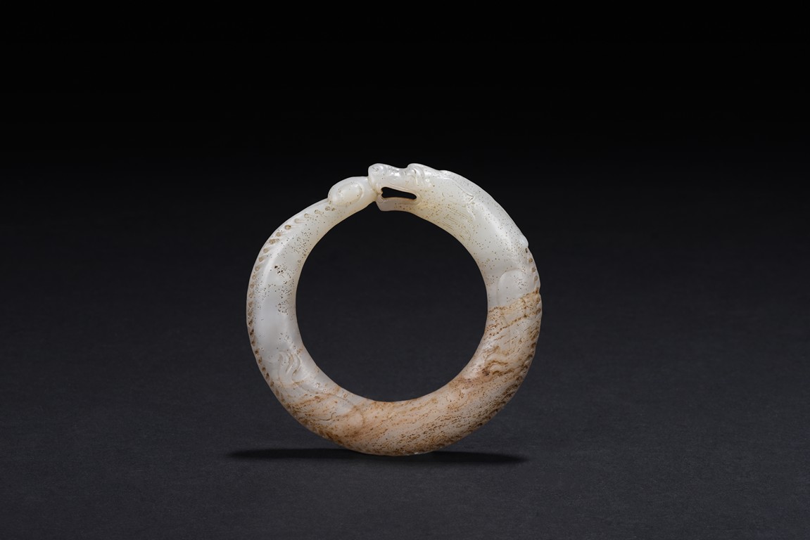 Of circular form, modelled in the form of a dragon biting on its tail forming a loop. The stone is of white tone with russet markings.