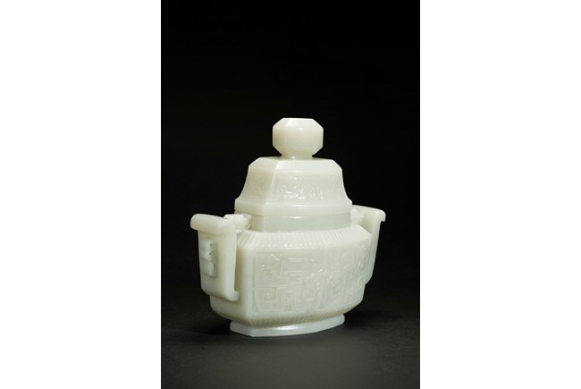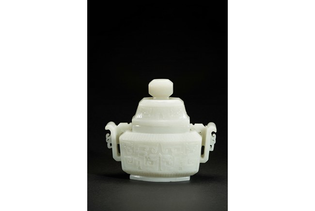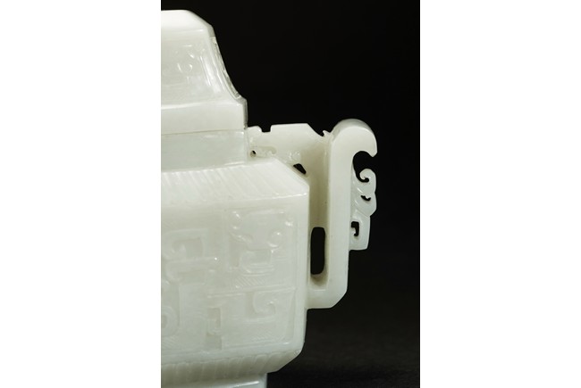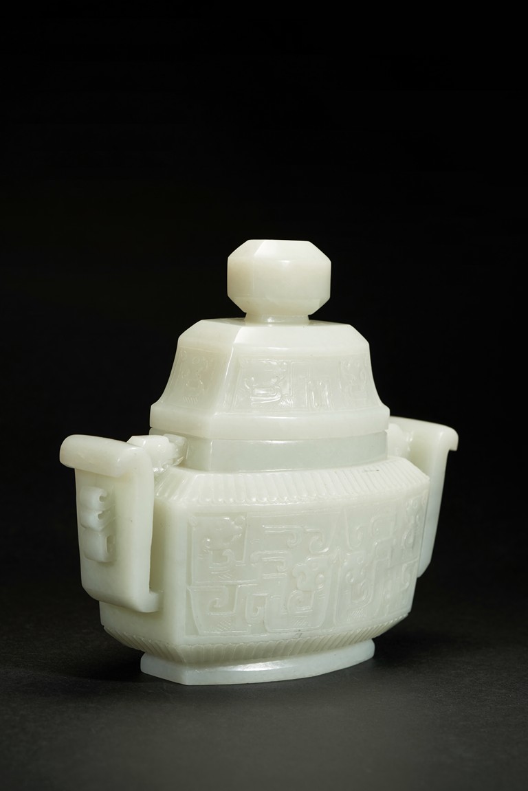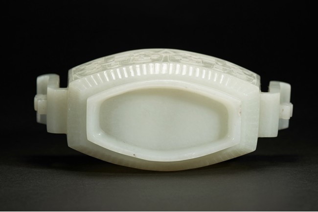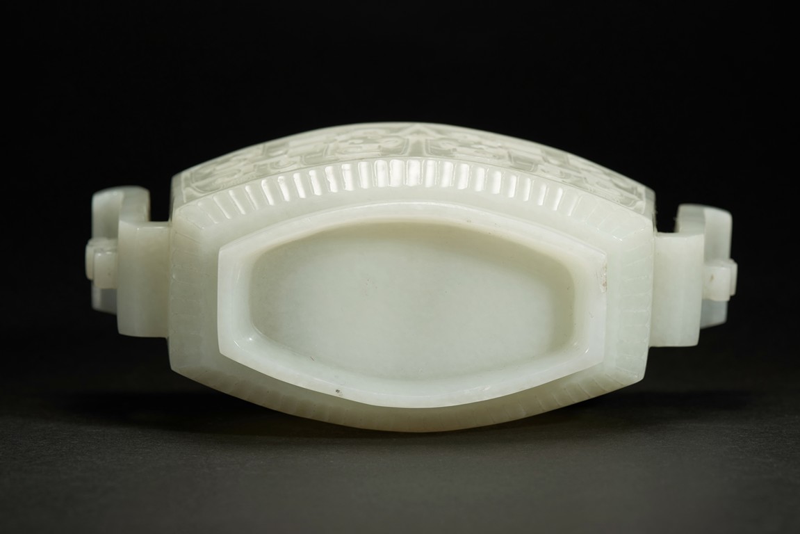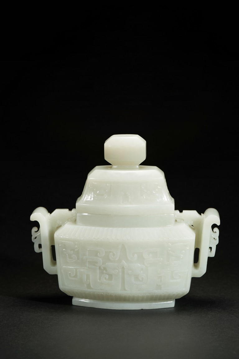 Of compressed form, the censer is carved to exterior with a band of archaistic mythical beast pattern flanked by lappet bands, the body further flanked by a pair of wide archaistic scroll handles, the cover with similar pattern, the stone is of slightly greenish-white tone.