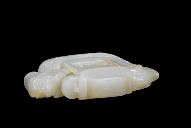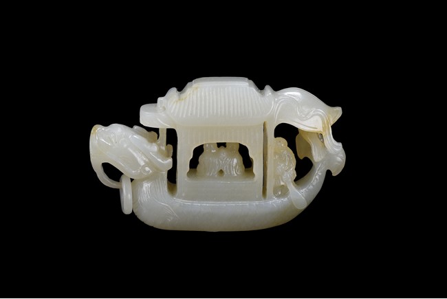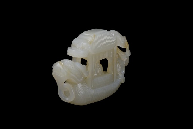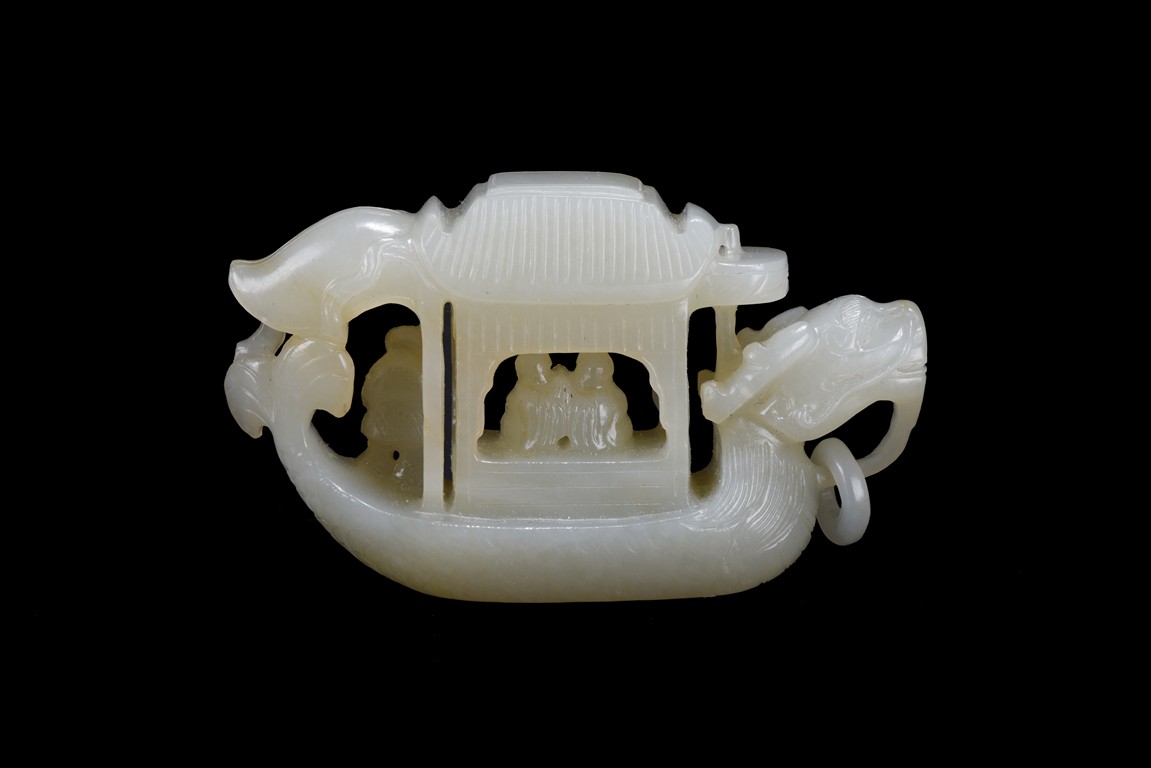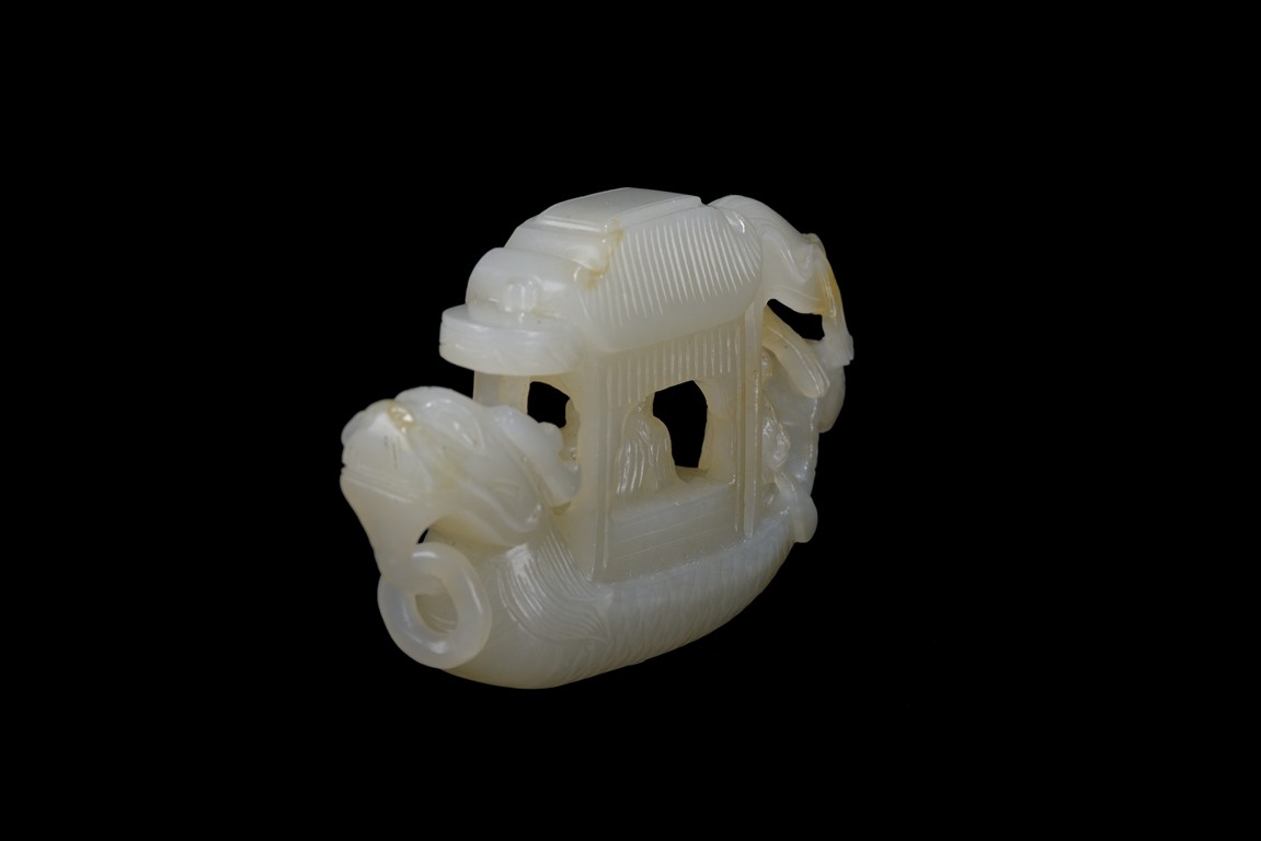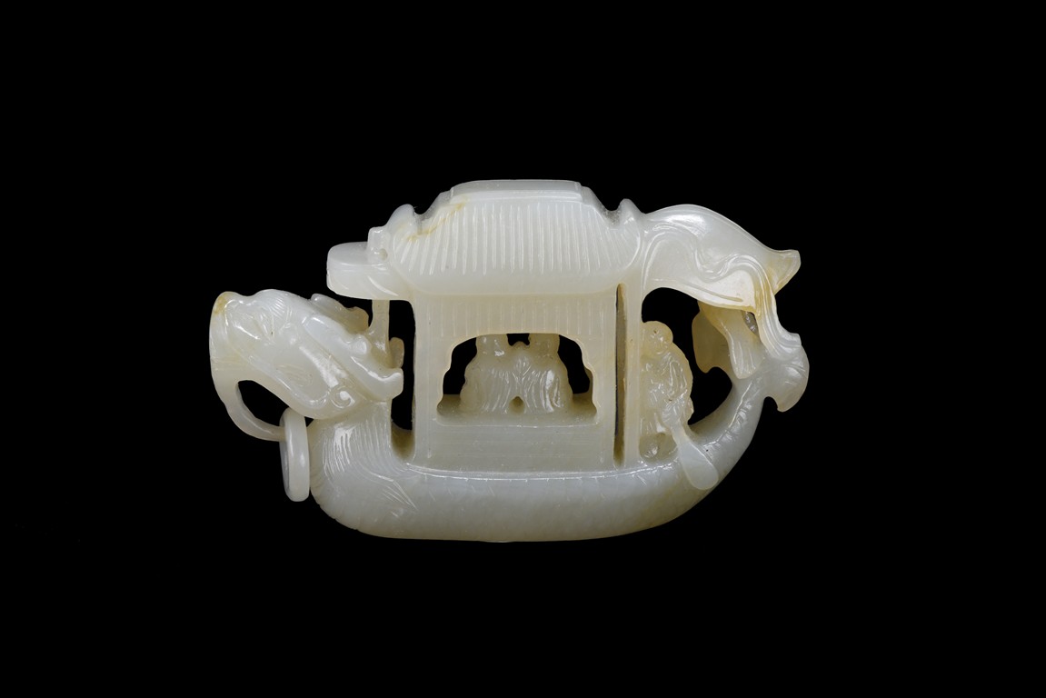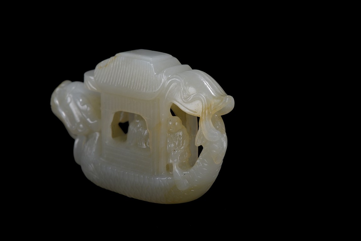 Carved and pierced as a barge with dragon-headed prow suspended with loose ring, supported with pavilion-like construction of the hull, the stone is of even smooth white tone. Qing Dynasty period.