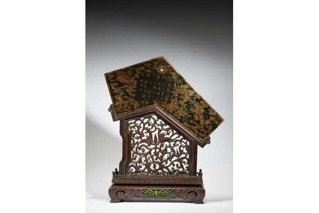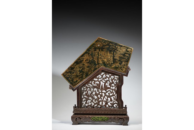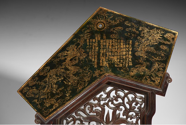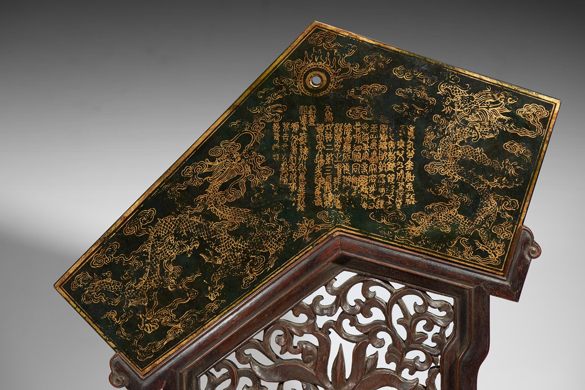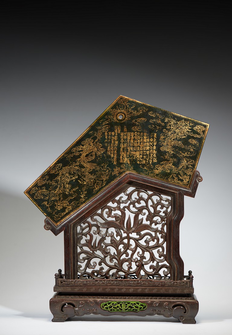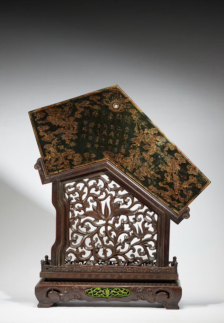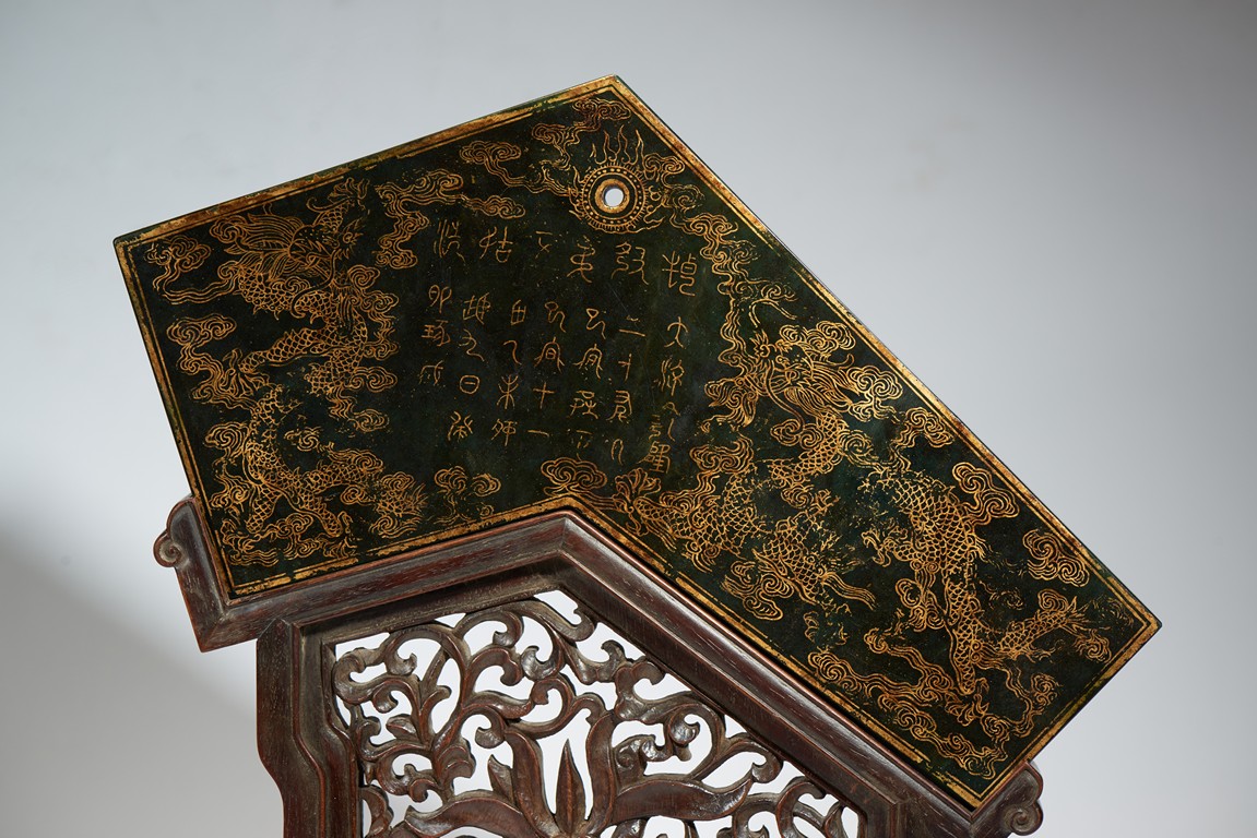 The jade is finely decorated in gilt on one side with two ferocious dragons chasing a flaming pearl pierced with an opening for suspension, flanking inscription to the center in seal script; the reverse is decorated with similar pattern with two dragons flanking seal script inscription. Accompanied with a zitan stand. Qing Dynasty Qianlong period.