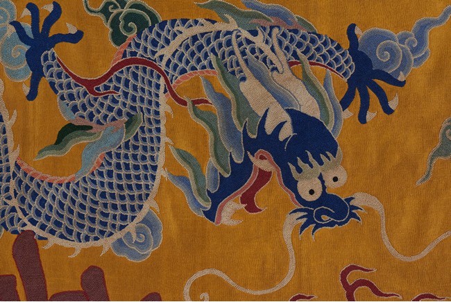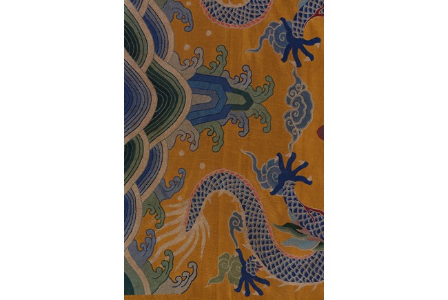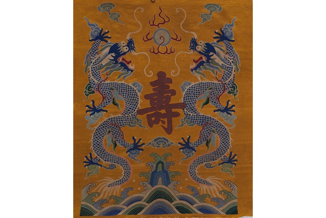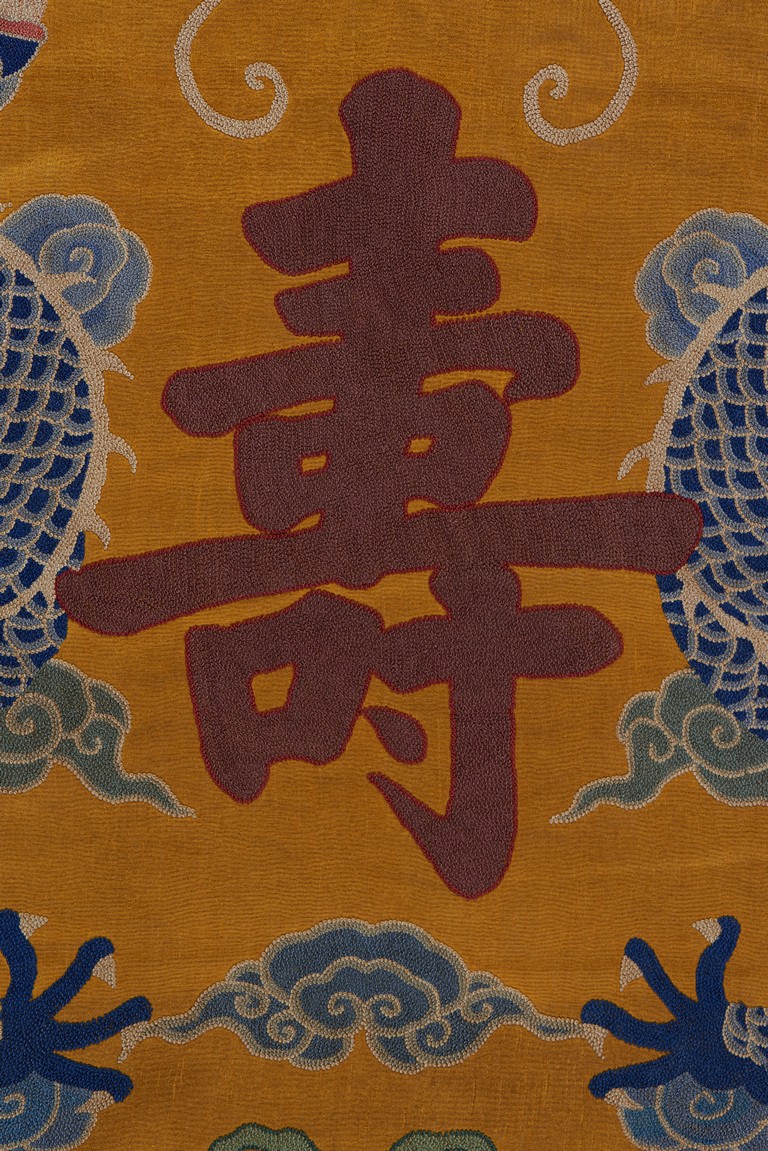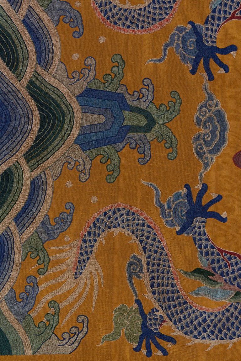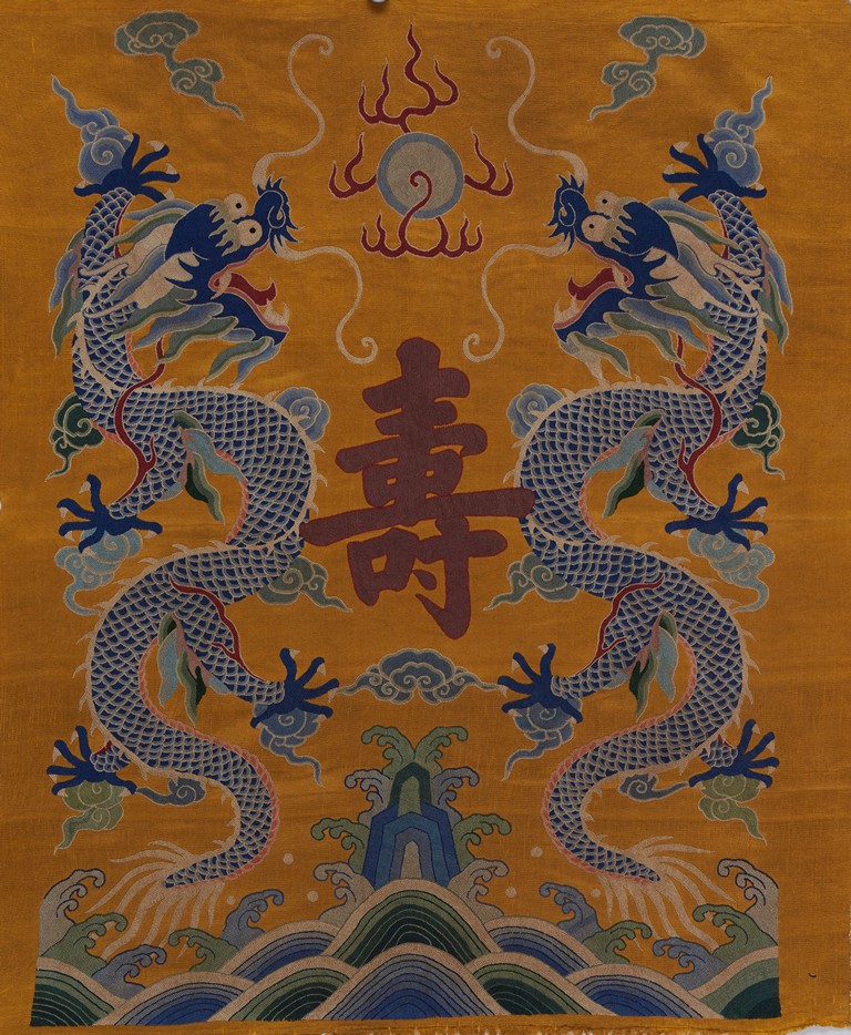 Of rectangular form, the ochre yellow silk ground embroidered with two ascending dragons from waves chasing a flaming pearl, with a shou character flanked in between, right above the sacred mountain. Qing Dynasty period.
