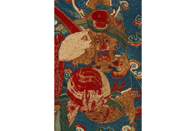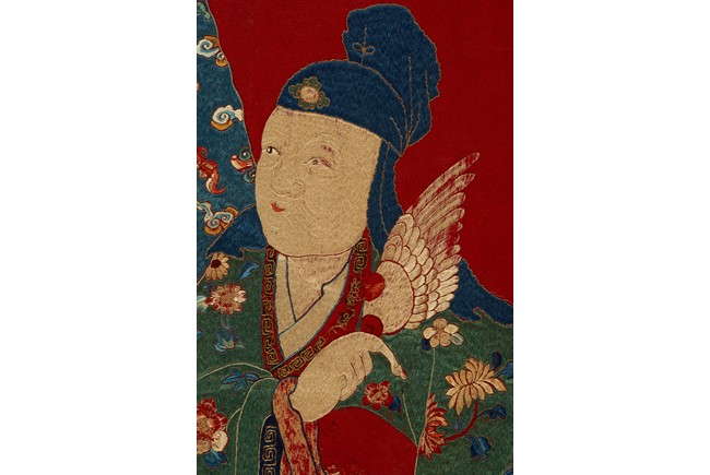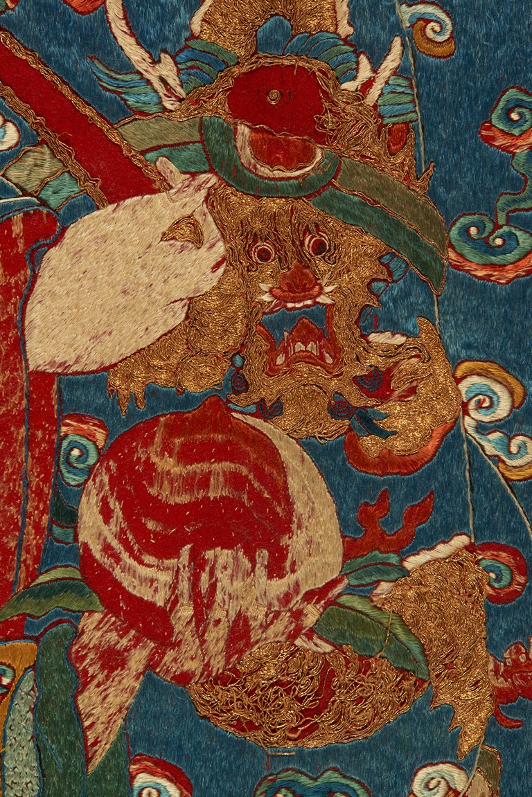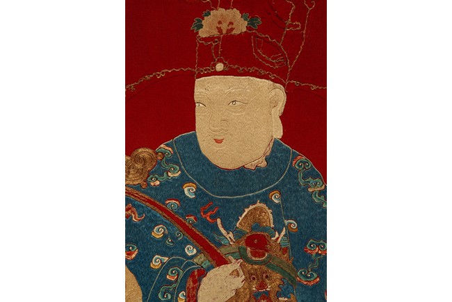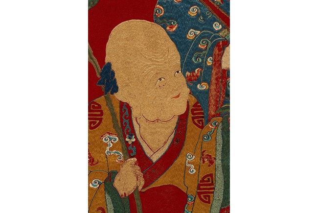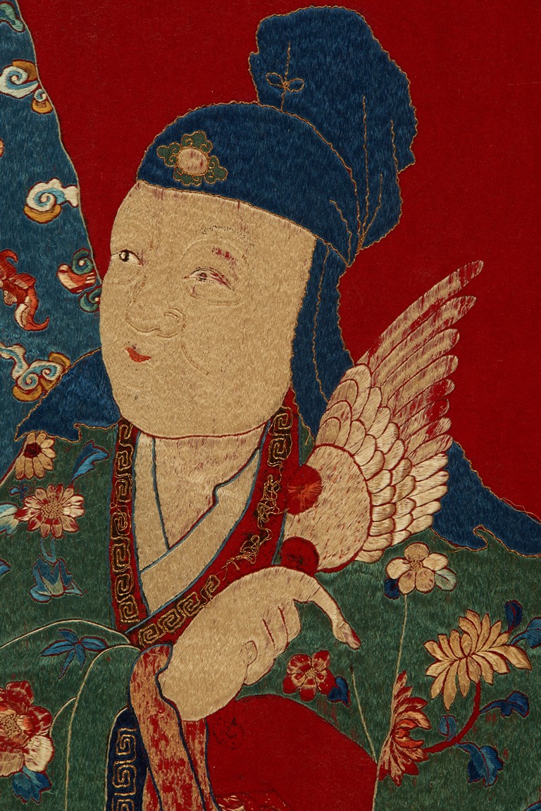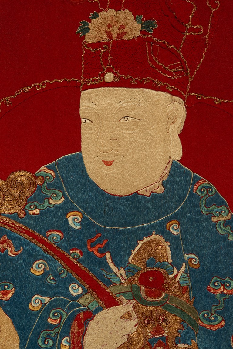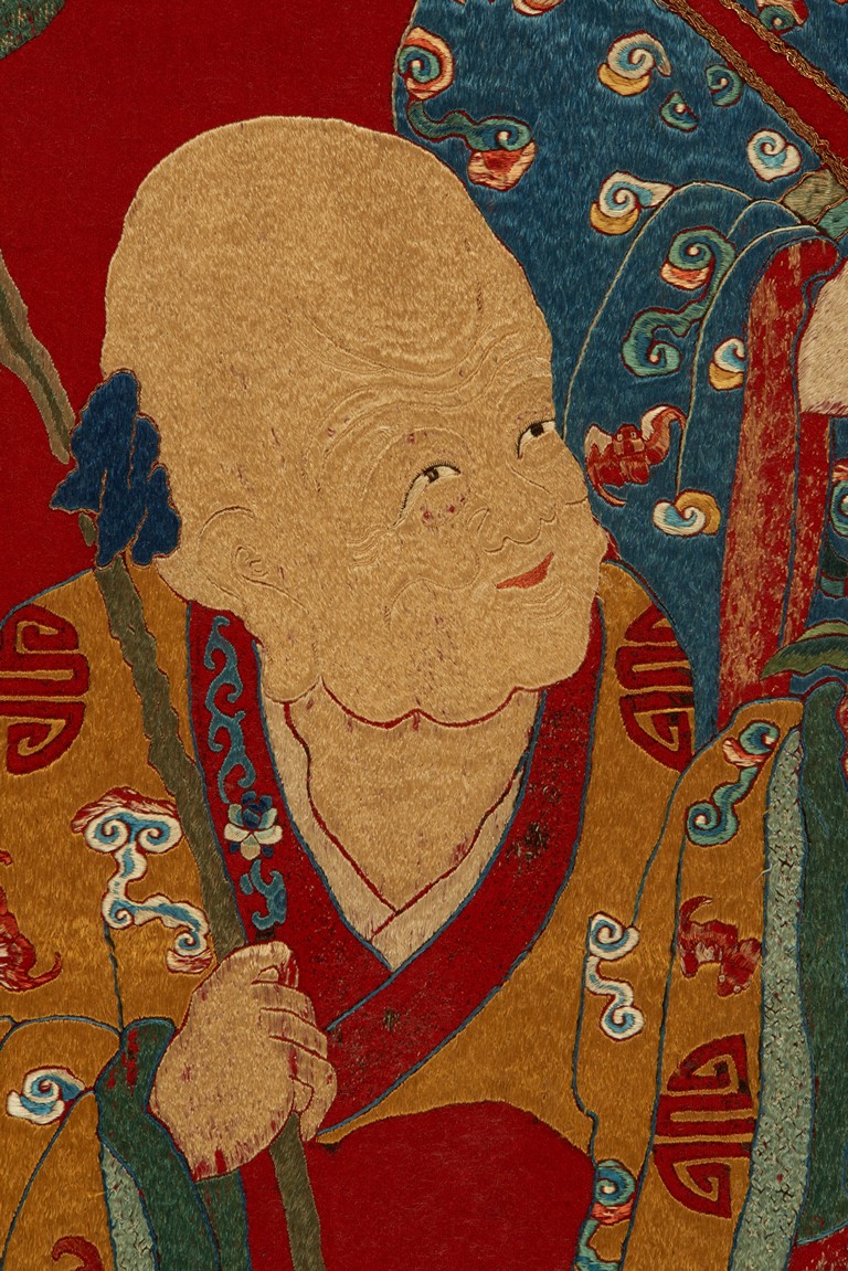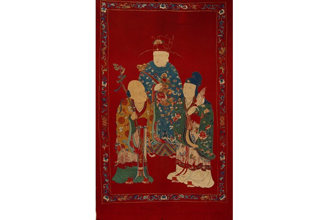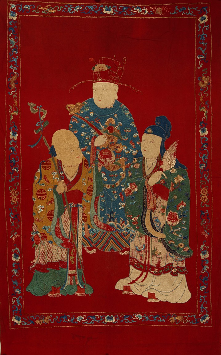 The panel is finely embroidered depicting the three 'Star Gods', Fu, Lu, and Shou,all dressed in elaborate robes with auspicious motif, the Fu Xing in the center dressed in blue dragon robe, the Shou Xing seen on the left holding a peach, the Lu Xing dressed in green and holding a fan, all reserved on red silk ground. Qing Dynasty period.