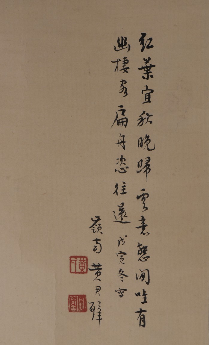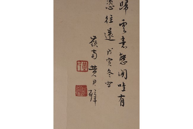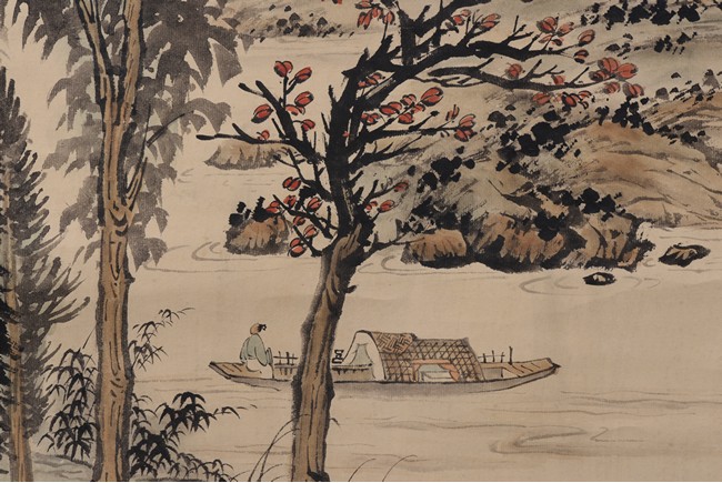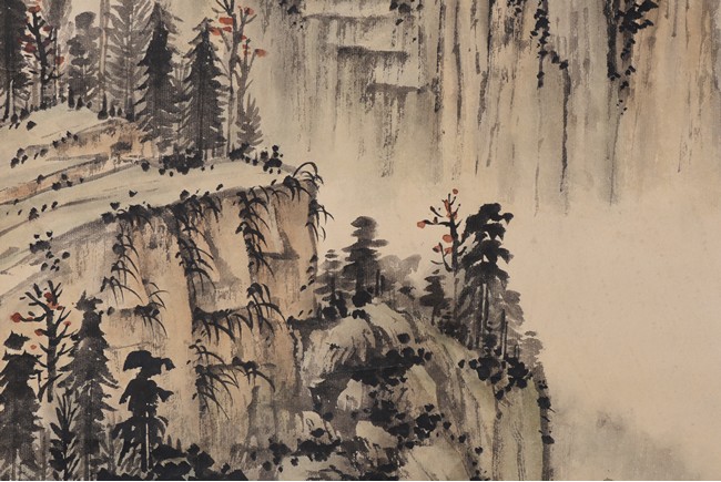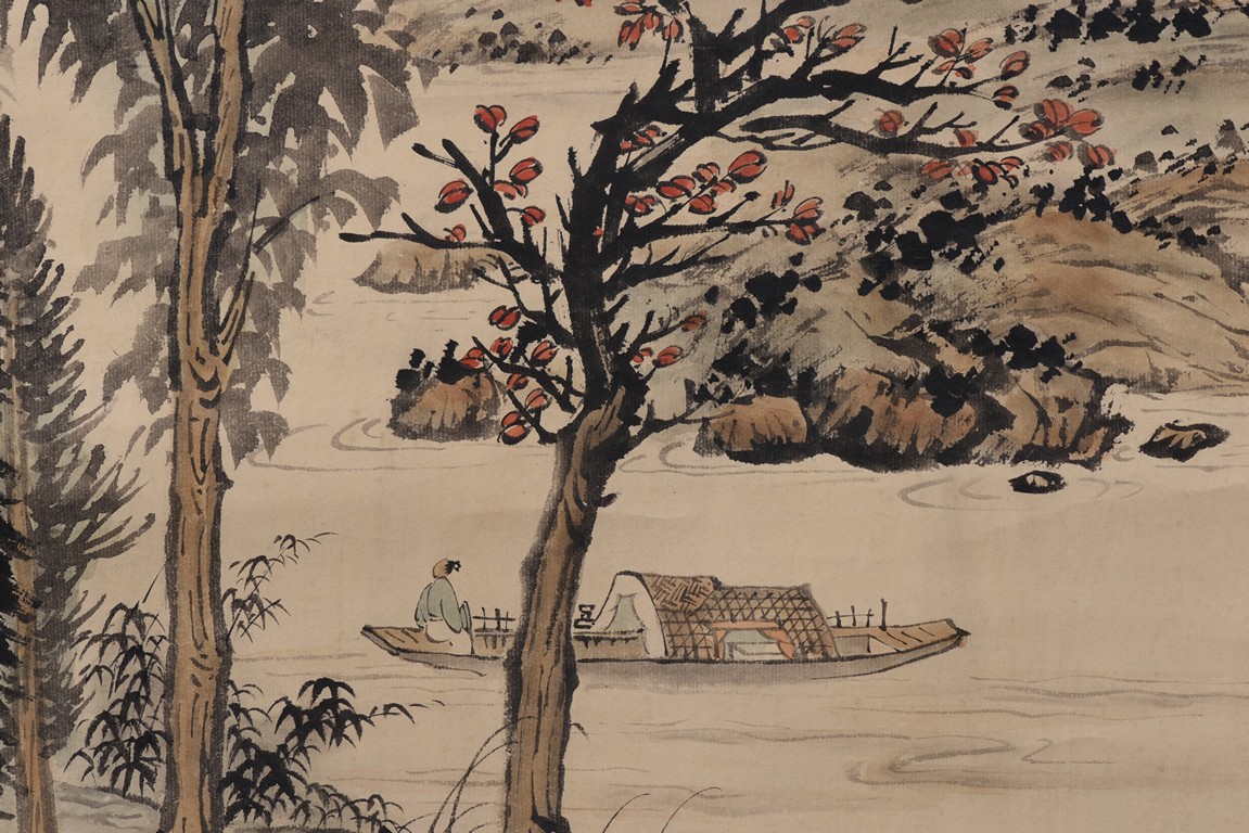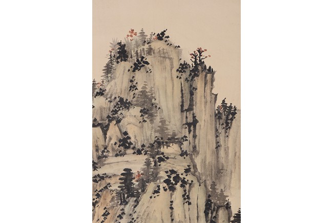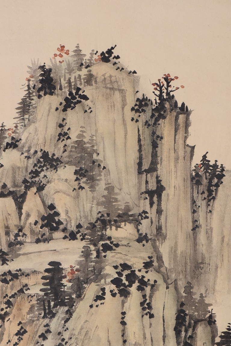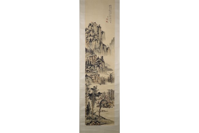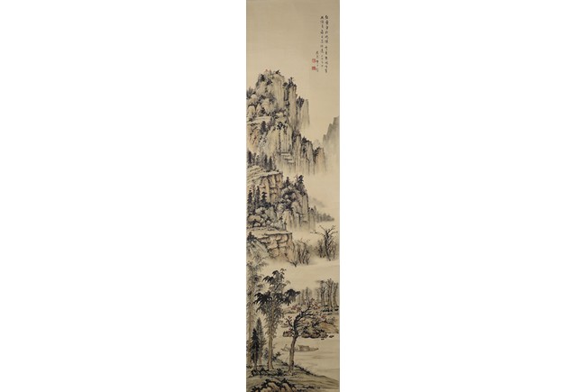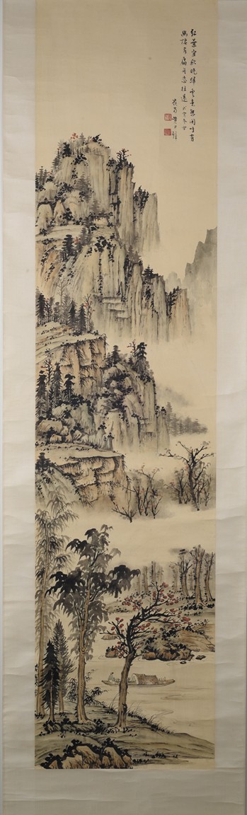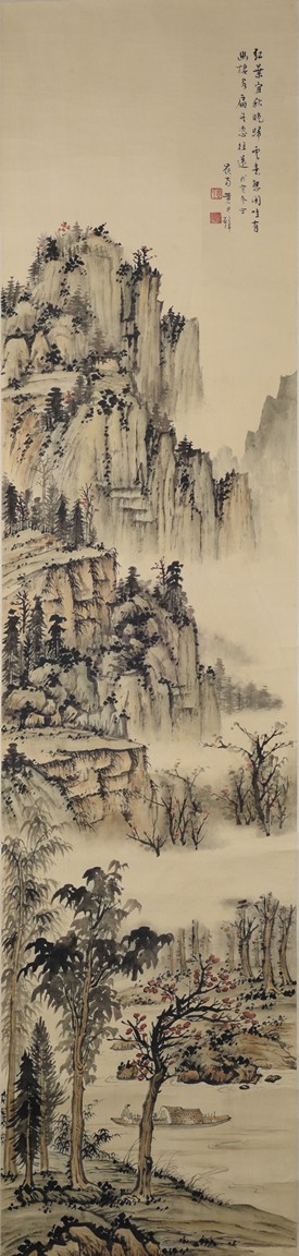 Ink and color on paper. Landscape. Hanging scroll. Inscribed, signed, and with two seals of the artist, dated winter of 1938. Provenance: Property of a private Los Angelese collection. 來源:洛杉磯私人藏家提供