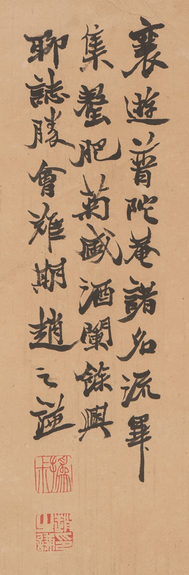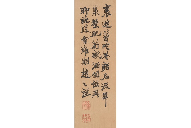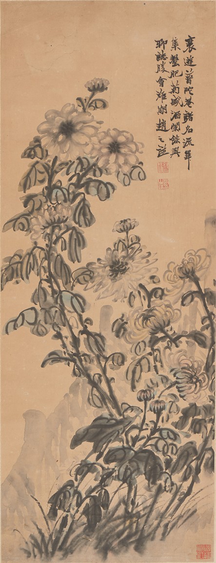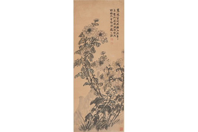 Color and ink on paper. Hanging scroll. Chrysanthemum. Inscribed, signed, and with three seals of the artist.