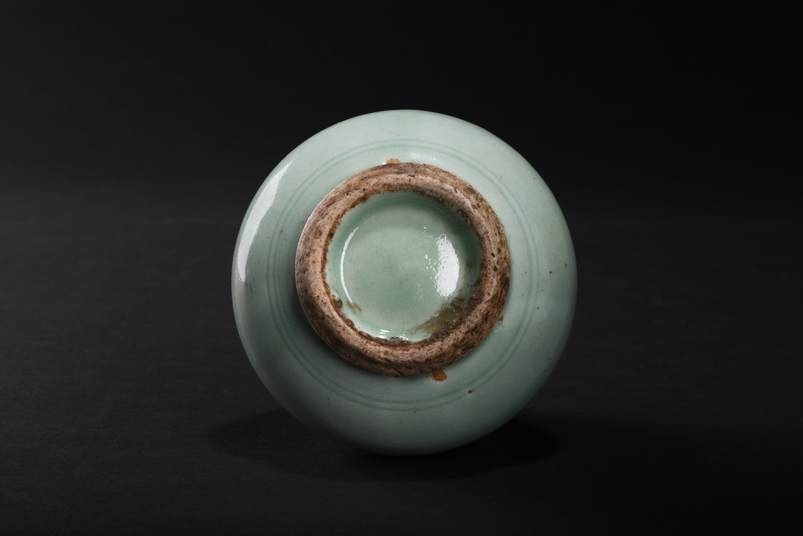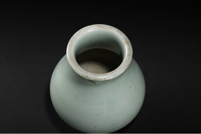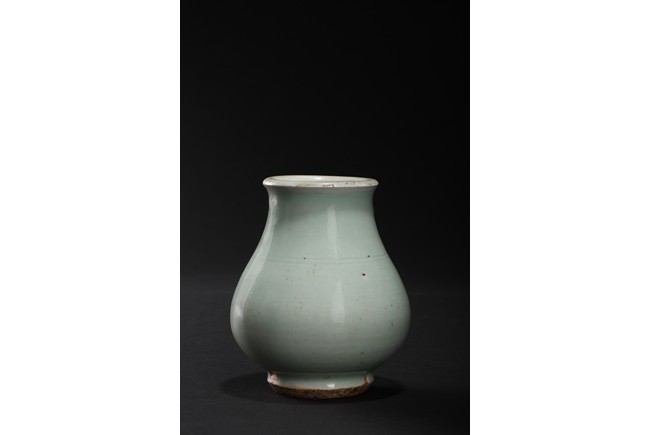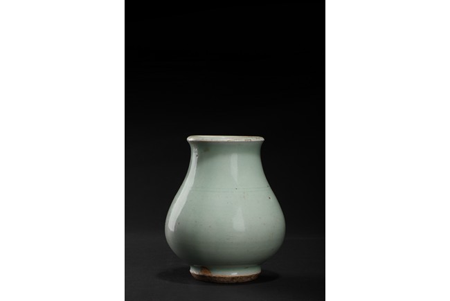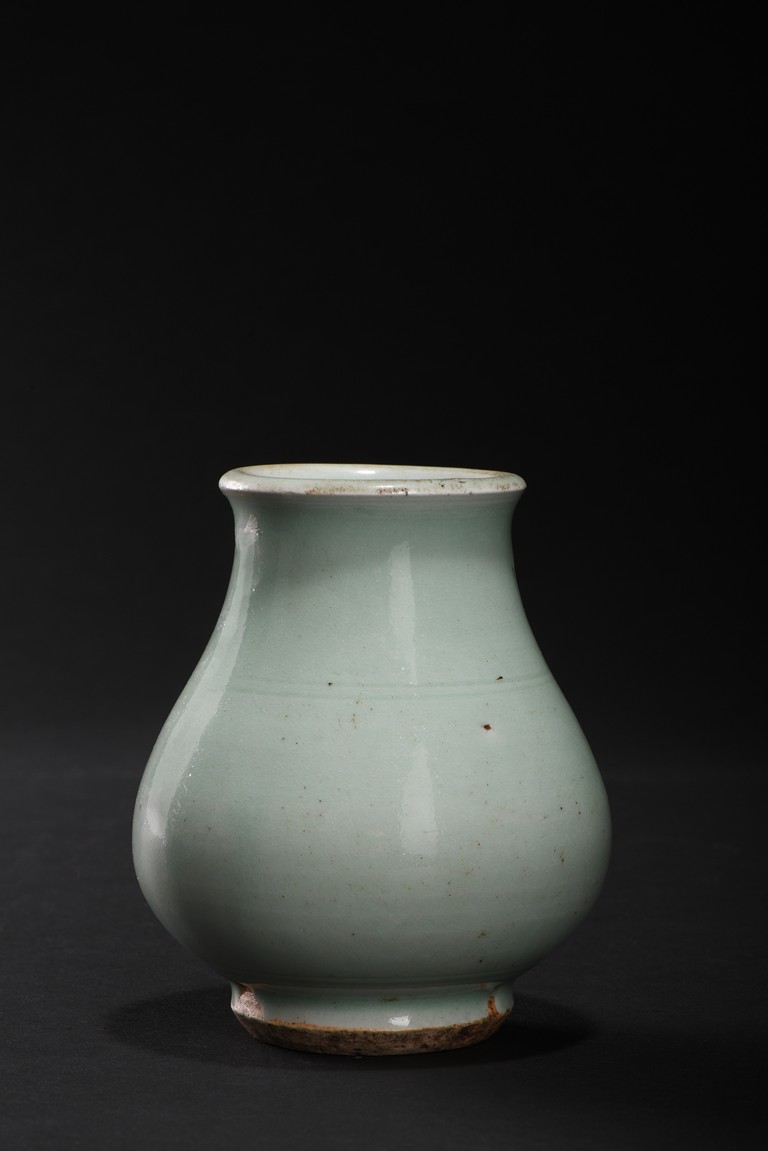 Of compressed pear-shaped body, exterior suffused with celadon green glaze. Qing Dynasty period.