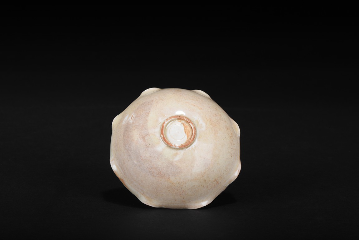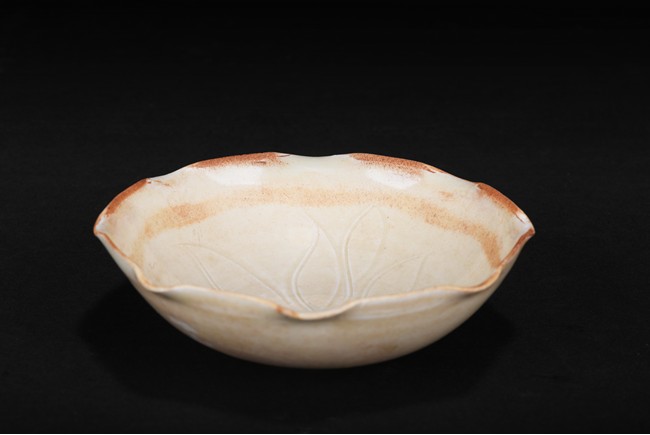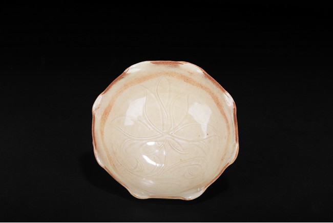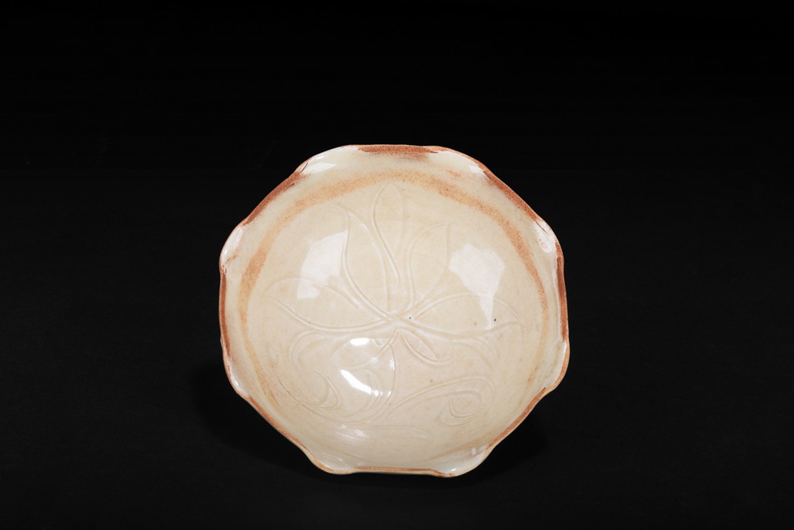 The bowl is of shaped lotus leaf rim, the interior moulded with floral pattern, overall in bone white glaze with russet flecks on the interior of mouth rim. Ming Dynasty period.