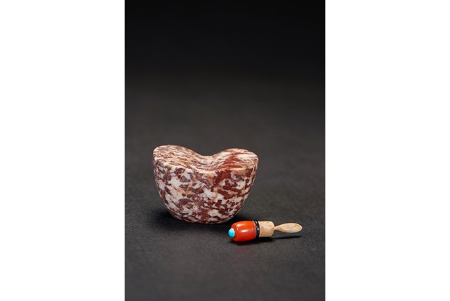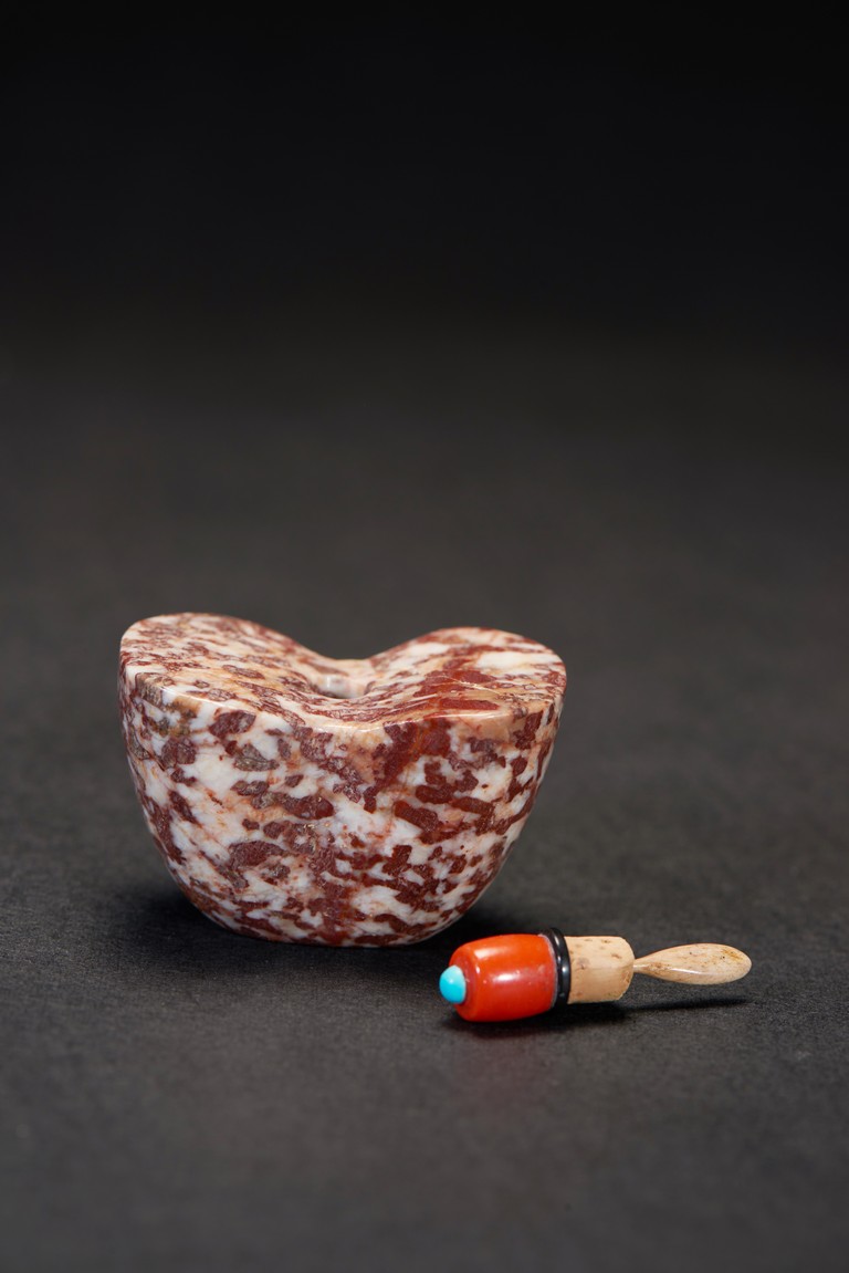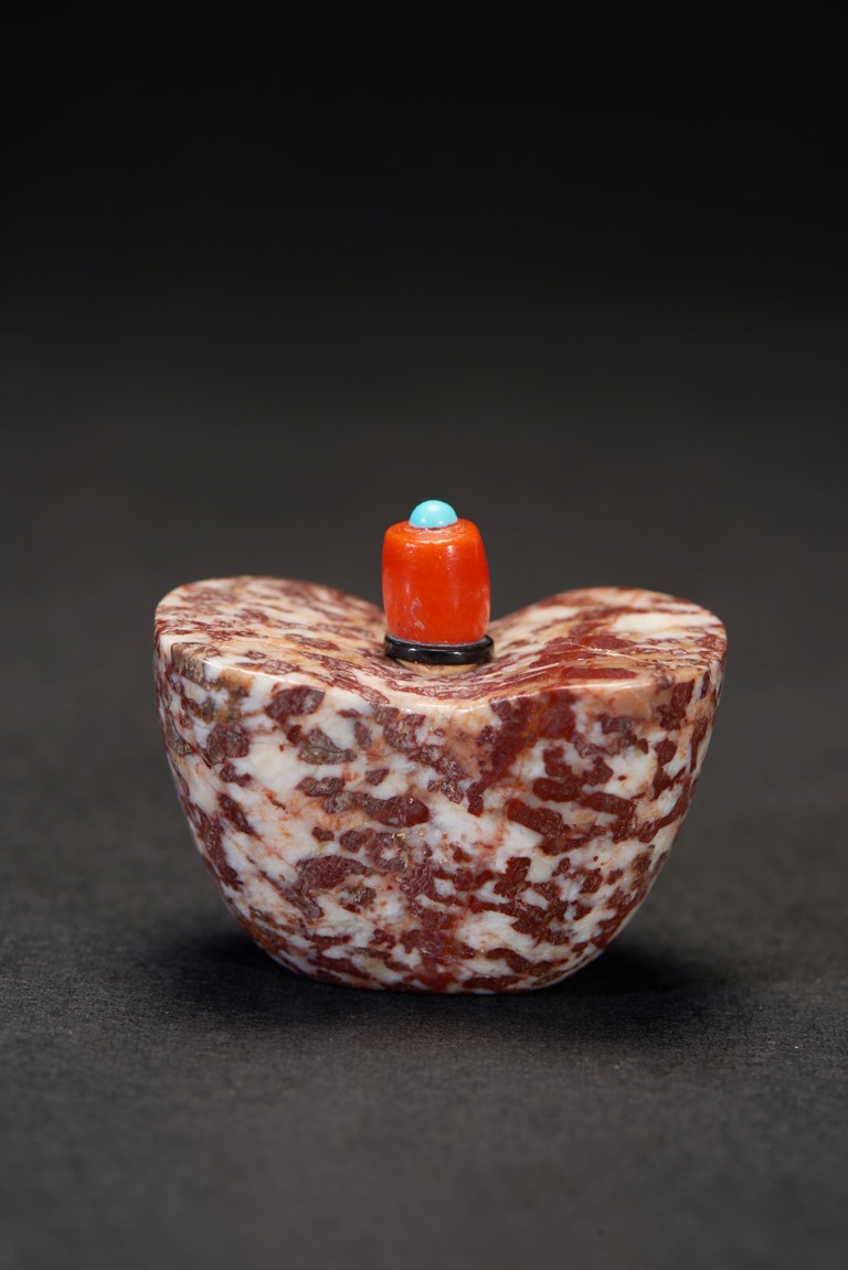Finely modelled in gold ingot form, the snuff bottle is of mixture of white and red heterogeneous stones. Qing Dynasty period.