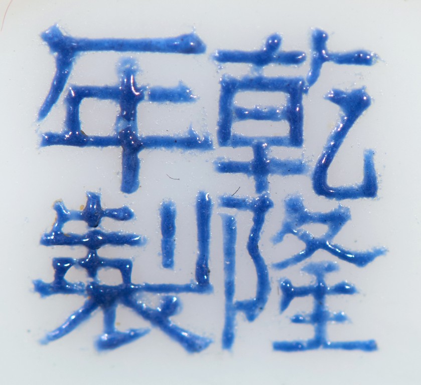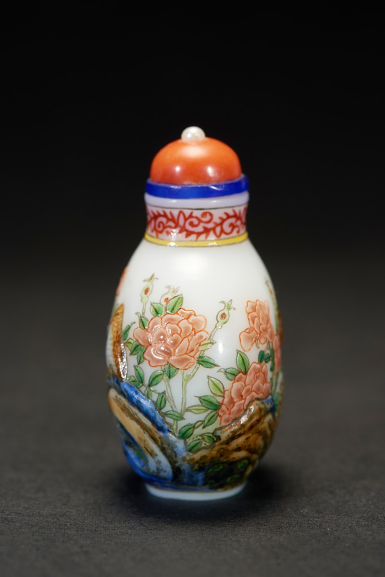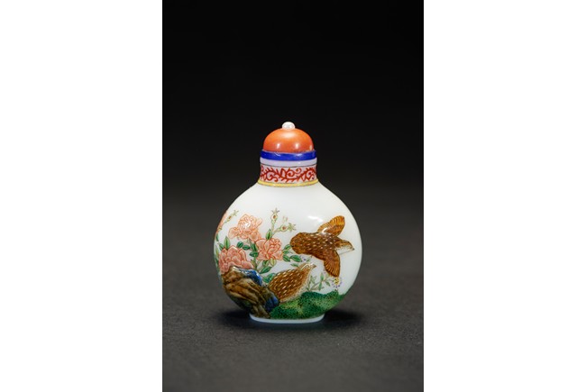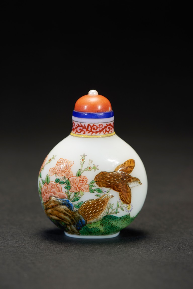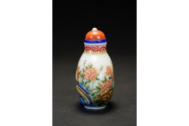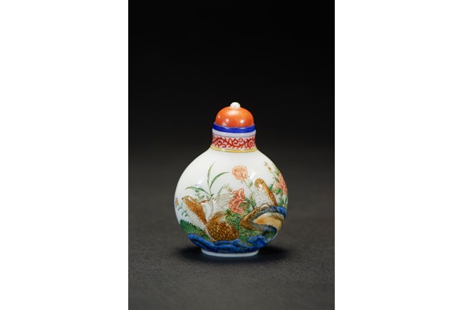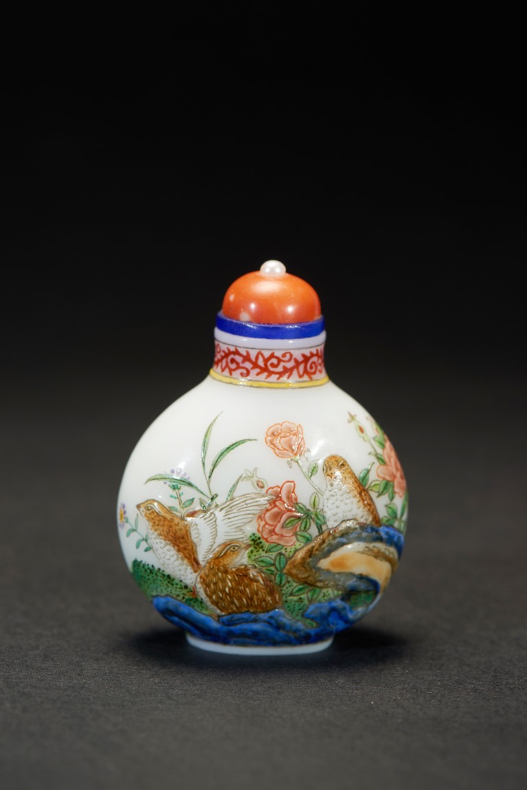 Possibly made by Imperial Palace Workshops, of flattened ovoid form and supported on short oval foot rim, it is elaborately enamelled with continuous scene in relief of birds perching on rocks or in flight amidst flowers, the birds finely detailed with feathers, all in vibrant multi-colors, framed under an scrolled border at the neck, the base with enamelled four-character QIANLONG mark. Qing Dynasty period.