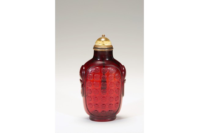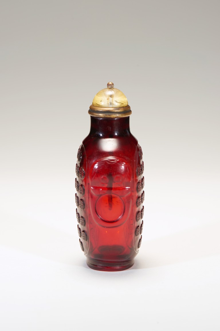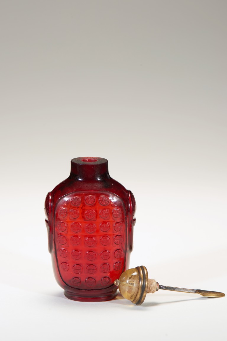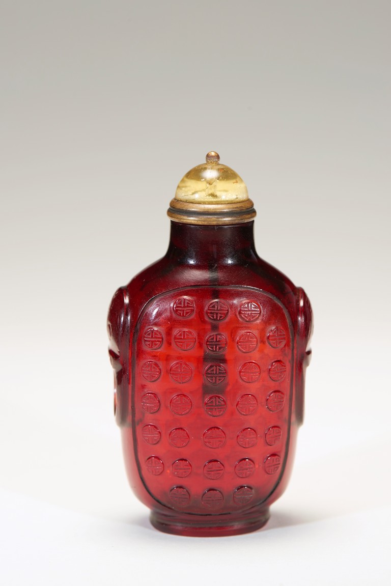 Of elongated rounded rectangular form and raised on oval footrim, both front and reverse with raised wan characters roundels, the sides carved with mythical beast ring handles in relief. Qing Dynasty period.