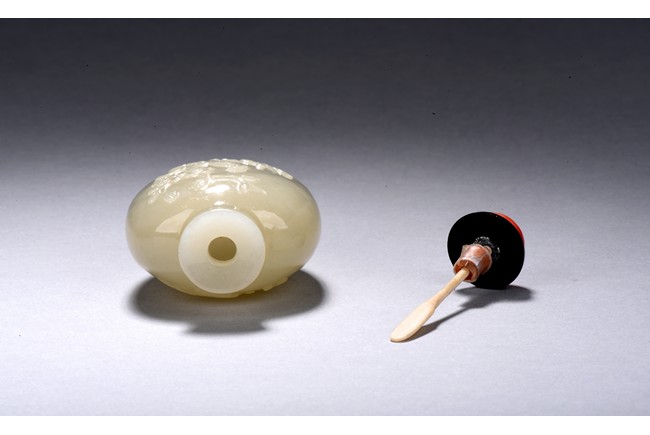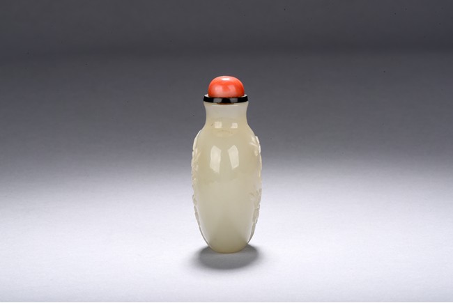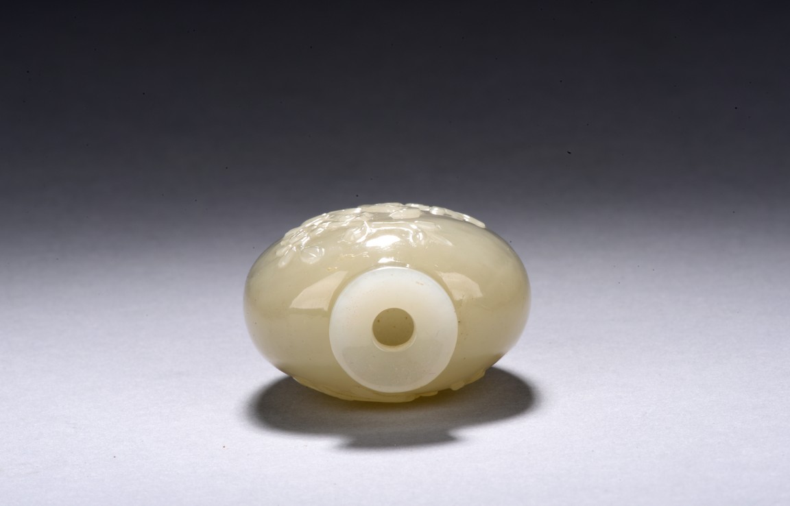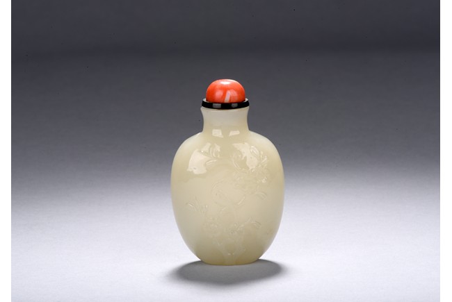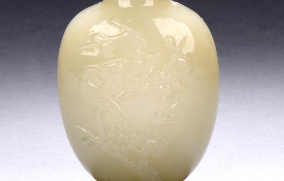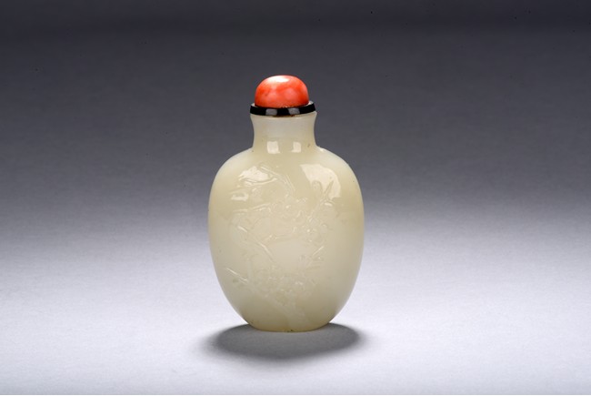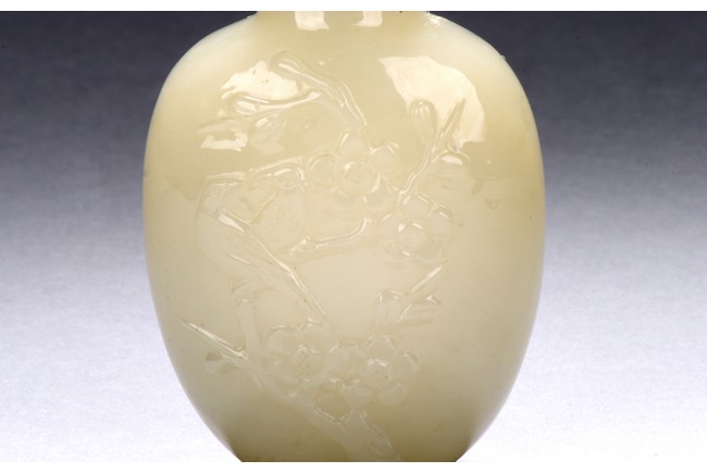 Of oval egg form and the straight neck rising to an flared rim, the bottle is carved in shallow relief with magpie atop plum tree on front body, the reverse carved with two magpies on plum tree. The stone is of translucent even white tone. Qing Dynasty period.