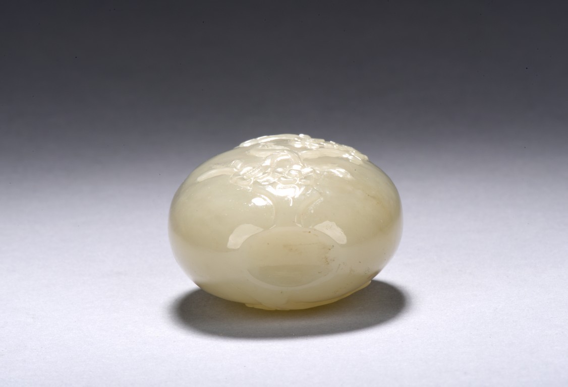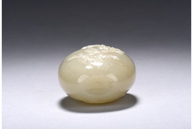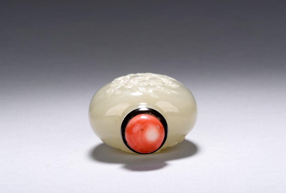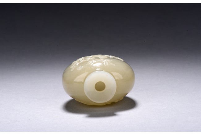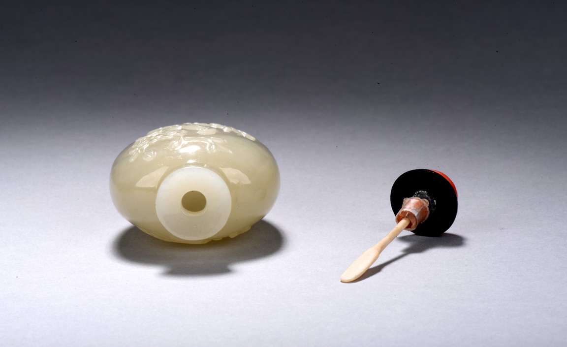 Of oval egg form and the straight neck rising to an flared rim, the bottle is carved in shallow relief with magpie atop plum tree on front body, the reverse carved with two magpies on plum tree. The stone is of translucent even white tone. Qing Dynasty period.