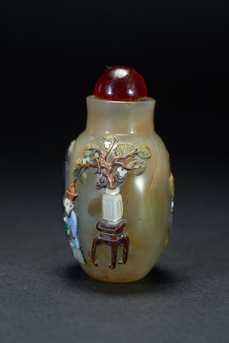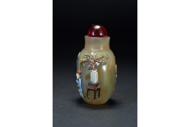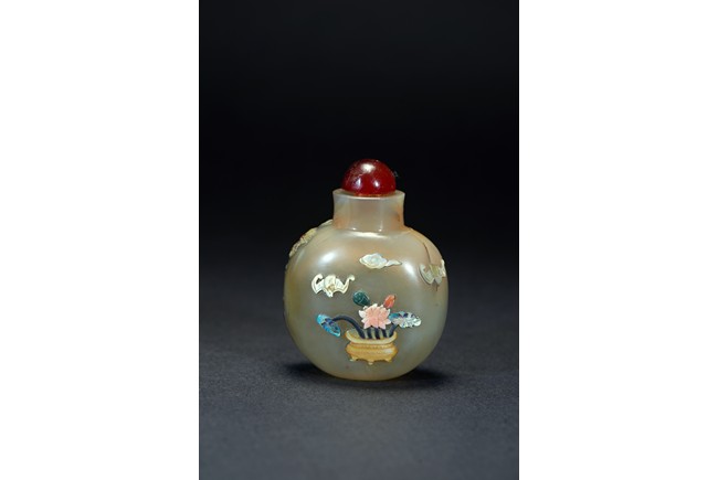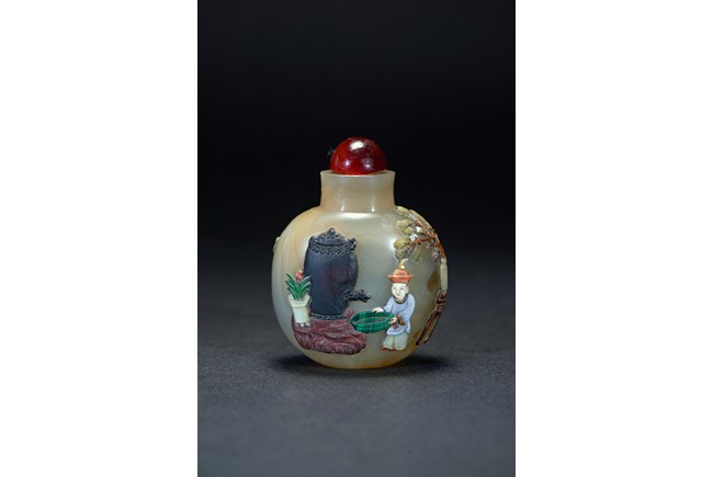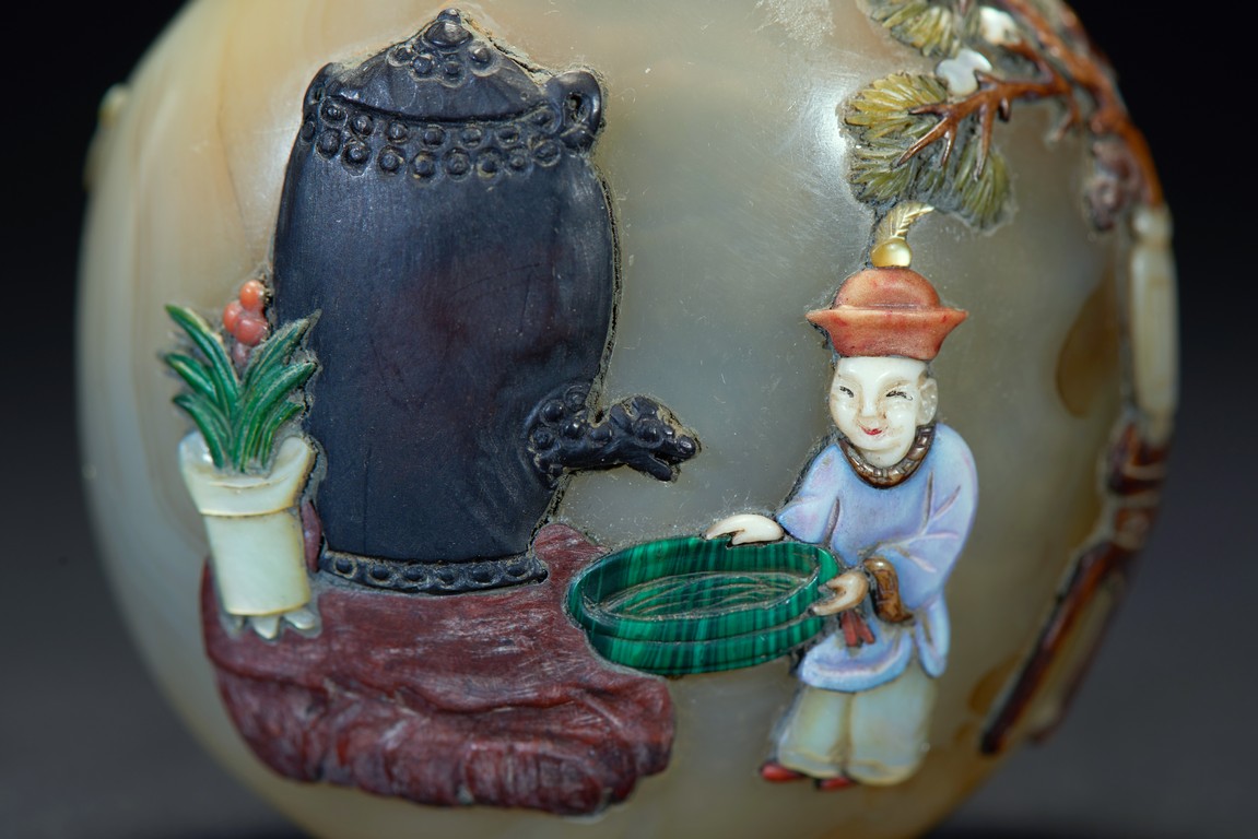 Of flattened rounded from, the stone of pale grey color with darker inclusions, embellished in white jade, mother-of-pearl, spinach jade, agate, hardstones, malachite on both sides depicting an continuous scene of an boy holding an washbasin next to an large water container in an garden setting, with flowers vase and auspicious bats in flight. Qing Dynasty period.