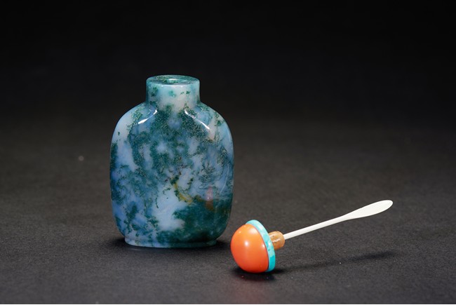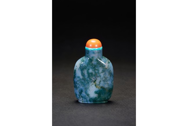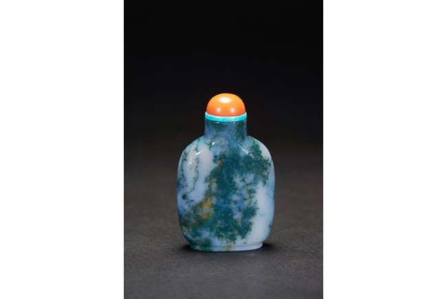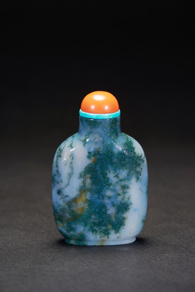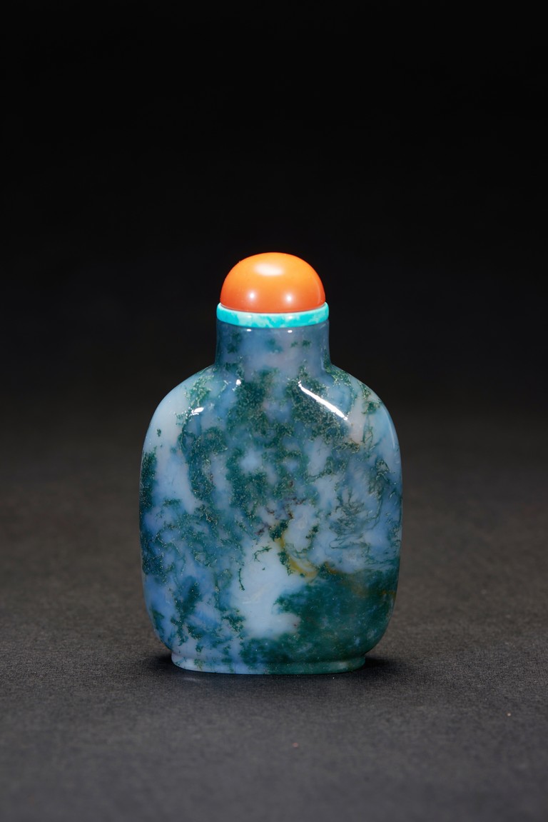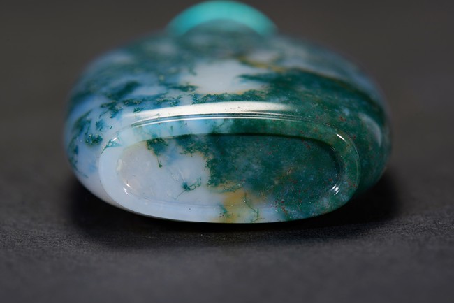 Of rounded rectangular form and well-hollowed, standing on an oval footrim,the stone is suffused with dense, deep green, moss-like inclusions. Qing Dynasty period.