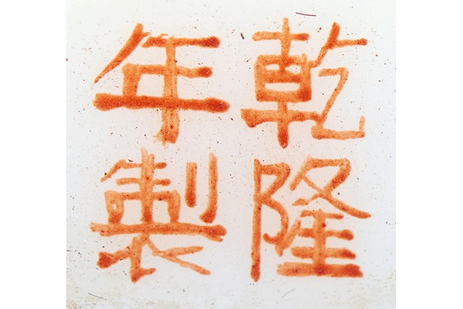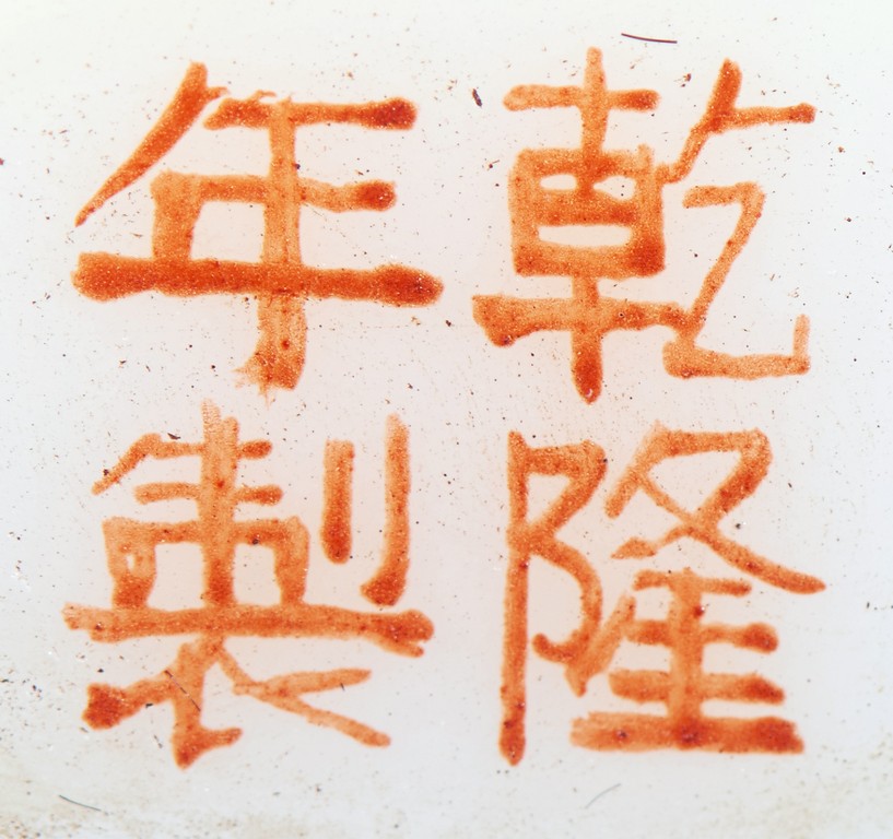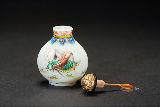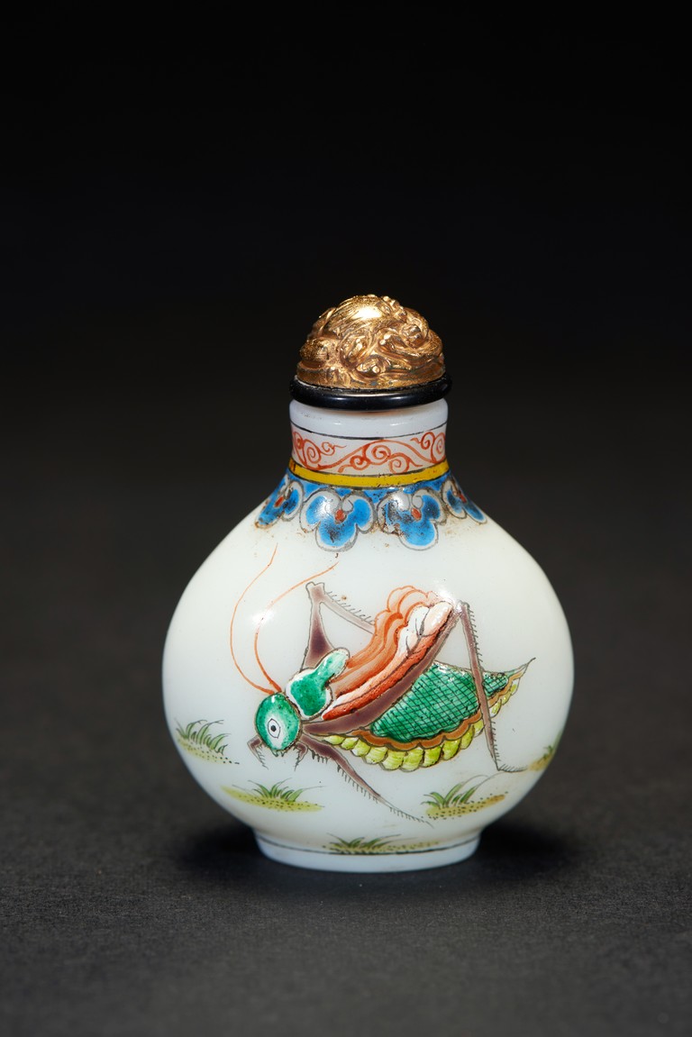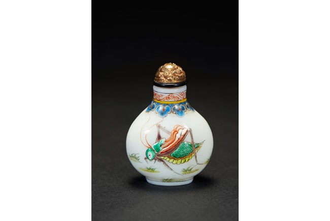 Of slight pear-shape and rounded from, the body enamelled with raised katydid decorations in multi-color, the neck decorated with an band of ruyi lappets. The base with four character 'QIANLONG' mark. Qing Dynasty period.