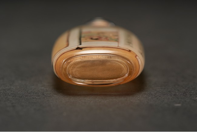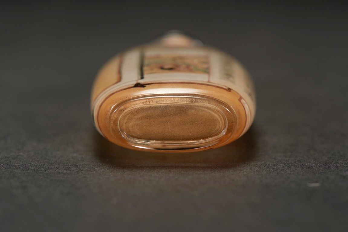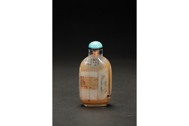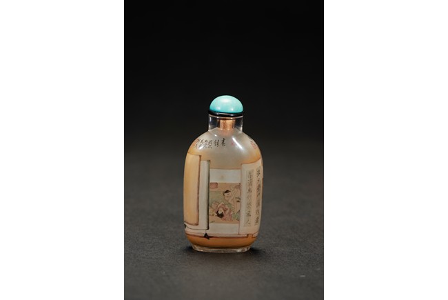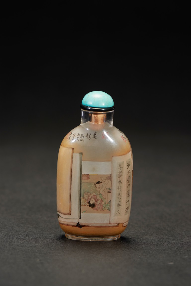 Glass, ink, and watercolor, painted with an continuous scene of books with erotic subjects and inscriptions around the shoulder, fitted with an domed turquoise stopper. Qing Dynasty period.