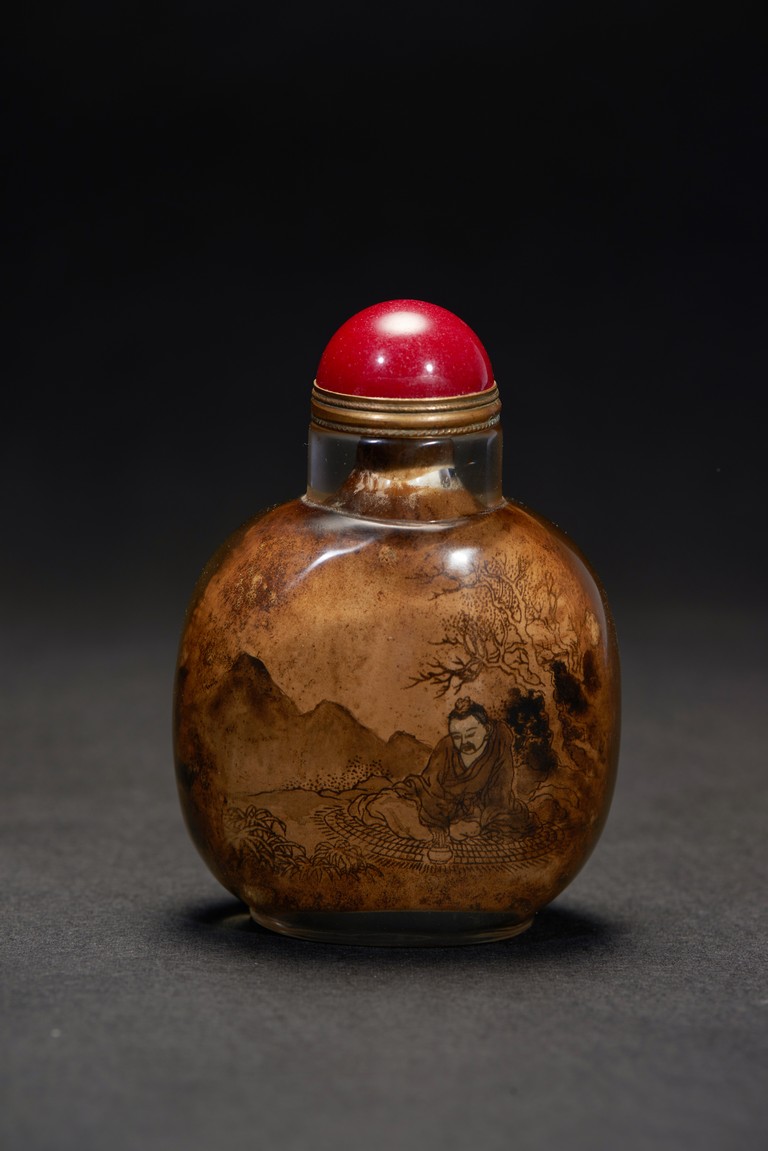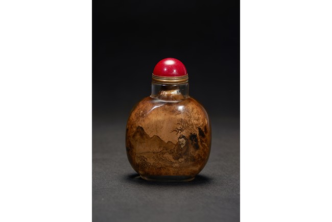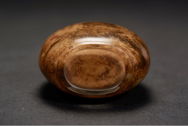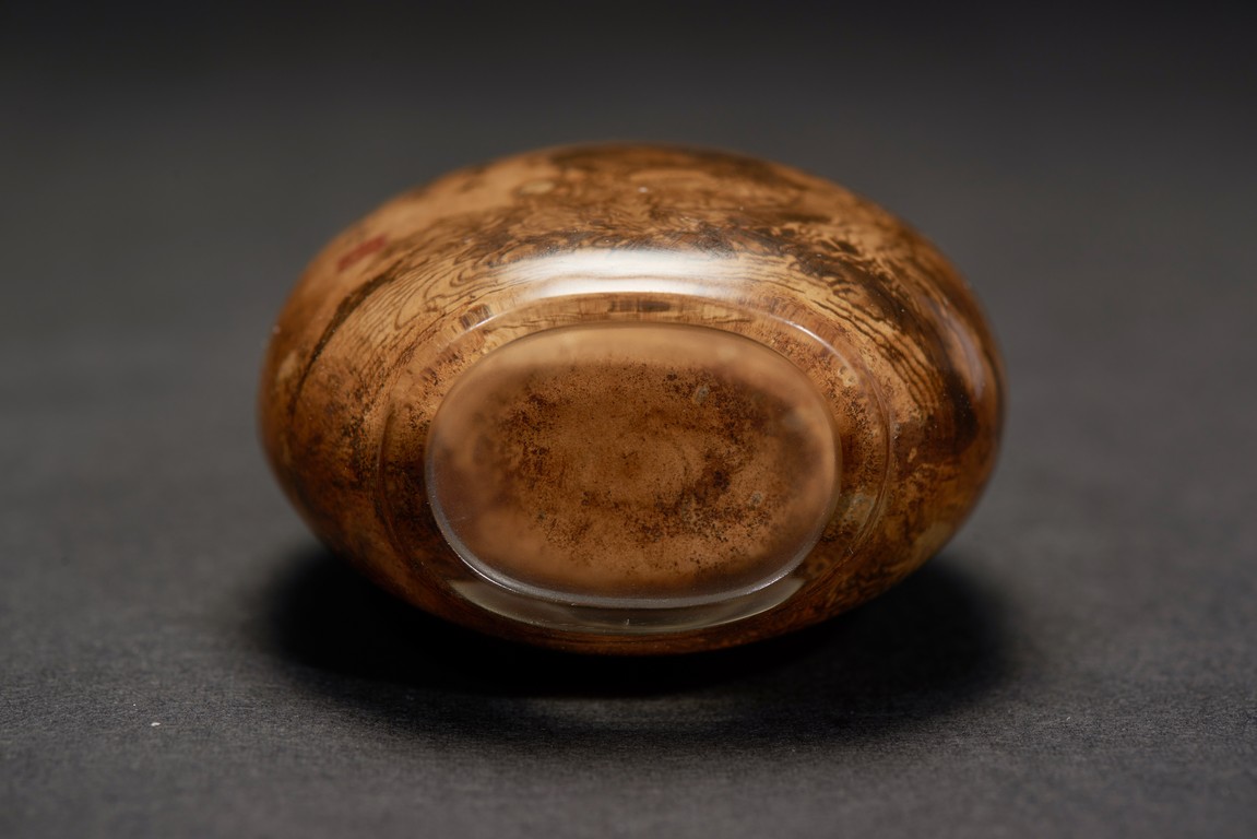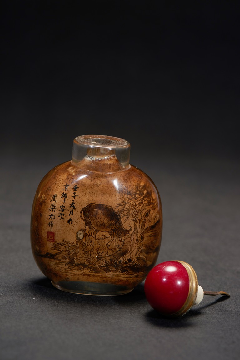 Of globular from, the snuff bottle inside painted with an elderly man and buffalo on riverbank to one side, the other side with an gentleman sitting below an tall tree, the inscription attributed to Zhou Le Yuan. Republic period.