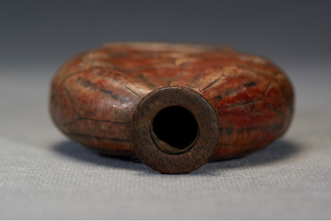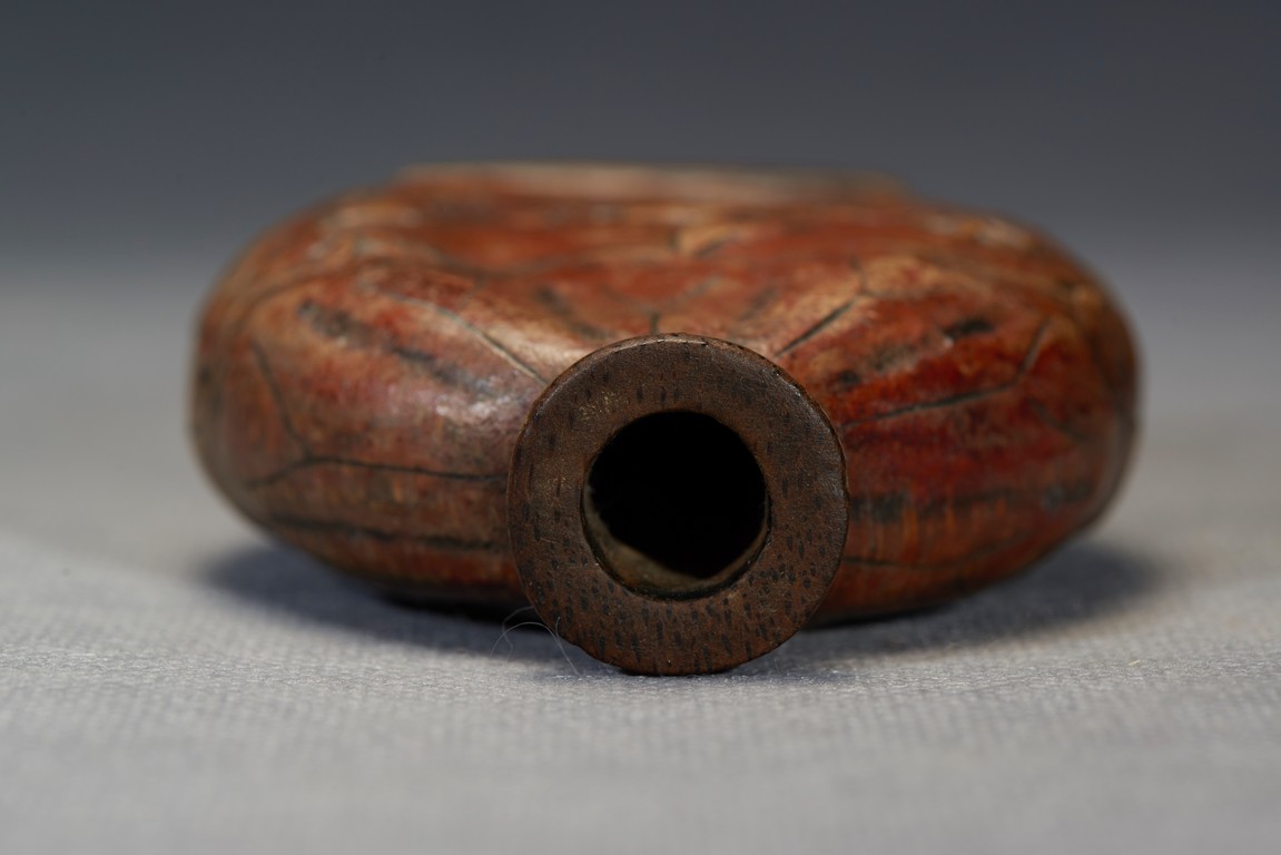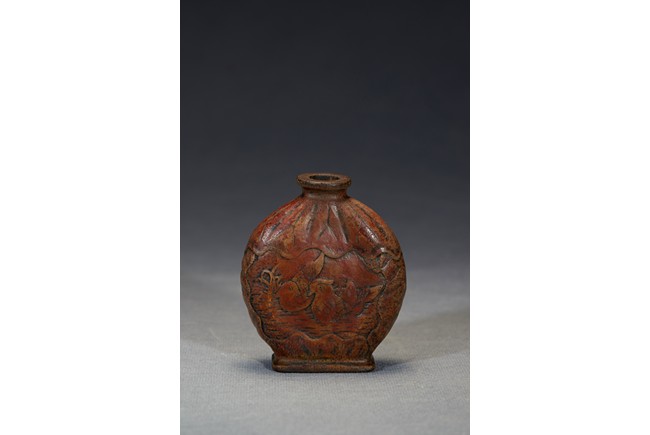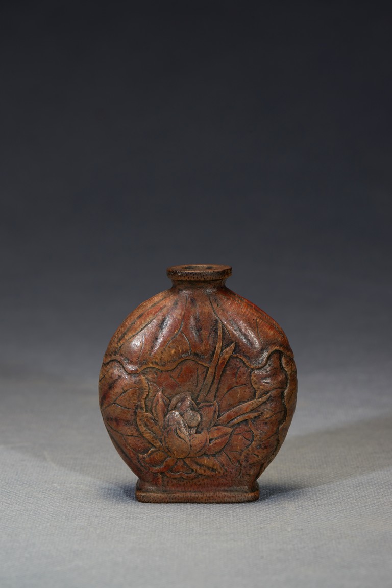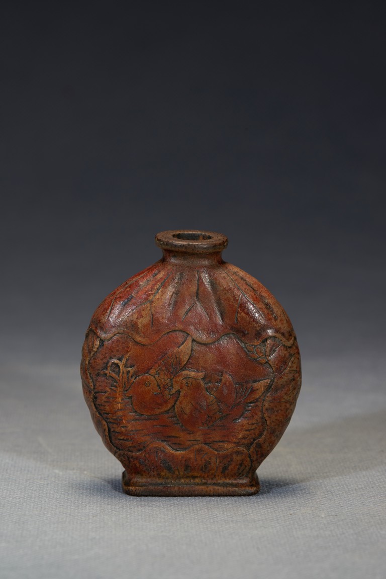 Of flattened rounded form rising from rectangular foot ring, the front finely carved an pair of mandarin ducks swimming in the pond, the reverse curved an large blossom lotus flower in the middle. The base with character mark. Dynasty period.