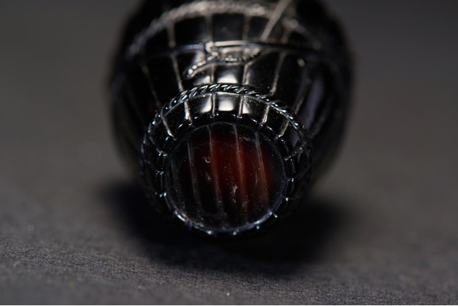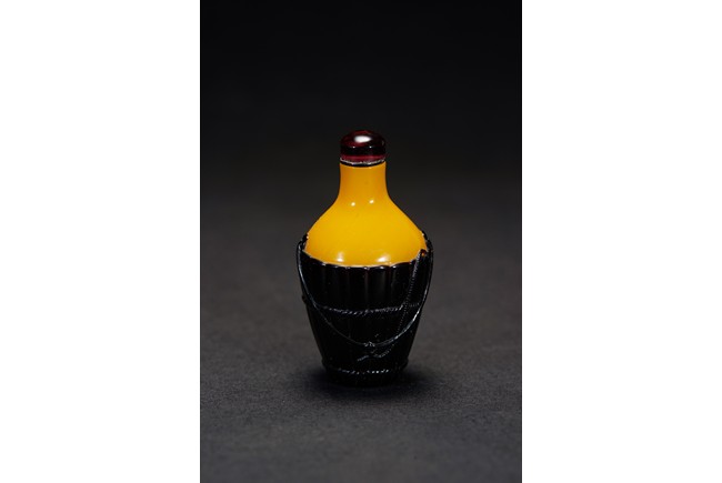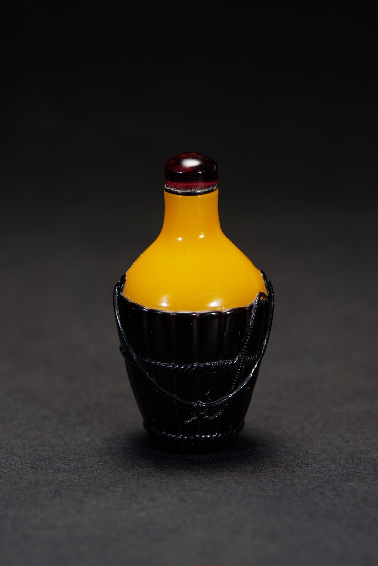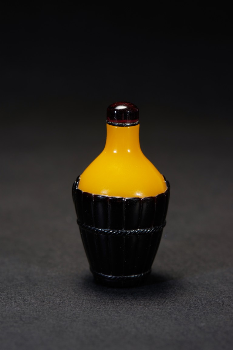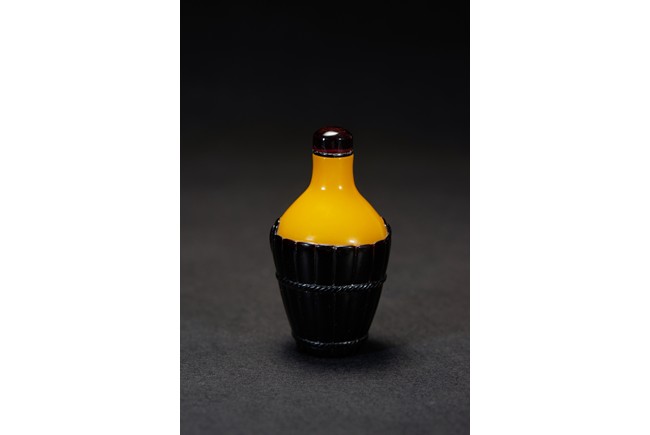Of pear-shape, it is carved through the black overlay to the yellow peking glass. The black glass exterior modelled in the form of wood bucket. Qing Dynasty period.