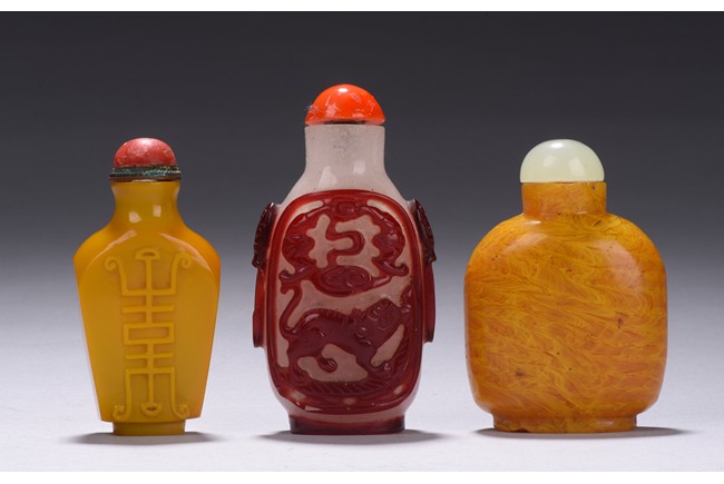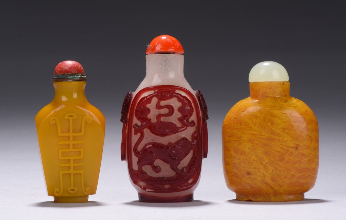 Comprising of two yellow glass snuff bottle: one is of flattened rounded form and of opaque swirls of yellow glaze, the other is cast with an stylize character on front and back sides reserved on yellow grounds with an red gem stopper; and an ovoid red overlay white glass snuff bottle carved with stylized dragon motif. Qing Dynasty period.