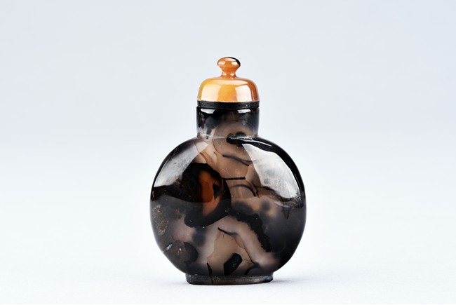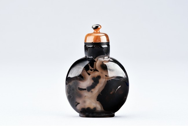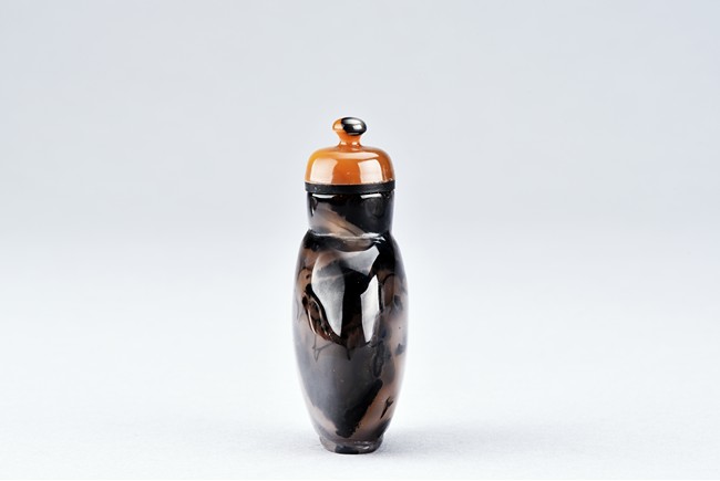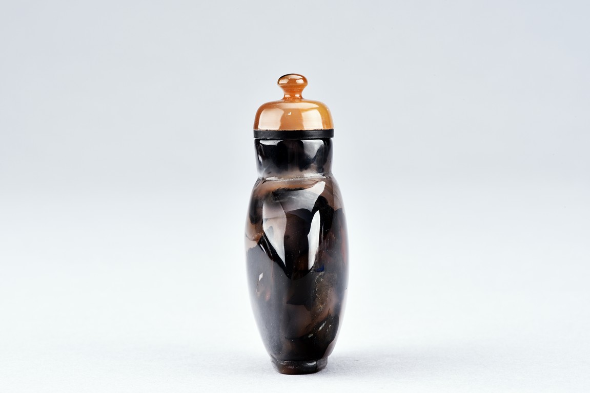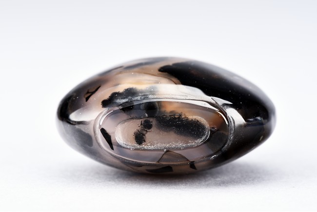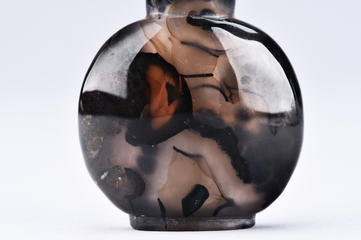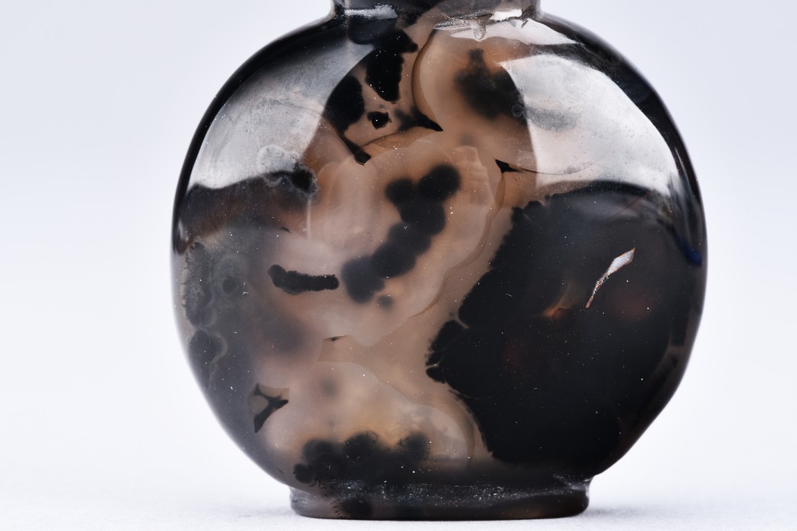 Of rounded body and cylindrical neck, the well hollowed body is supported on ovoid foot base, the stone is of translucent matrix displaying black and brown patches. Republic period.