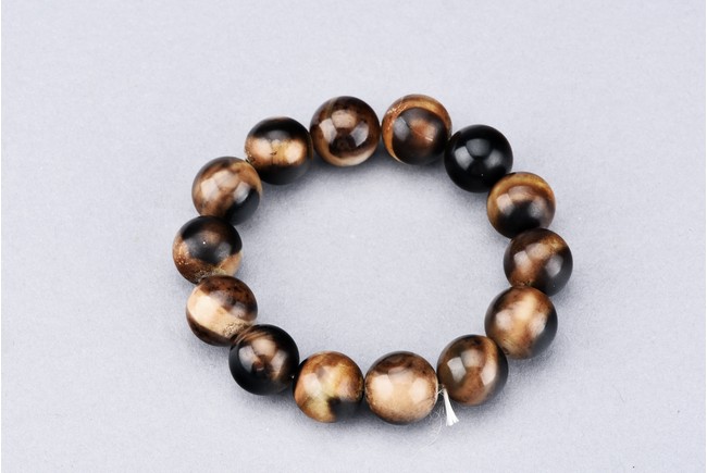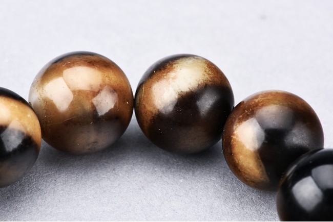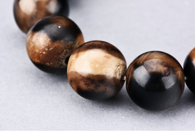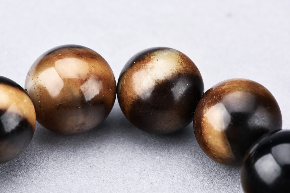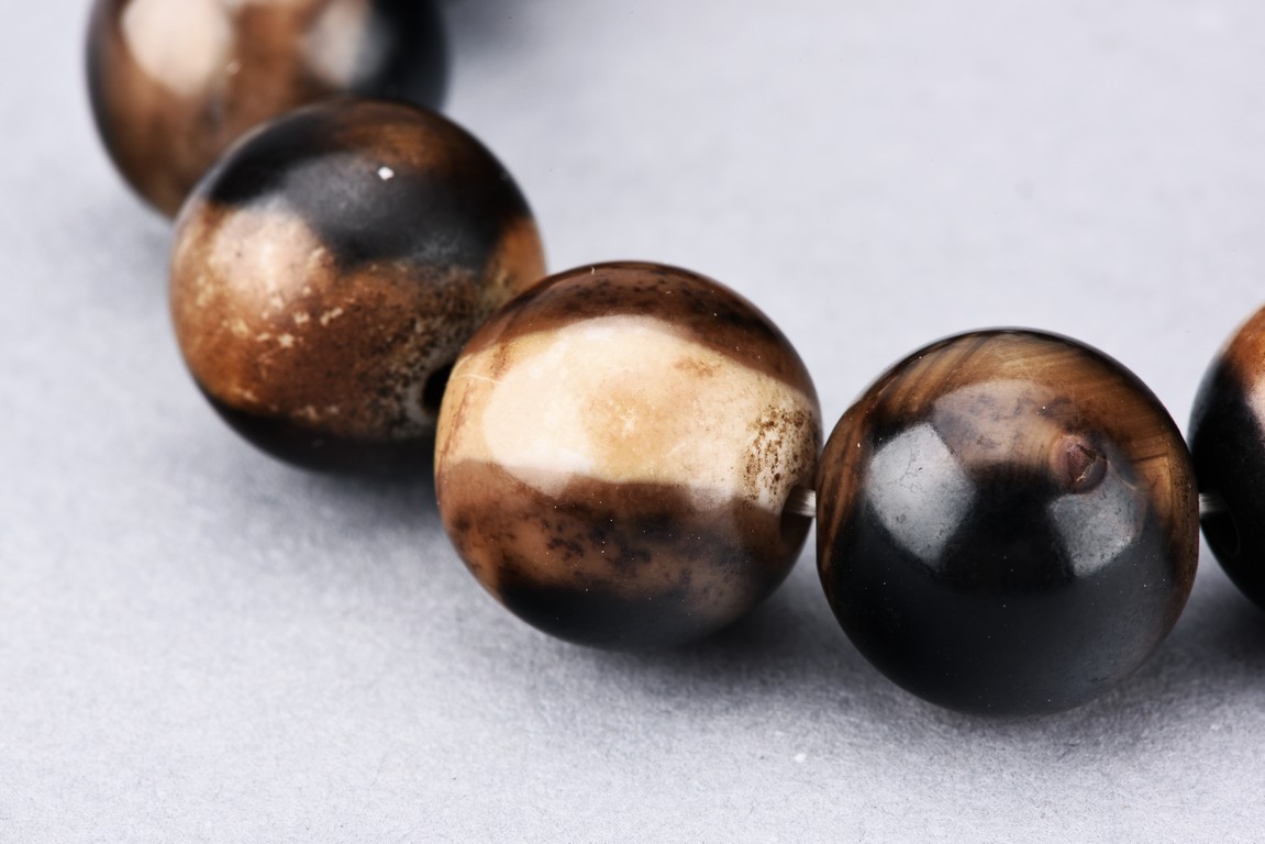 Consisting of fourteen Xianzhu beads, each is of irregular black and white pattern. Qing Dynasty period.