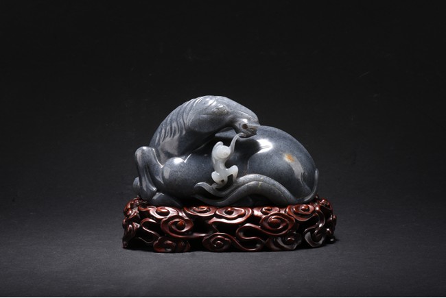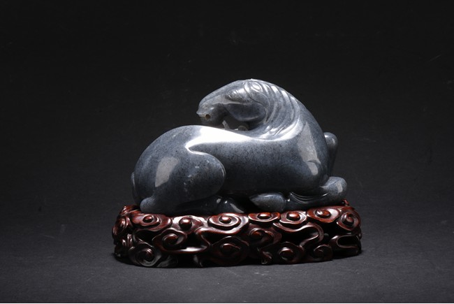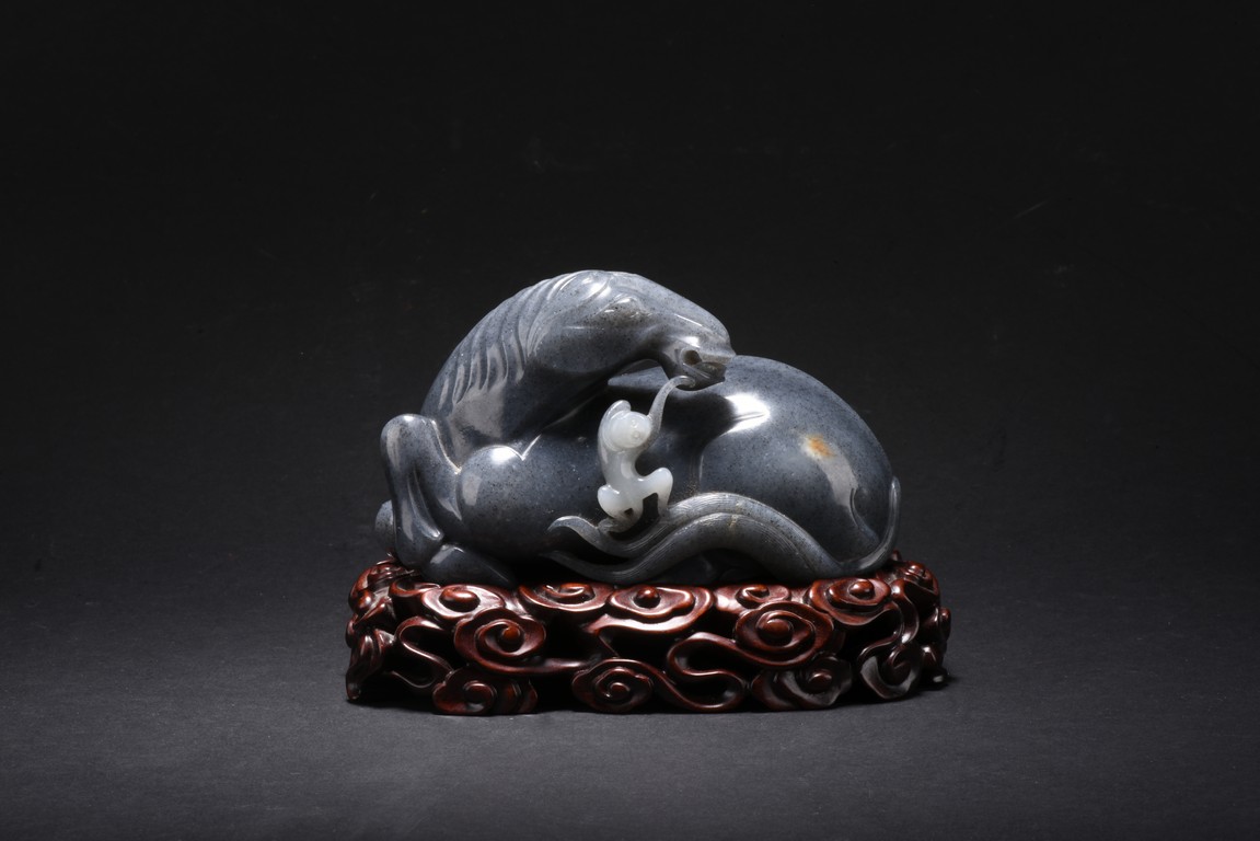 Finely carved as an recumbent horse turning its head backward, with front hoofs, tail and mane finely detailed with incised lines, an naughty monkey standing on long tail and clambering on its body, with head turning to the side, all fitted on wooden stand with scroll clouds design. Qing Dynasty period.