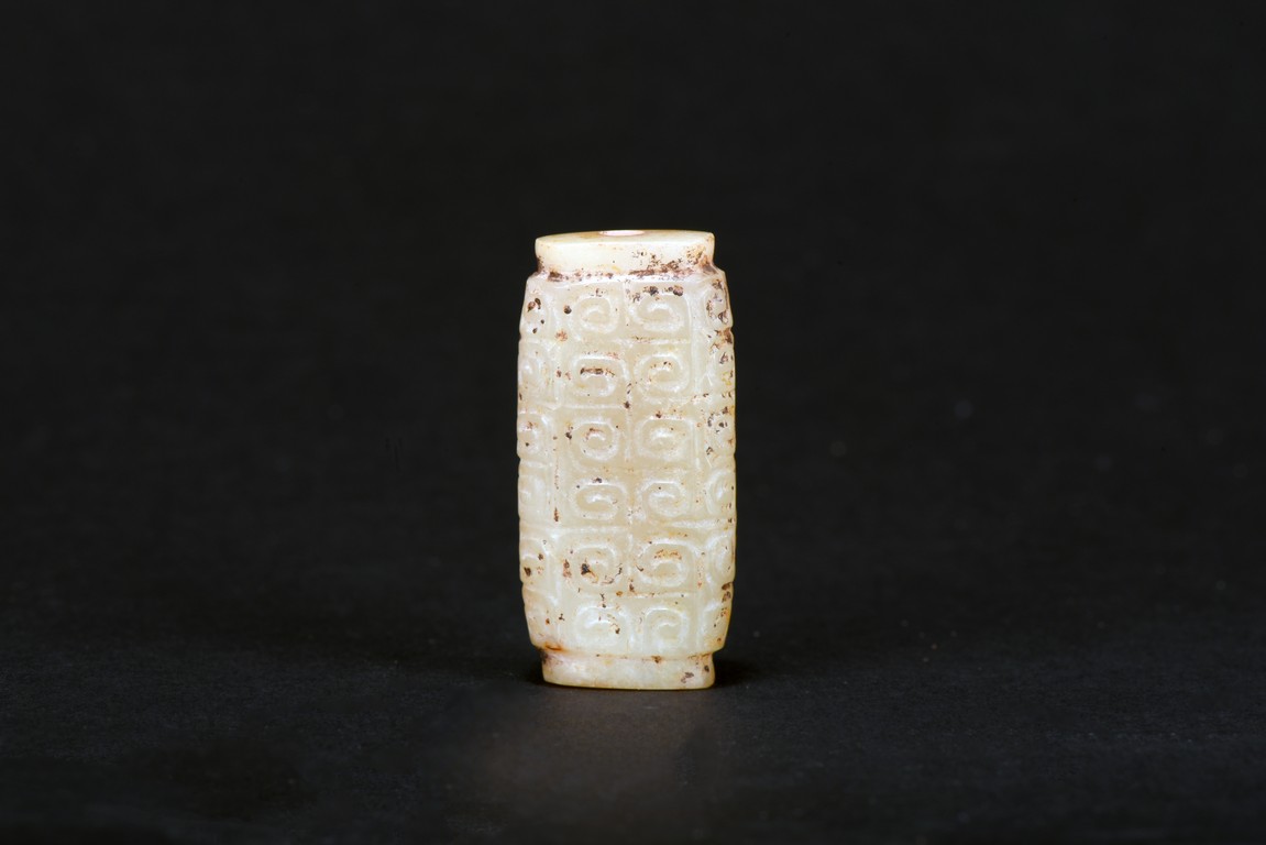 Modelled in the form of archaic vessel cong, the flattened small pendant is carved to the exterior with repeated cloud pattern. Spring Autumn period.