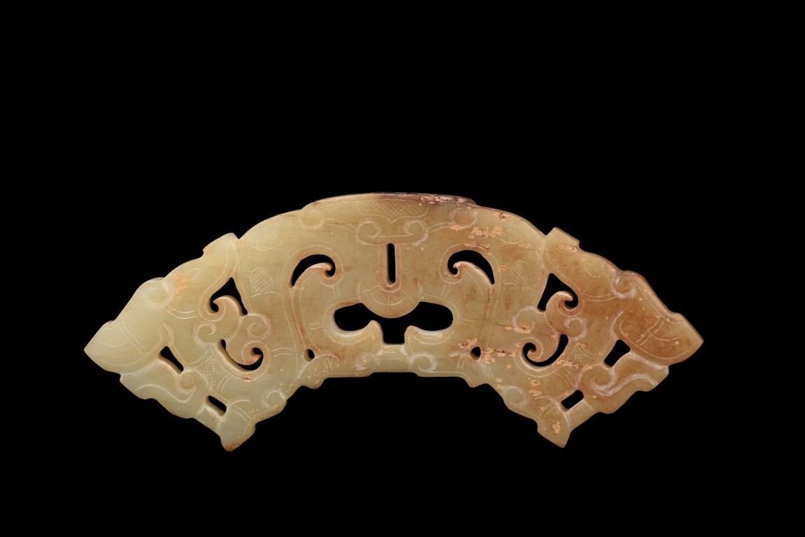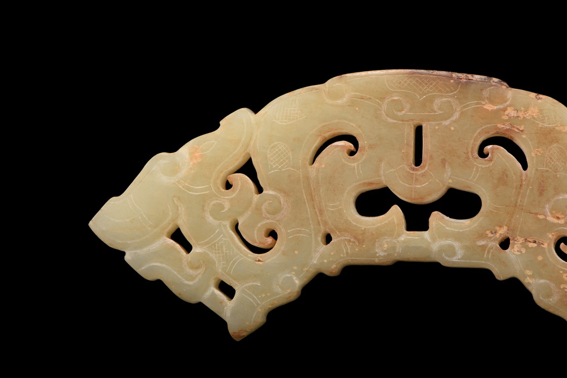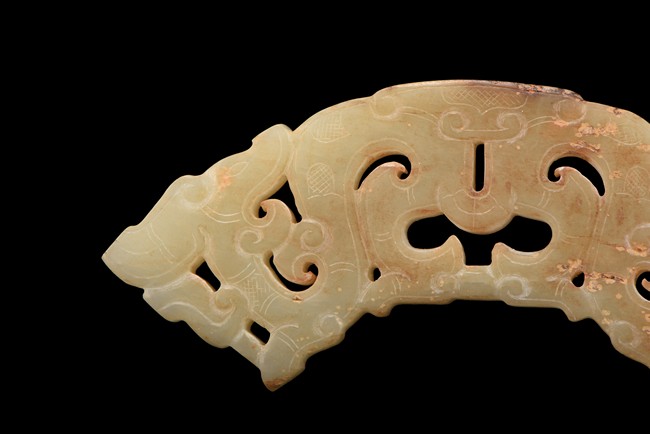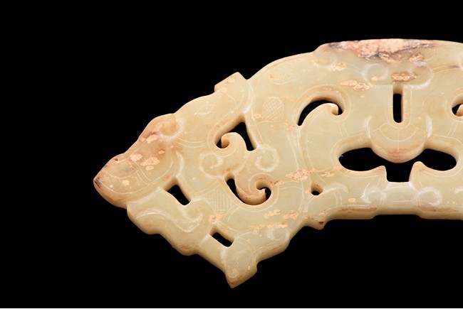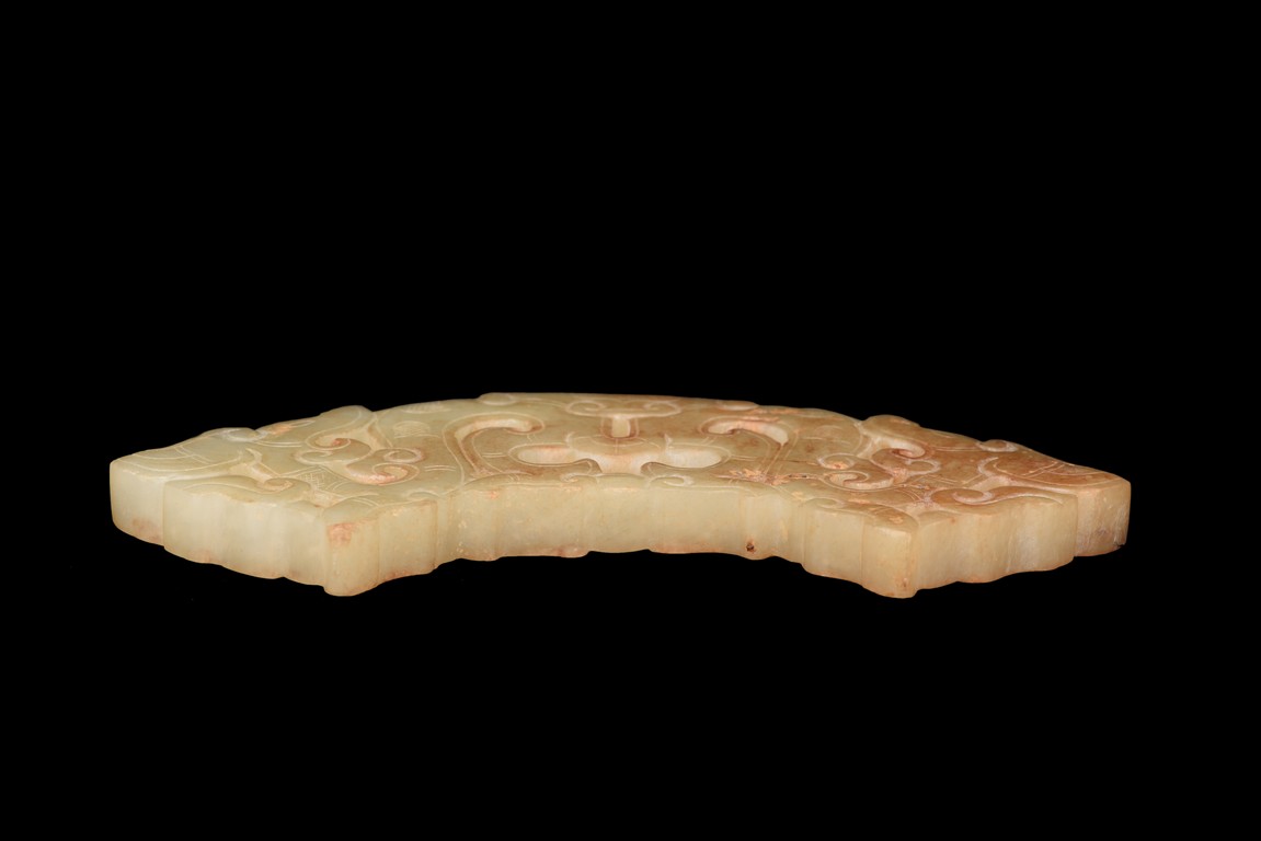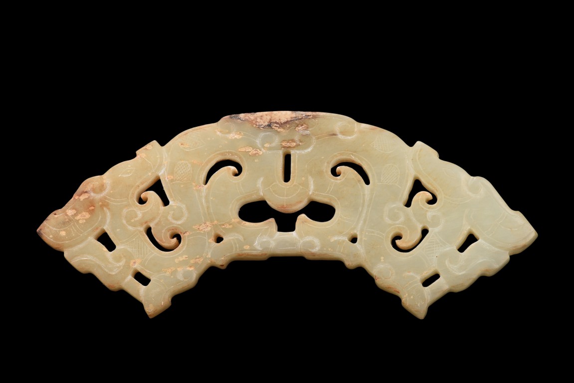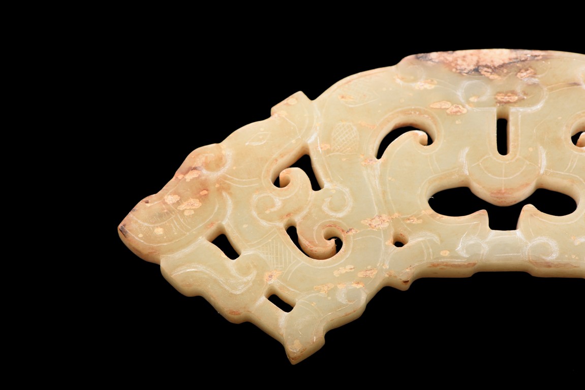The jade huang carved with an openwork design of two stylized dragons with head back turned and linked by tails, the stone an translucent pale tone with russet inclusion. Warring state period.