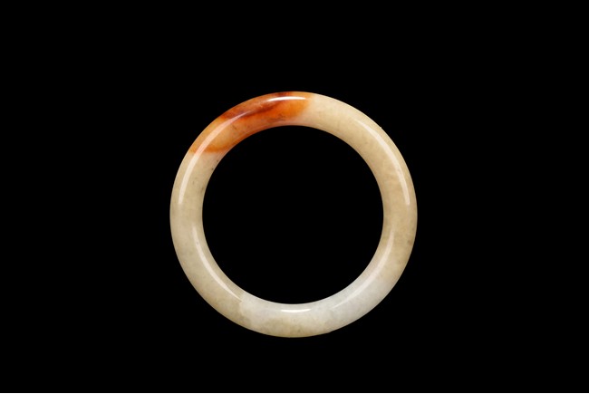 an circular jade bangles, the smoothly polished stone of an translucent yellowish-white stone with patches of carnelian inclusion.