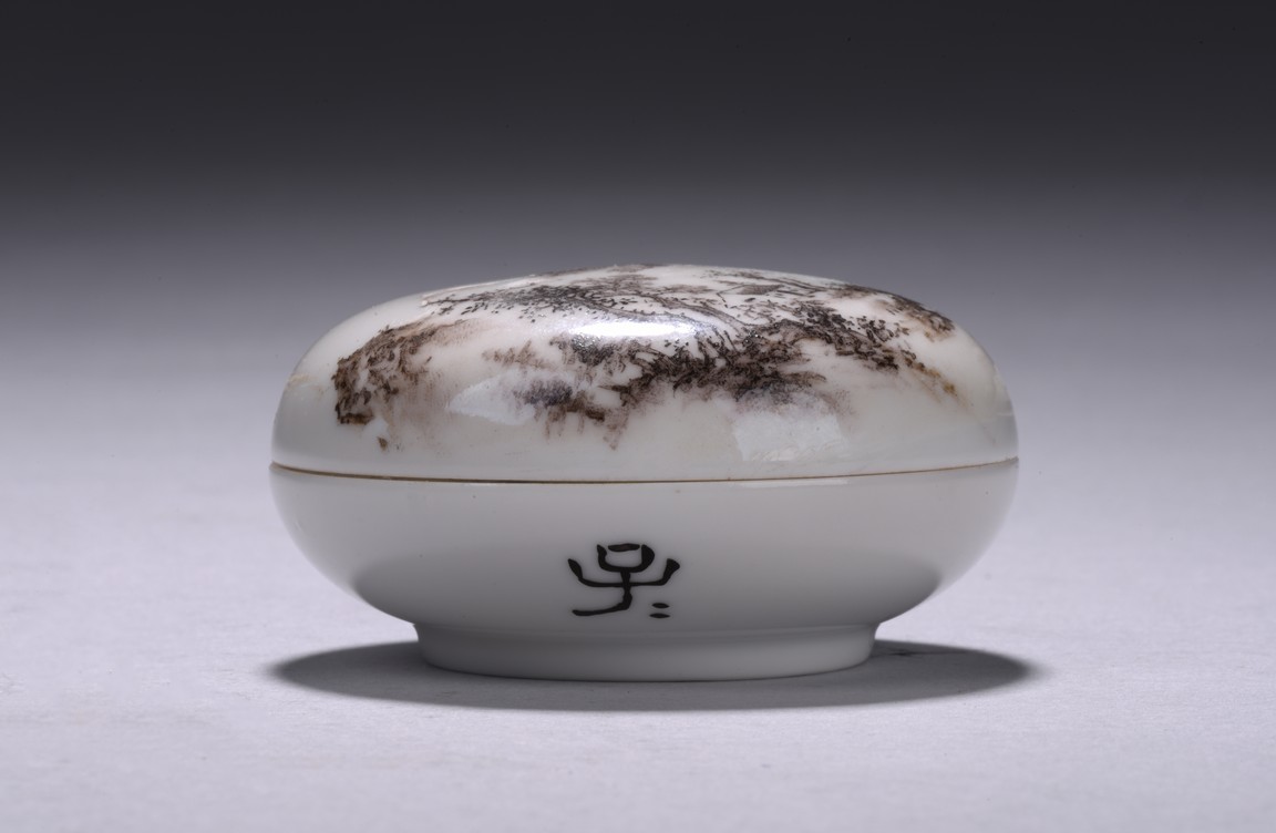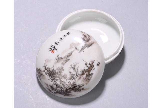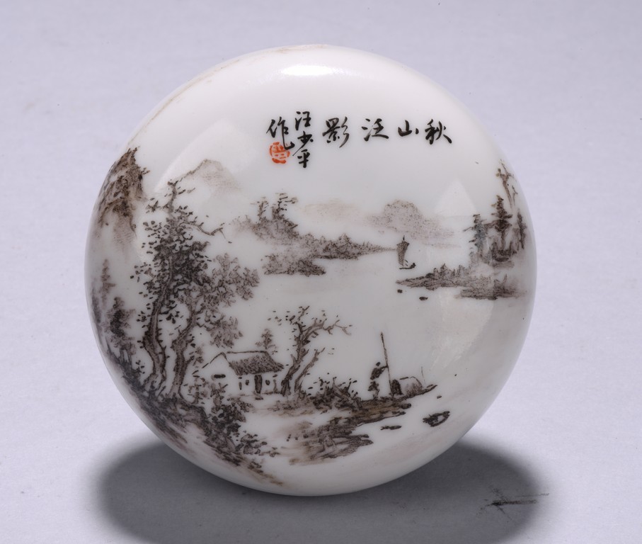 Raised on short circular foot, the cover with inscription and signature Wang Shao Ping, finely enamelled with mountain and lake scenes in the background, the left corner painted with building underneath tall trees on riverbank, the side painted with four character. 20th century.